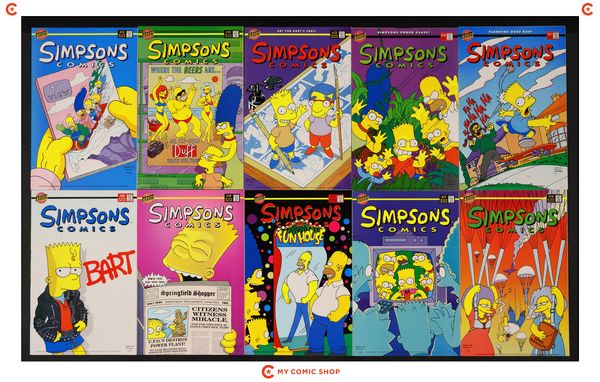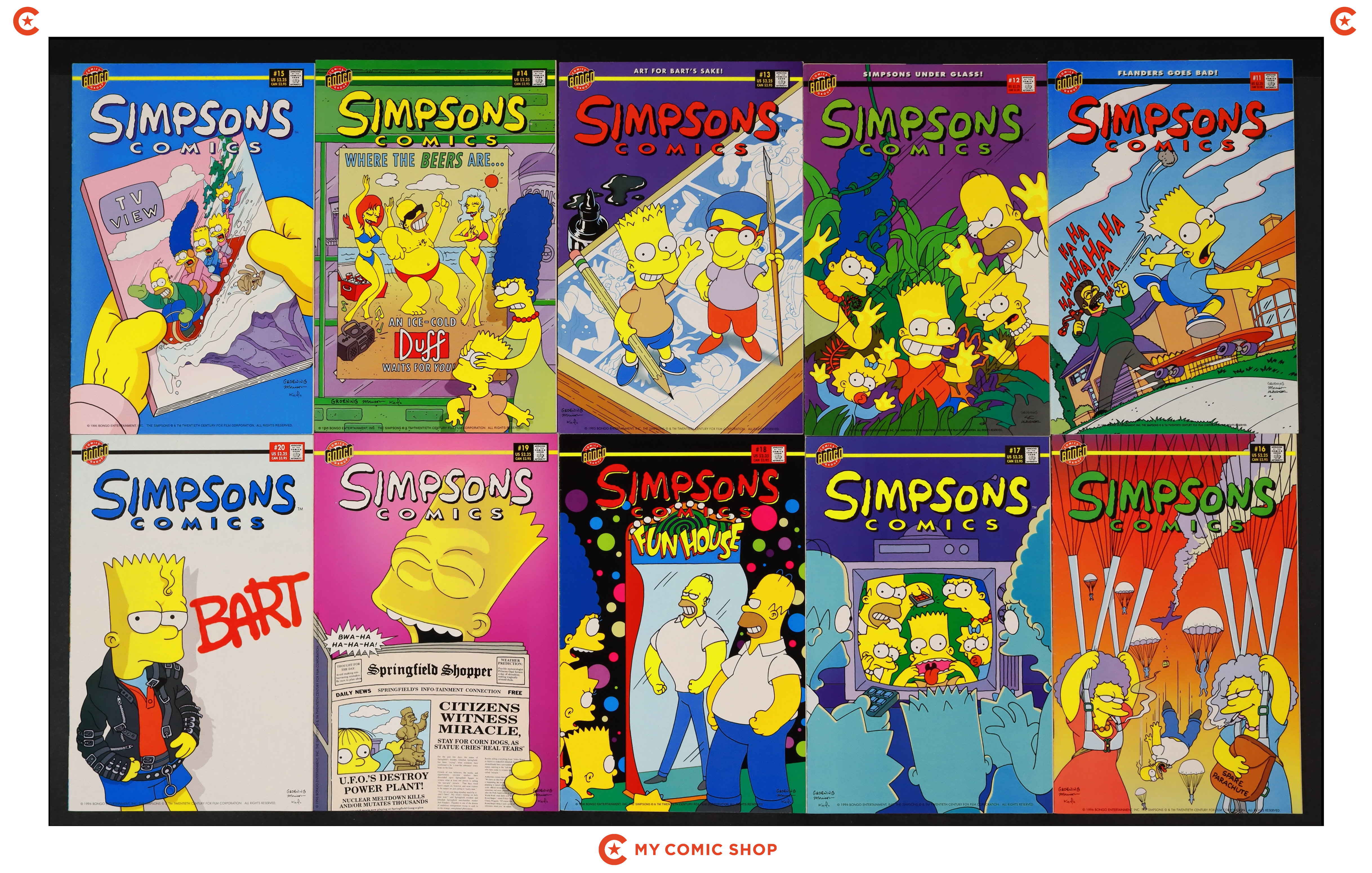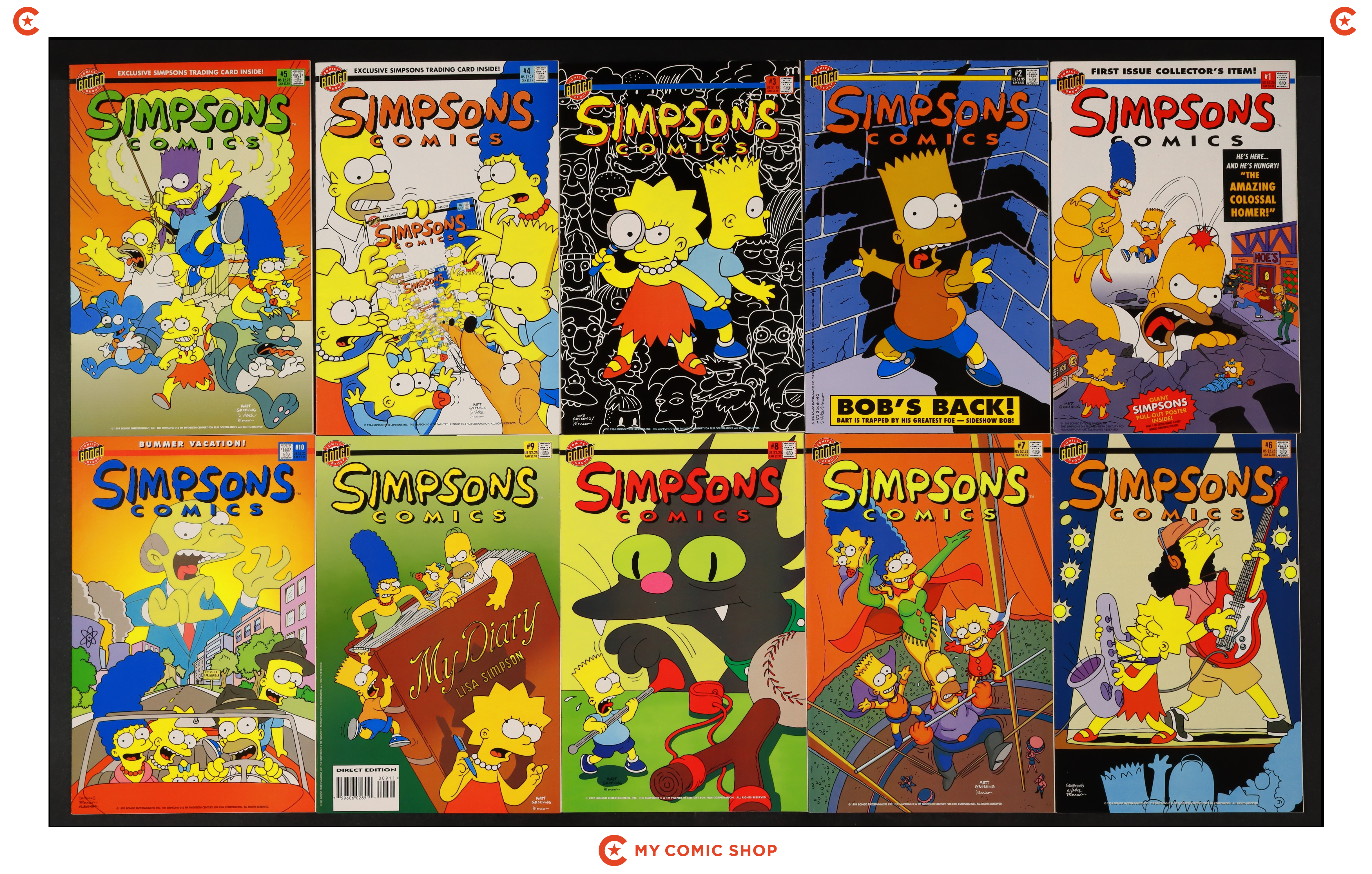 Issues 1A, 2, 3D, 4, 5D (no trading card), 6, 7, 8, 9D, 10, 11, 12, 13, 14, 15, 16, 17, 18, 19, 20 of Simpsons Comics (1993 Bongo). Most will grade in the FN to VF range with #11, #12, and #15 grading VG.