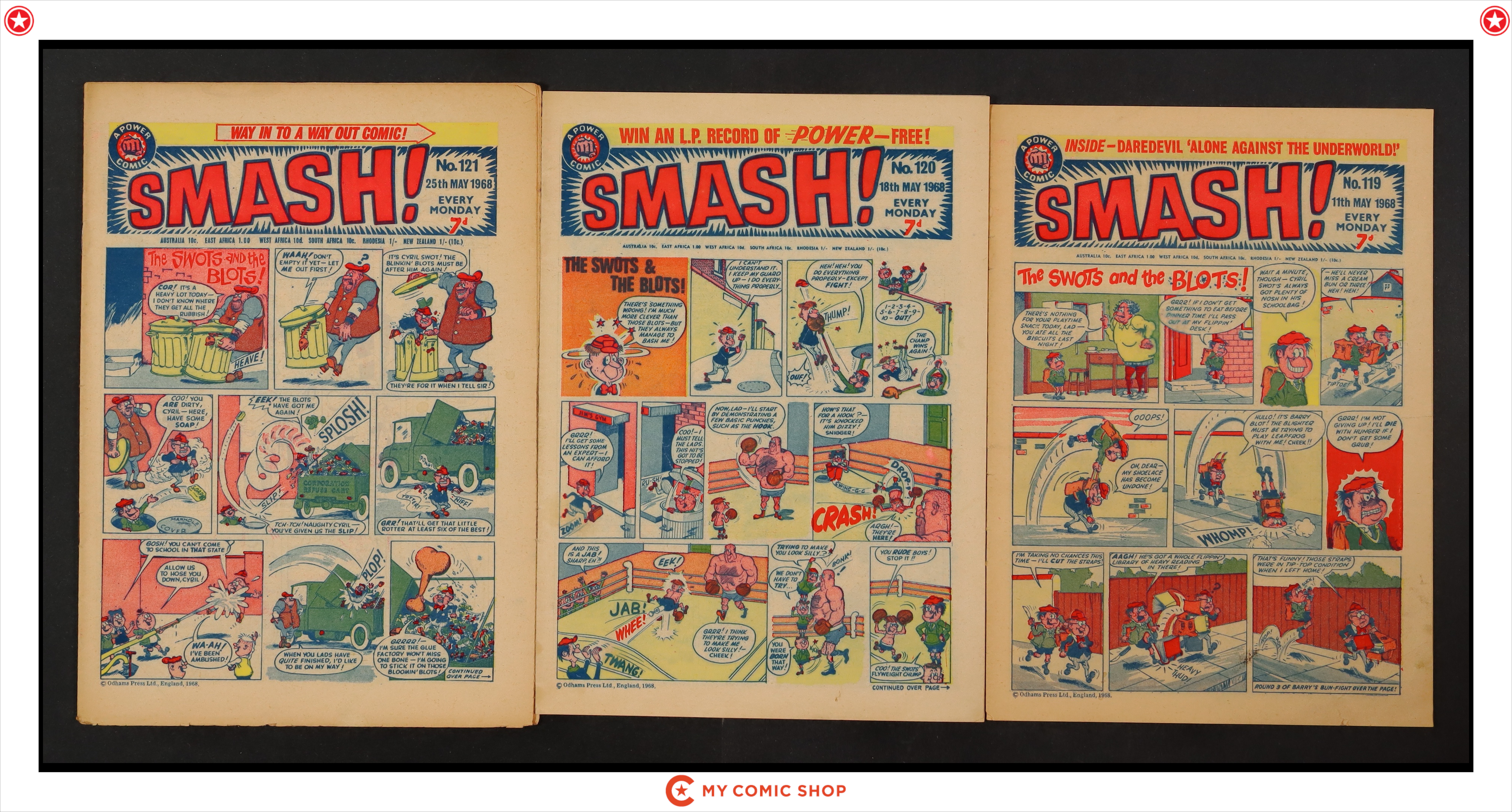 Issues 20-23, 28, 29, 31, 33, 36 of Smash! (UK 1966-1971 Odhams/IPC Magazines). Most will grade in the FN- range.