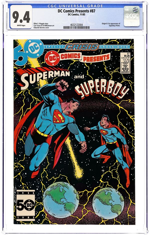 Starts Jan 19 Direct Edition. Crisis on Infinite Earths cross-over. Zapped by an alien ray, Superman hops dimensions and teams up with Superboy-Prime to battle Polarians on Earth-Prime in the 24-page "Year of the Comet." Continued in Adventures of Superman (1939) #414. Script by Elliot S! Maggin, art by Curt Swan & Al Williamson. Plus: the 16-page "Origin of Superboy-Prime" by Maggin, Swan & Williamson. Cover by Eduardo Barreto. Cover price $1.25.