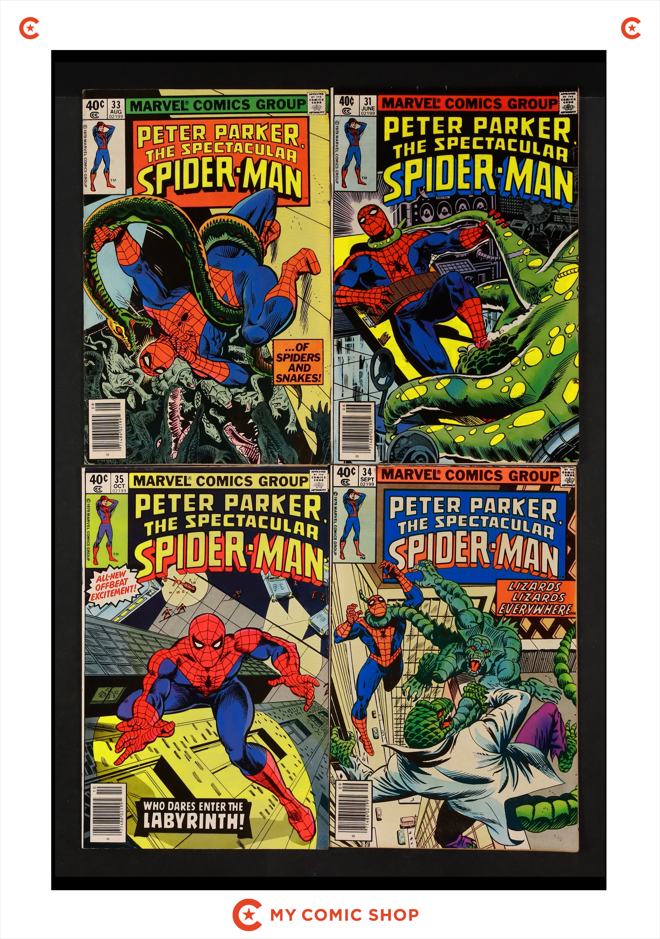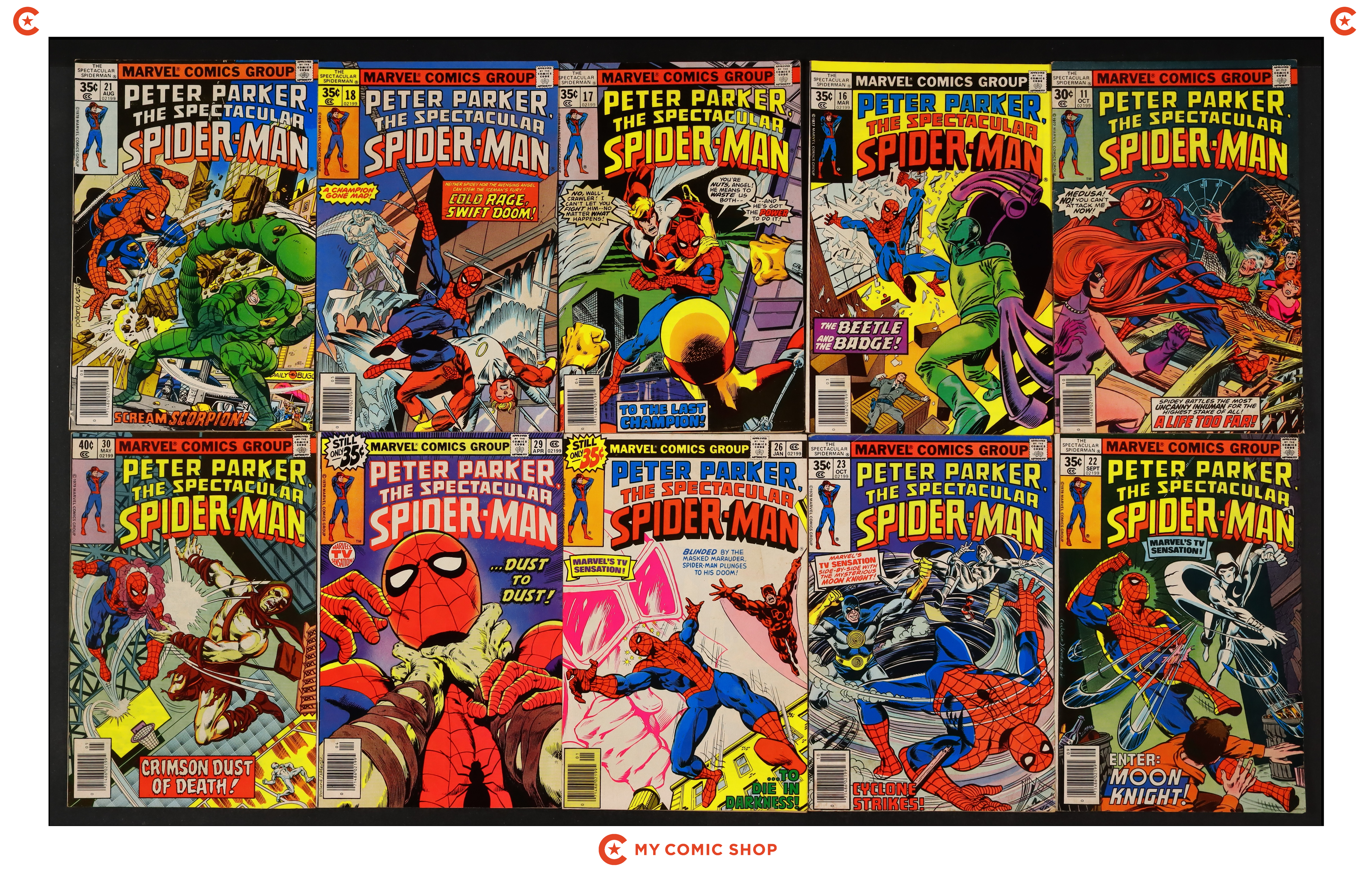 Issues 11, 16-18, 21-23, 26, 29-31, 33, 34N, and 35 of Spectacular Spider-Man (1976 1st Series). Most will grade in the Vg range with some grading FN.