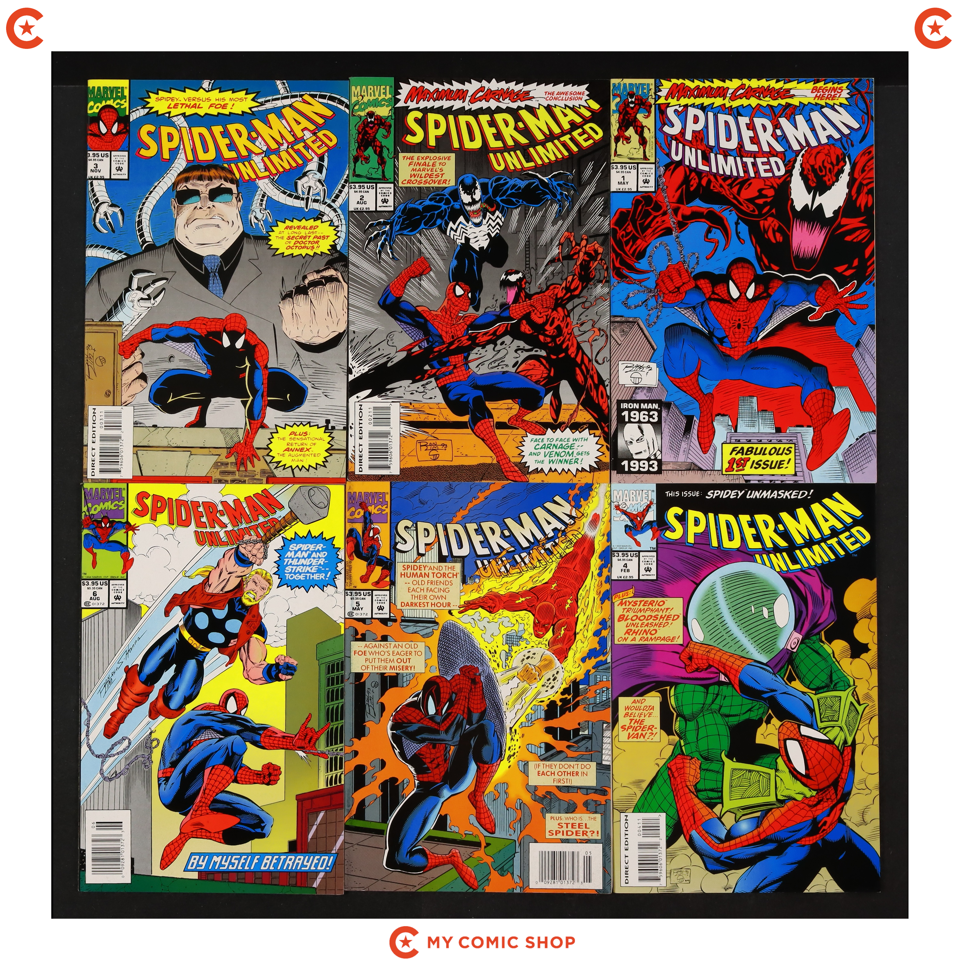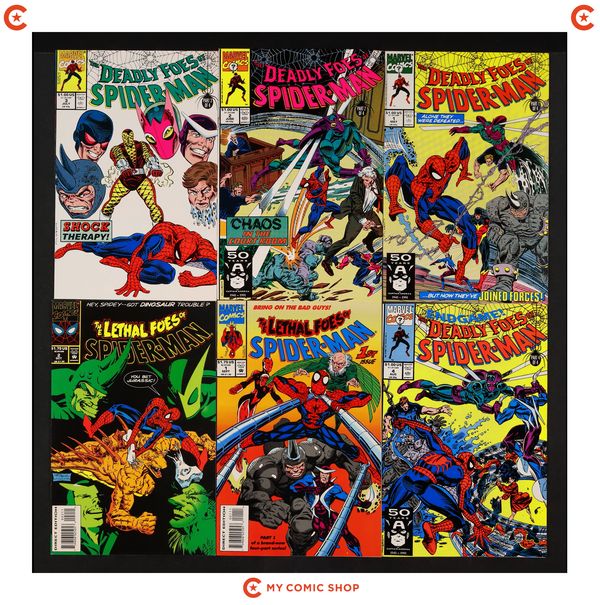 Issues 1D-6 of Spider-Man Unlimited (1993 1st Series), issues 1-4 of Deadly Foes of Spider-Man (1991), and issues 1, 2 of Lethal Foes of Spider-Man (1993). Most will grade in the FN to VF range with #5 of Spider-Man Unlimited (1993 1st Series), and #3 of Deadly Foes of Spider-Man (1991) grading VG.