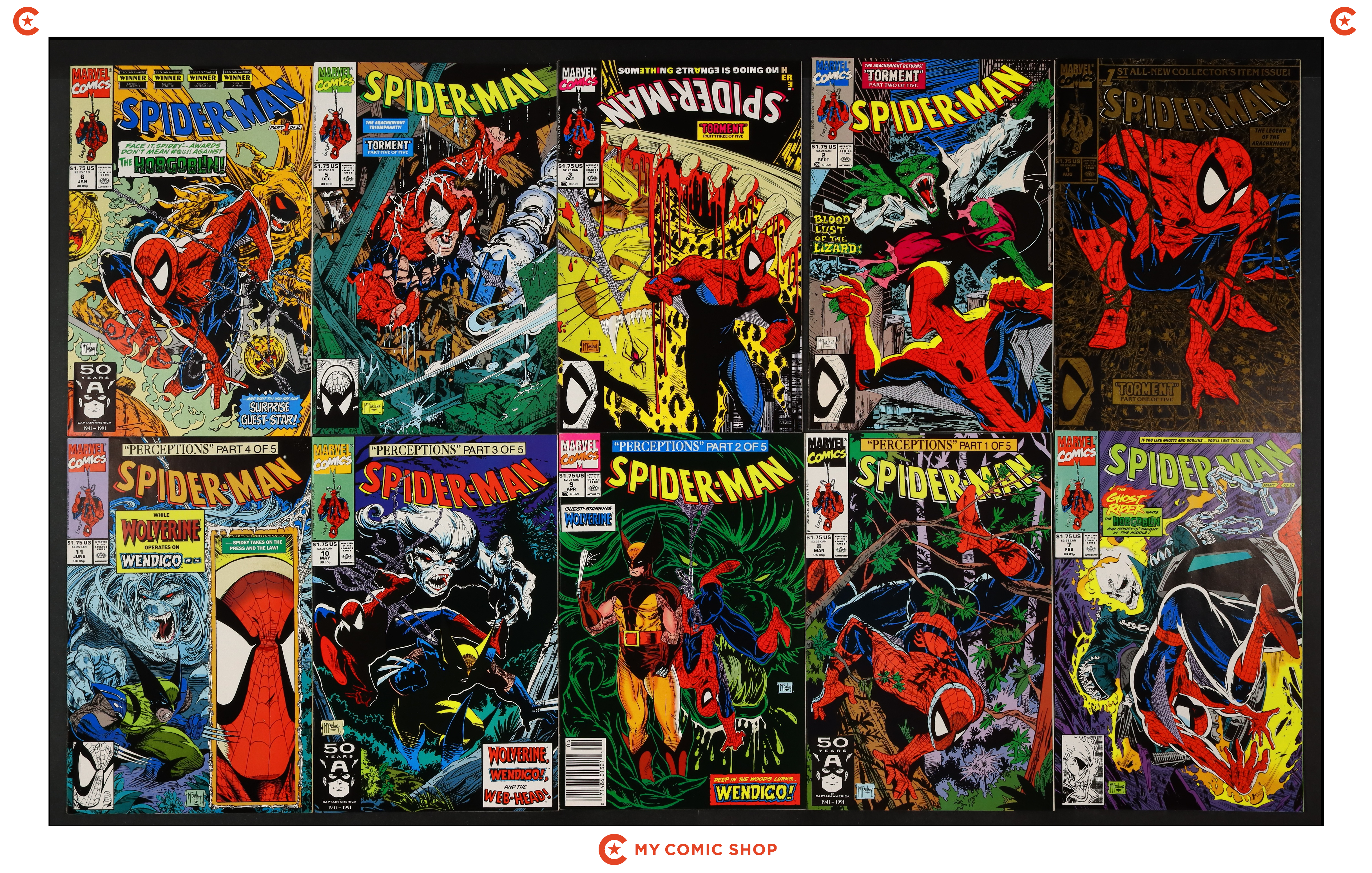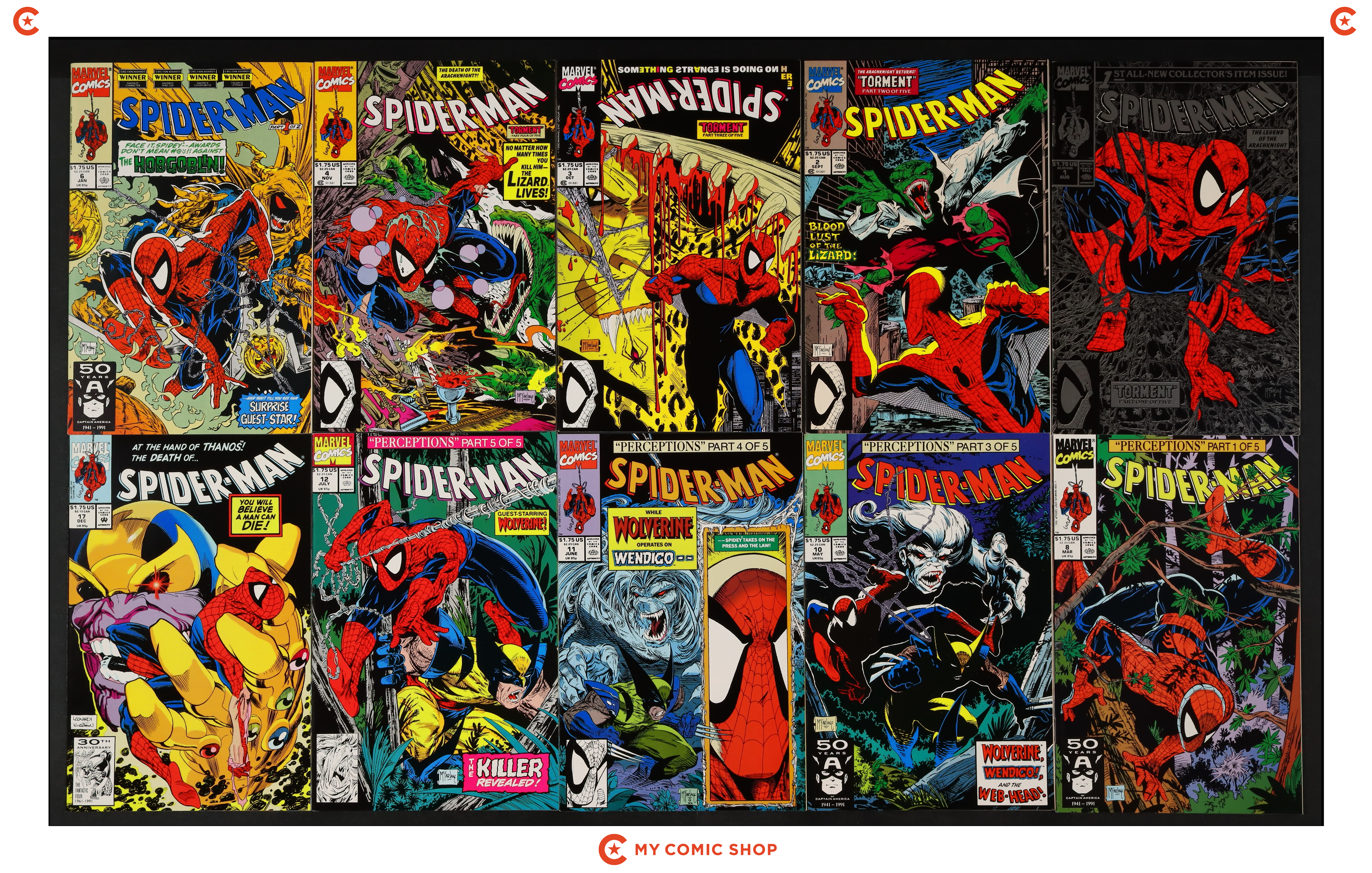 Issues 1SILVER, 2-4, 6, 8, 10-12, and 17 of Spider-Man (1990 Marvel). Most will grade in the VF range with a few grading FN.