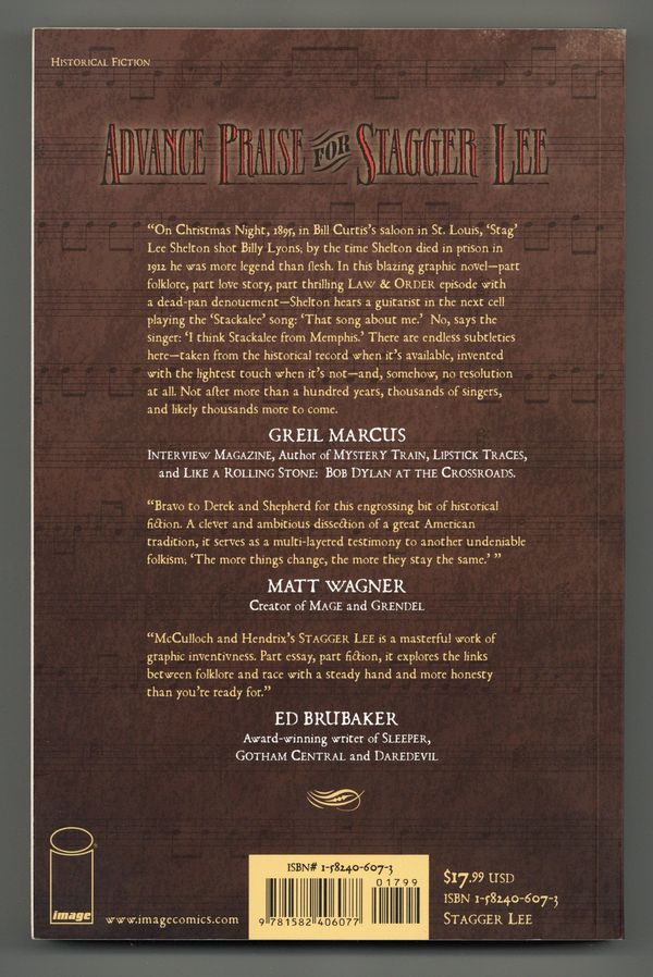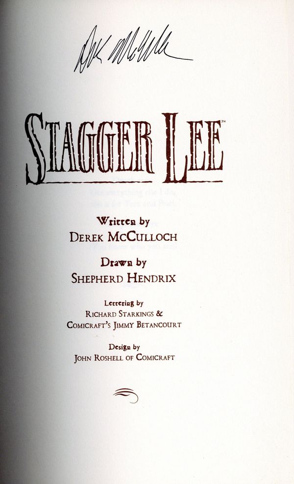 Ends Feb 23 9:15 PM CST Bid History 5 bids Current Bid $8 Your Secret Max Bid If you'd like to bid, please log in or register. 1st printing. Written by DEREK McCULLOCH. Art and cover by SHEPHERD HENDRIX. On Christmas Eve 1895, shots rang out in a St. Louis barroom. A hundred years and a thousand songs later, this ordinary little murder had become a legend. This is the true story of what happened after Stagger Lee shot Billy. Softcover, 232 pages, B&W. Cover price $17.99.