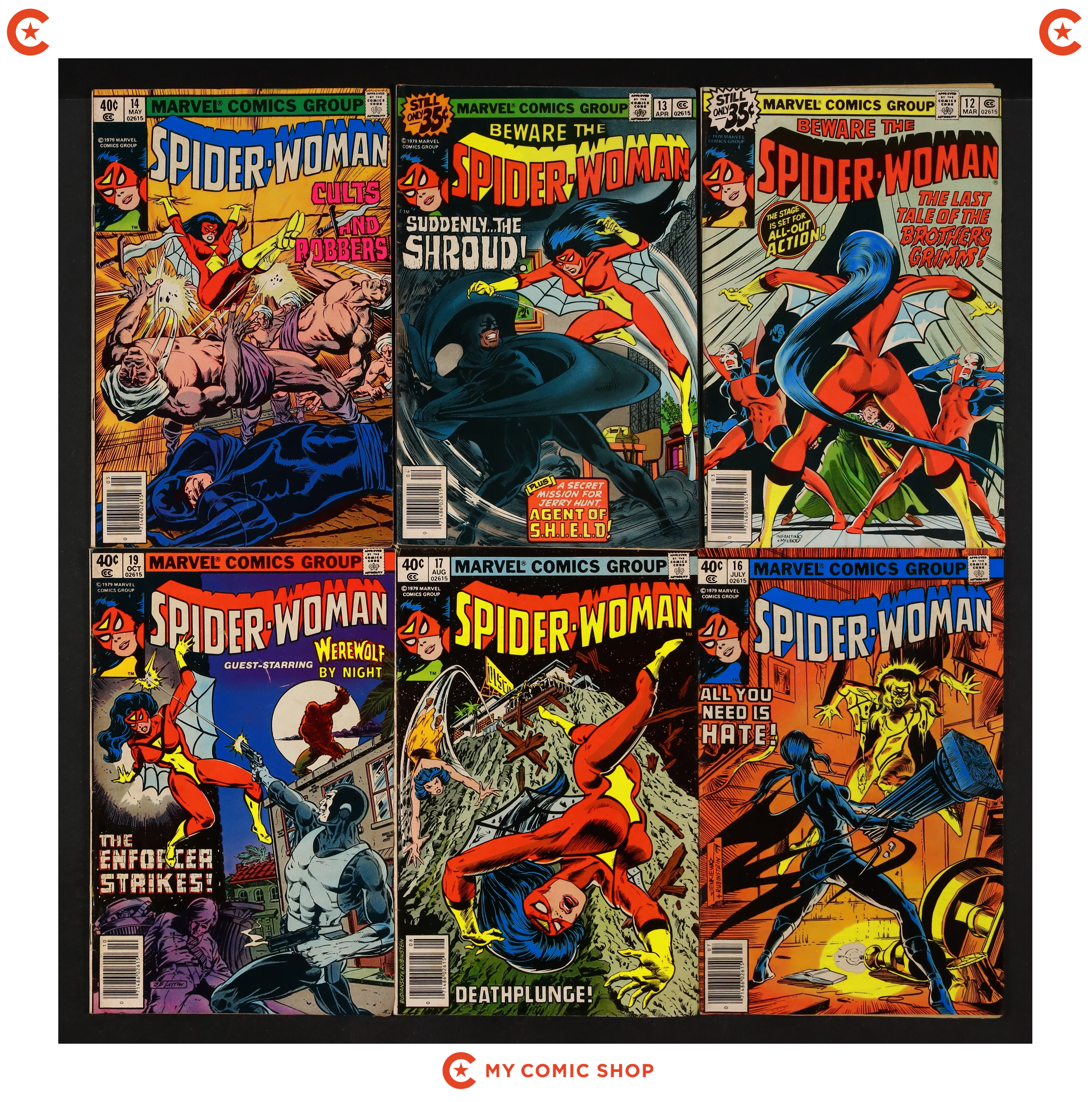 Issues 1, 2, 4, 5, 7, 8, 10, 11, 14, 19, 23-25 of Spider-Woman (1978 Marvel 1st Series). Most will grade in the FN to VF range with #1 grading GD/VG.