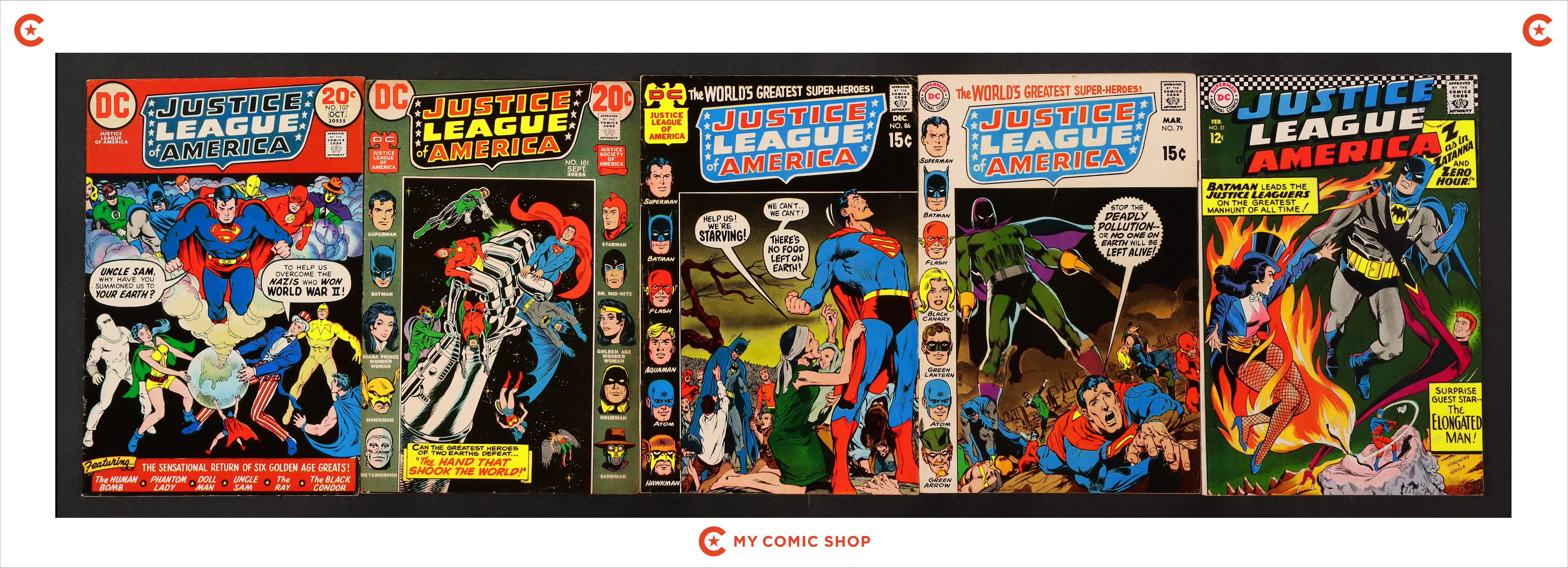 Issues 51, 79, 86, 101, and 107 of Justice League of America (1960 1st Series). Most will grade in the GD to VG range.
