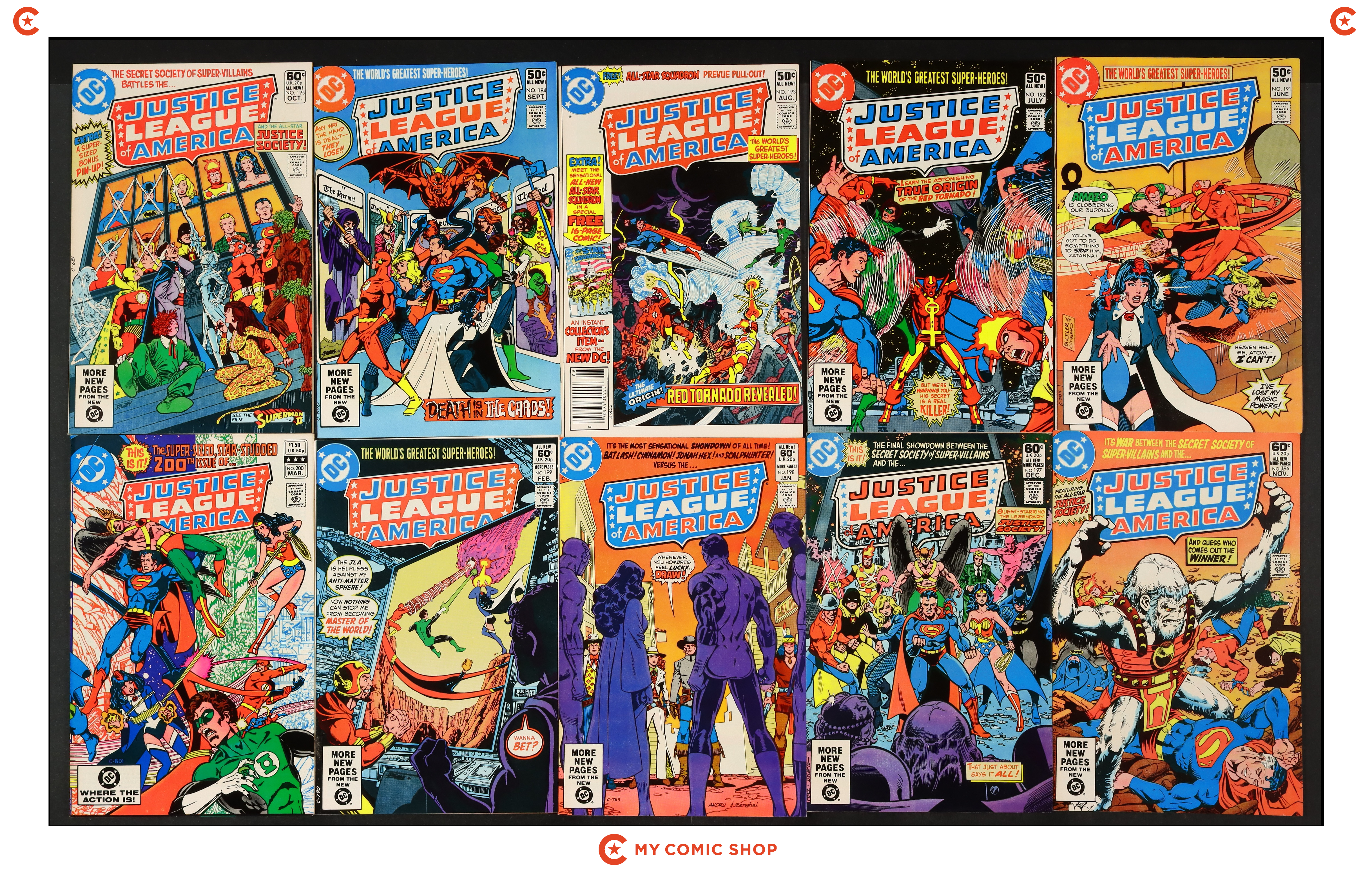 Issues 191-200 of Justice League of America (1960 1st Series). Most will grade in the VF to FN/VF range with #200 grading VG.