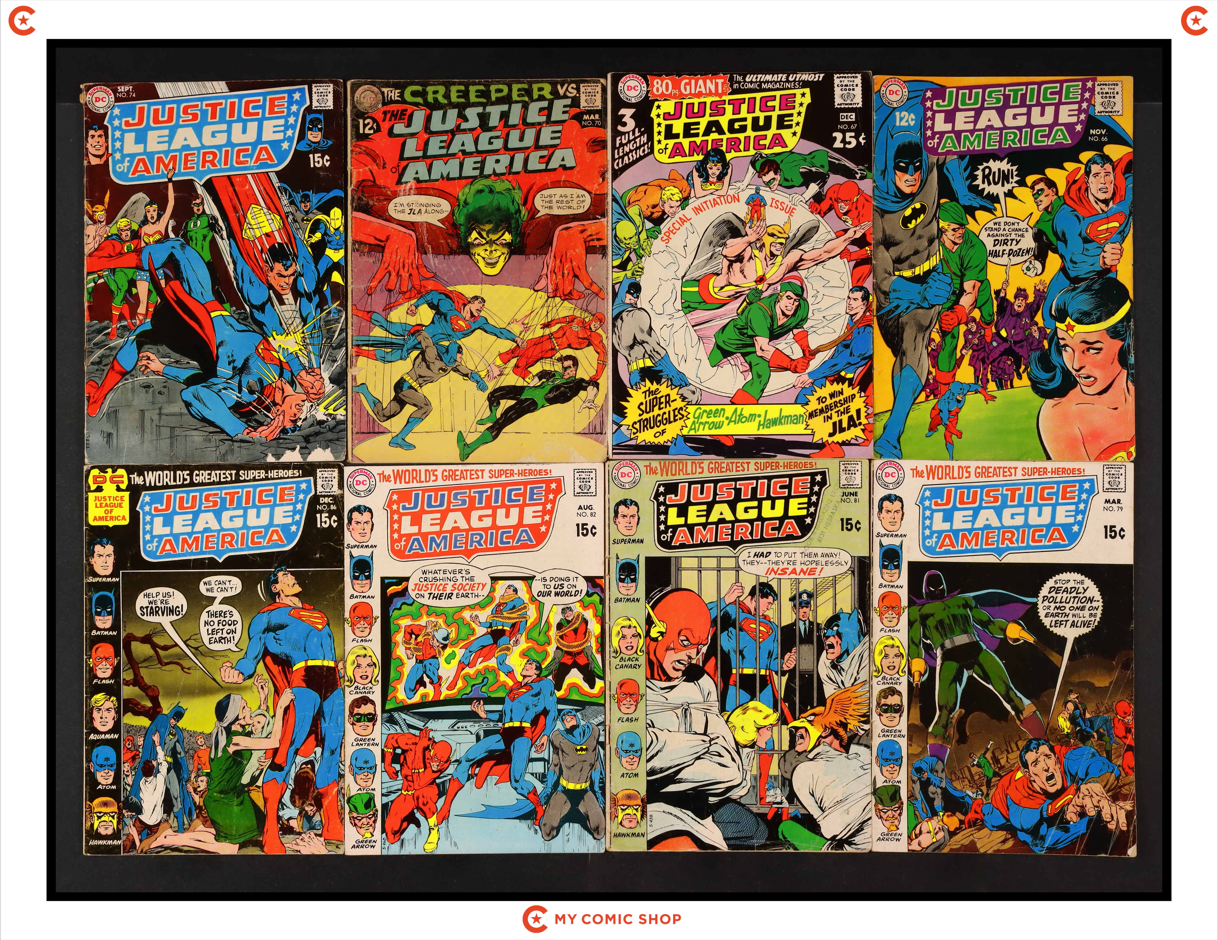 Issues 66, 67, 70, 74, 79, 81, 82, and 86 of Justice League of America (1960 1st Series). Most will grade in the GD to VG range with #67 grading FN.