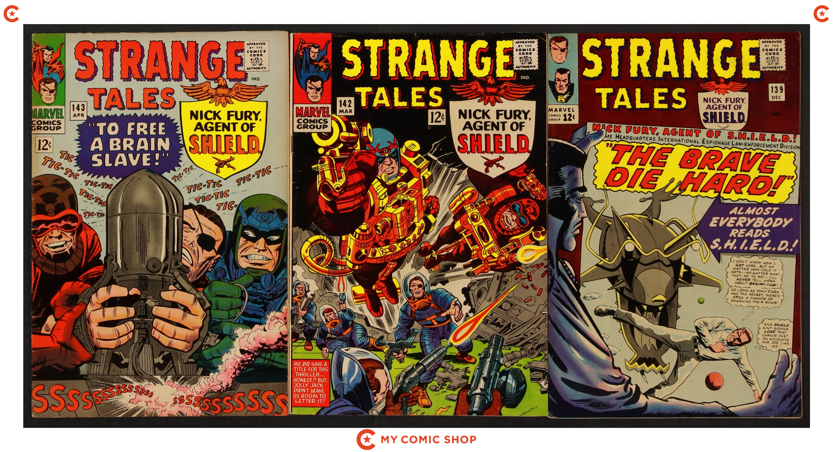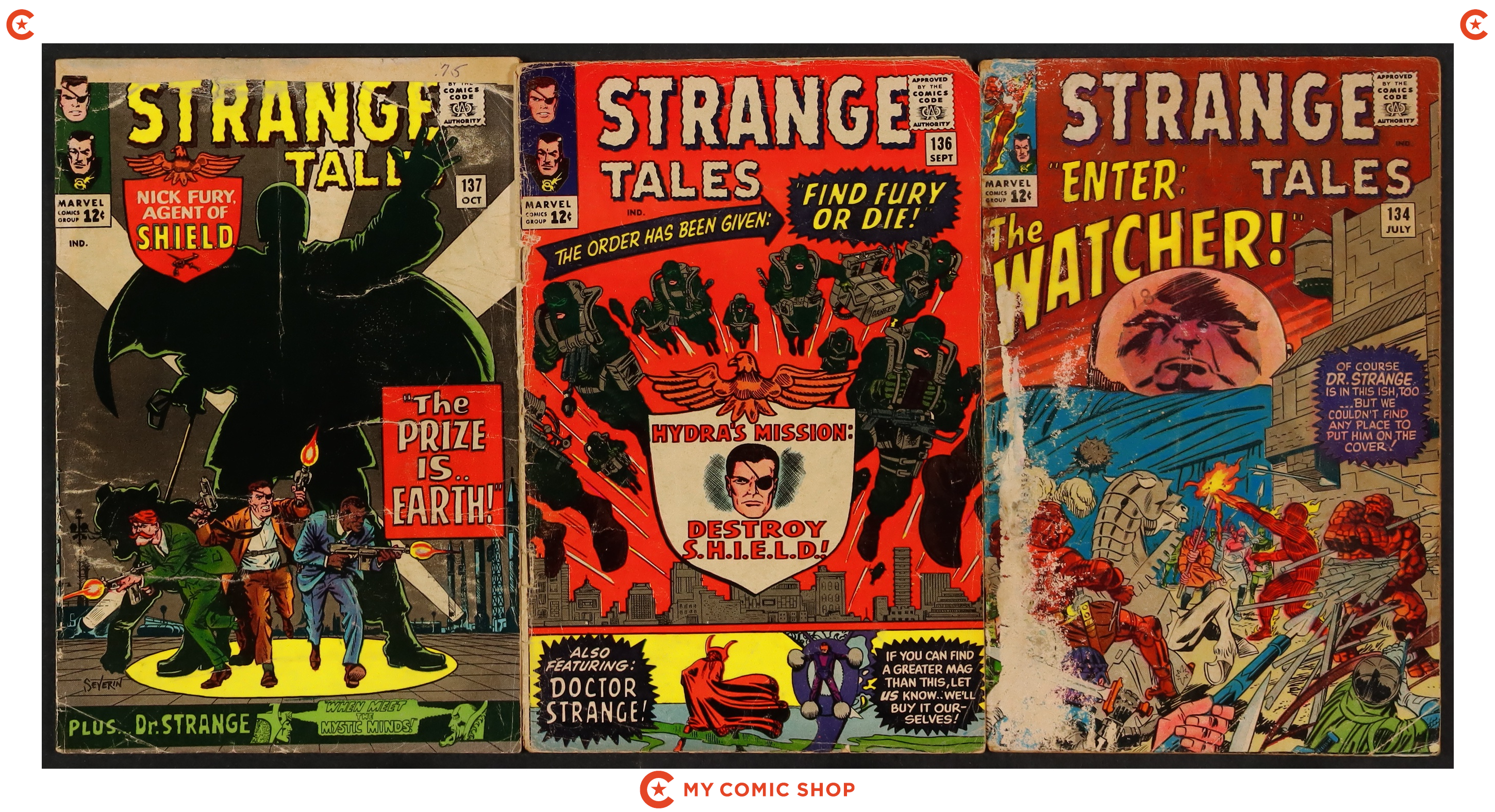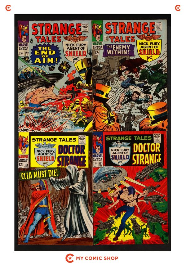 Ends Feb 23 9:22 PM CST Bid History 11 bids Current Bid $68 Your Secret Max Bid If you'd like to bid, please log in or register. Cover art by Jim Steranko. Nick Fury stars in "Crisis!", script and art by Jim Steranko; Strucker announces that the impregnable dome over Hydra Island will keep them safe from the "Death Spore" plague, and plans to use Fury's body as the basis for an army of HYDRA androids to "police" the world, once he's dead from the Alpha Ray beam; But Fury escapes!; As SHIELD searches the Heli-Carrier for the bomb with no result, Fury, "playing it by ear", takes on one group of HYDRA thugs after another, until Strucker faces him one-on-one. "The End of the Ancient One!", script by Stan Lee and Marie Severin (co-plot), pencils by Marie Severin, inks by Herb Trimpe; In order to pass his powers onto his disciple, The Ancient One allows Zom to defeat him; Before Strange's eyes, his mentor is fused with one of the giant rocks at Stonehenge, but not before he utters a warning; A battle ensues; First appearance of the Living Tribunal. Merry Marvel Marching Society info and coupon. 36 pgs., full color. Cover price $0.12.