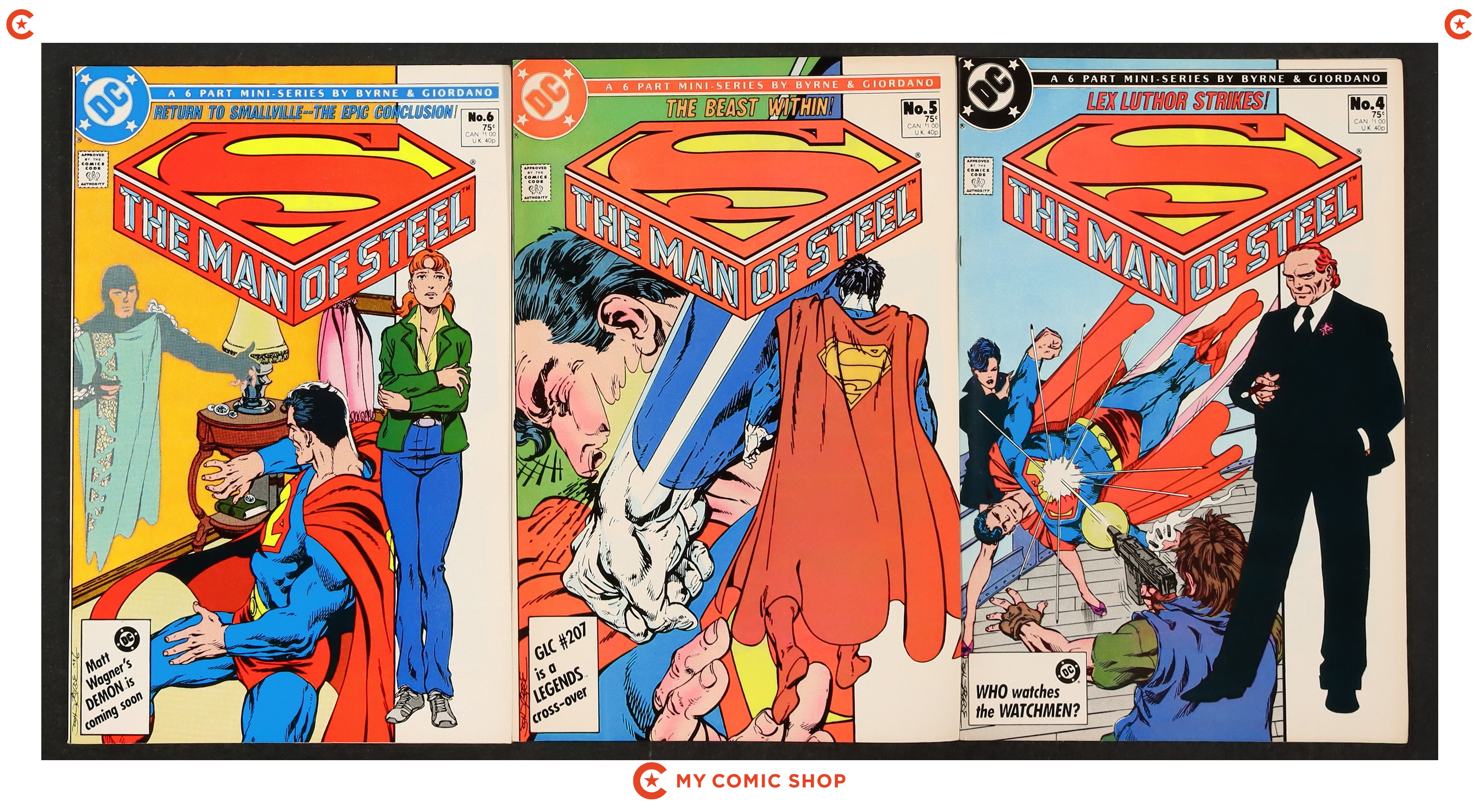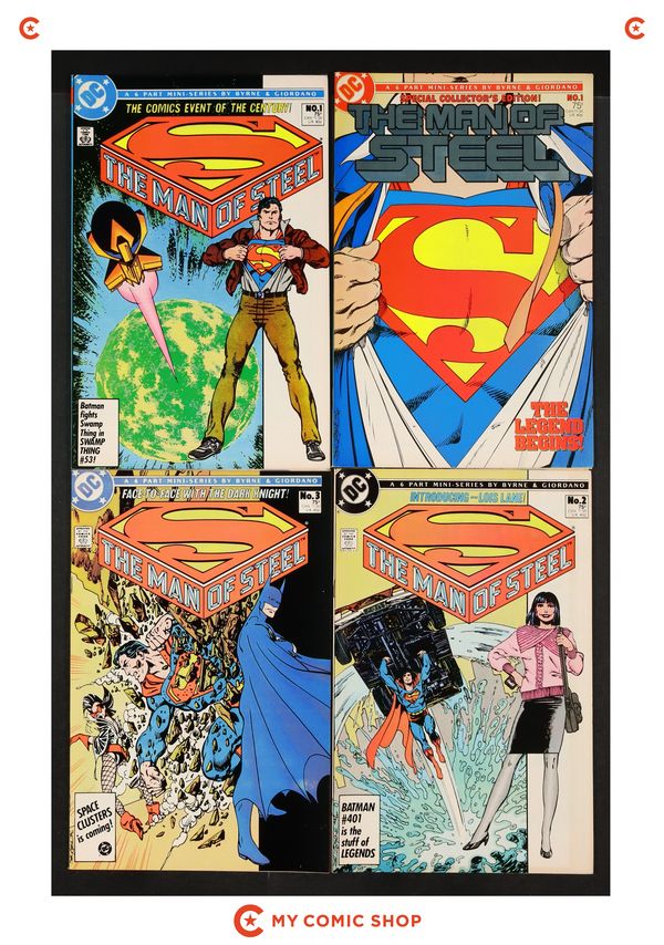 Ends Apr 16 8:36 PM CST Bid History 11 bids Current Bid $41 Your Secret Max Bid If you'd like to bid, please log in or register. Special Collector's Edition. Published just a few months after Crisis on Infinite Earths, John Byrne's The Man of Steel updated the saga of Superman for modern audiences. His origin was altered, as were many other aspects of the character. This first issue reveals that Kal-El was conceived via the mingling of seeds in a matrix chamber, Clark's powers developed slowly over time (meaning Superboy was written out of continuity), and Superman's body projected an aura that protected his now vulnerable costume. Written and drawn by John Byrne, with inks by Dick Giordano. Cover price $0.75.