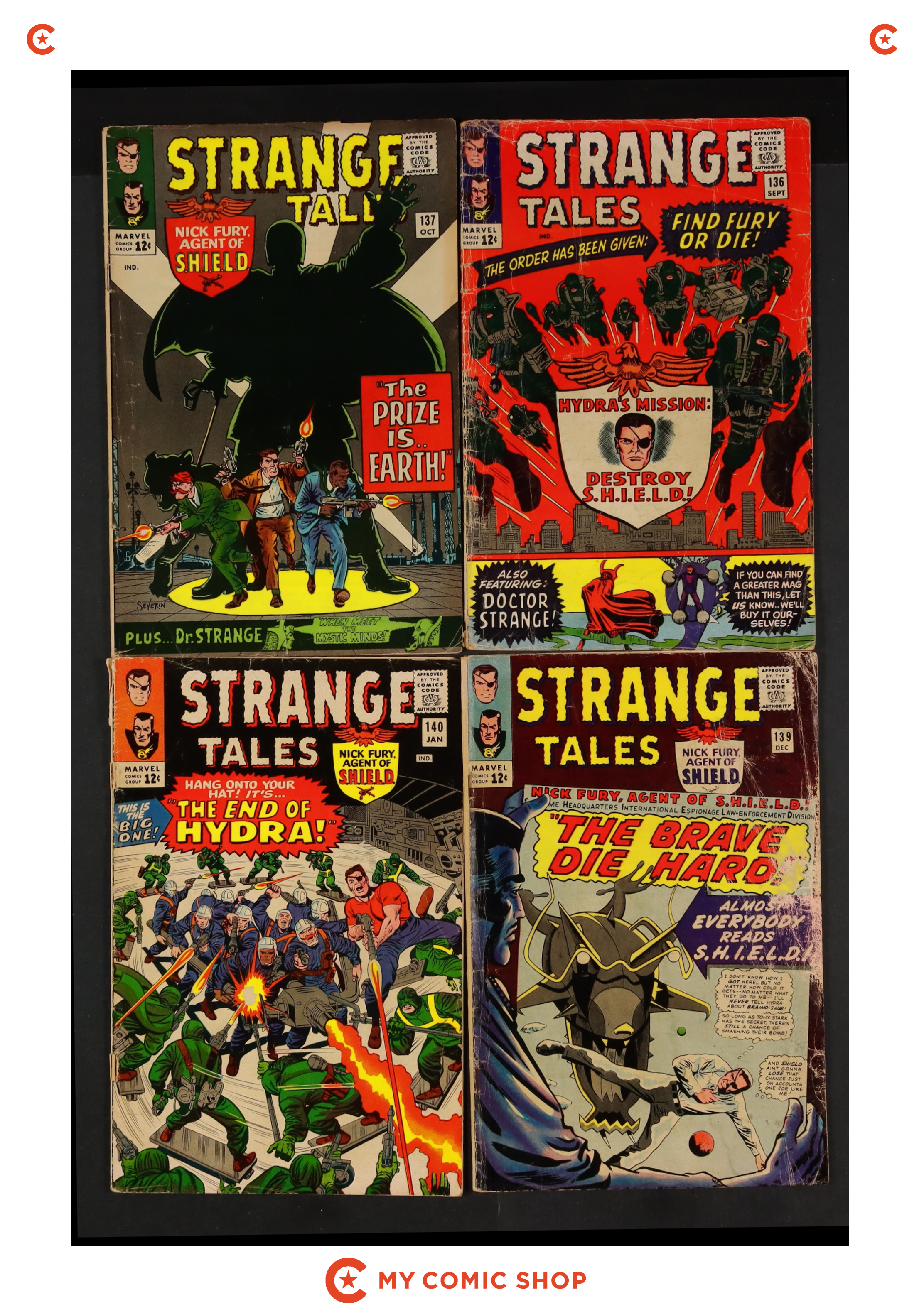 Ends Feb 23 9:21 PM CST Bid History 7 bids Current Bid $18 Your Secret Max Bid If you'd like to bid, please log in or register. Cover art by Bill Everett. Nick Fury stars in "The Power of SHIELD!", script by Stan Lee and Jack Kirby (co-plot), pencils by Jack Kirby (layouts) and Jim Steranko, inks by Jim Steranko; Fury signals SHIELD but after Sitwell realizes Fury is the pilot he still orders the launching of a Strato-Mine which could ignite the atmosphere; Supreme Hydra learns that Laura Brown, the daughter of his predecessor who helped Fury has been captured in Egypt; Donning a new disguise he leaves to exact punishment; Fury turns the plane around, and, discovering the hidden Overkill Horn, dives from the plane, picked up by a SHIELD submarine. "Into the Dimension of Death!", script by Stan Lee and Bill Everett (co-plot), art by Bill Everett; Doctor Strange finds himself once more in The Dark Dimension, the home of Dormammu & Clea; After facing several dangers, he senses the power of a woman behind it all; Umar uses a pair of cloudy "spirits" to summon Strange to her presence; She tells him of her imprisonment, and that she wishes to "make amends" for her brother's deeds; She also tells him that Clea has been captured by The Mindless Ones, and that she summoned him as the one Clea hoped would rescue her. 36 pgs., full color. Cover price $0.12.