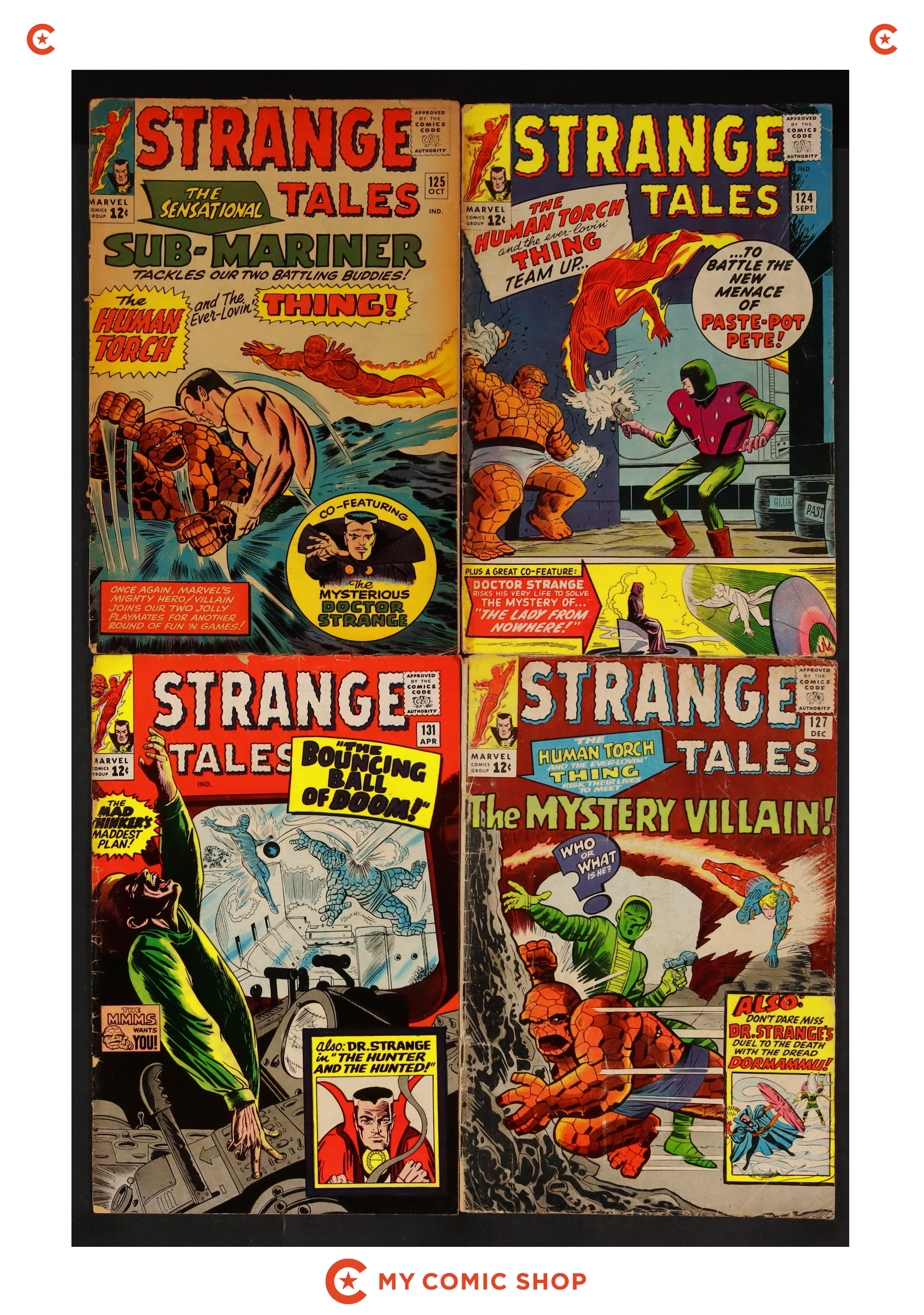 Starts Later today Cover pencils by Jack Kirby and Steve Ditko (inset), inks by Chic Stone and Steve Ditko (inset). The Human Torch and the Thing star in "The Mystery Villain!", script by Stan Lee (co-plot, dialogue) and Dick Ayers (co-plot), pencils by Dick Ayers, inks by Paul Reinman; Following a race, Ben and Johnny complain to Reed that they've done pretty good and don't need a leader; Reed tells them they're free to work on their own; Ben and Johnny take part in a high-speed race, but discover on arrival that they're the only two contestants; Sub-Mariner cameo. "Duel with the Dread Dormammu!", script by Steve Ditko (plot) and Stan Lee (dialogue), art by Steve Ditko; The mysterious girl appears and takes Strange to The Mindless Ones, destructive creatures who are held back from killing by Dormammu's willpower; Dormammu imprisons the girl for betraying him and the battle begins; With Dormammu concentrating on defeating his foe the barrier holding The Mindless Ones collapses; he is forced to join forces with Strange to stop them; Guest starring Clea; Dr. Strange receives his amulet and red-and-yellow cloak of levitation from the Ancient One. A Marvel Masterwork Pin-Up of The Thing, pencils by Jack Kirby, inks by Chic Stone. 36 pgs., full color. NOTE: 2nd appearance of Dormammu and Clea. 1st appearance of The Eye of Agamotto and Cloak of Levitation. 1st battle between Doctor Strange and Dormammu. Cover price $0.12.