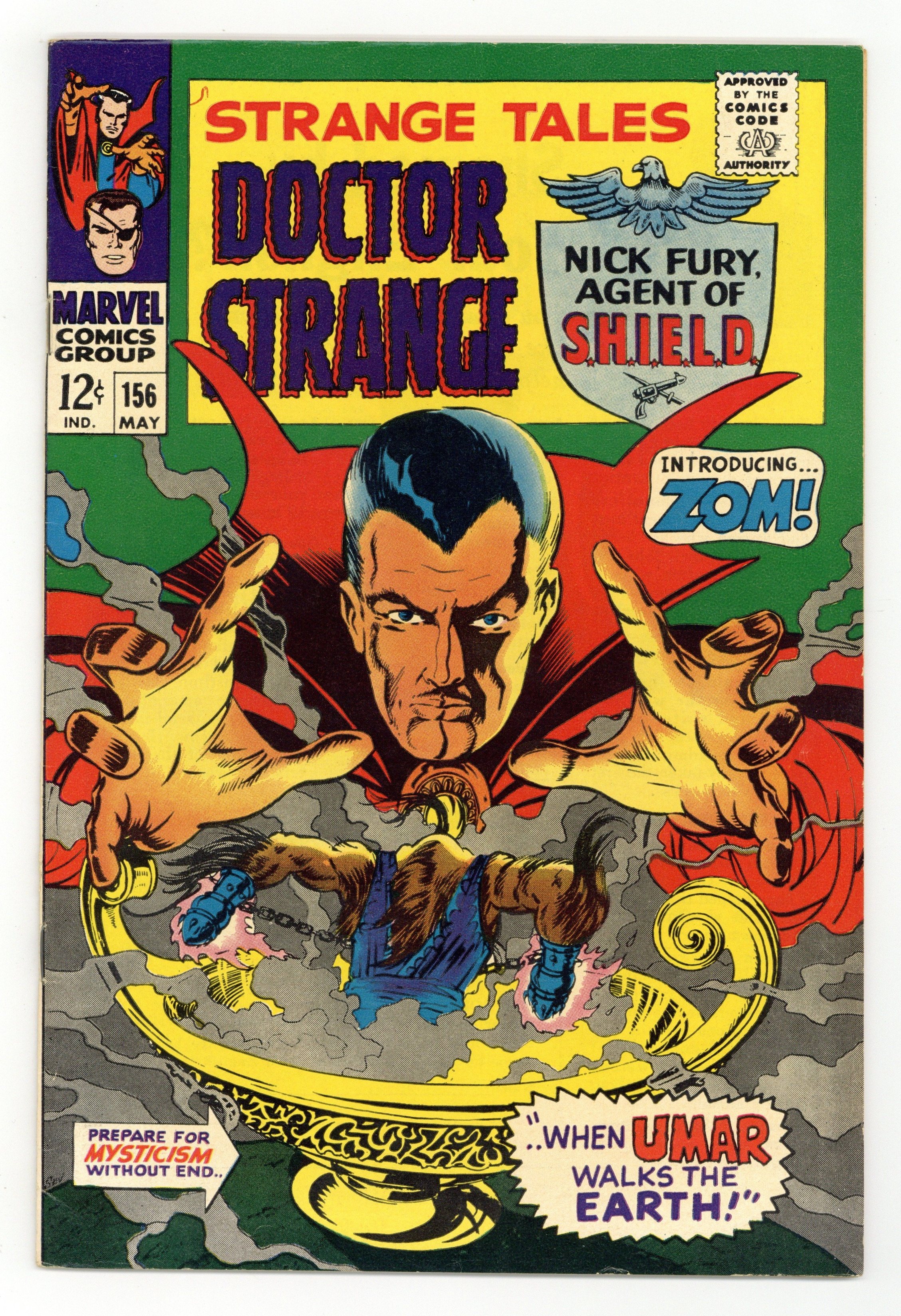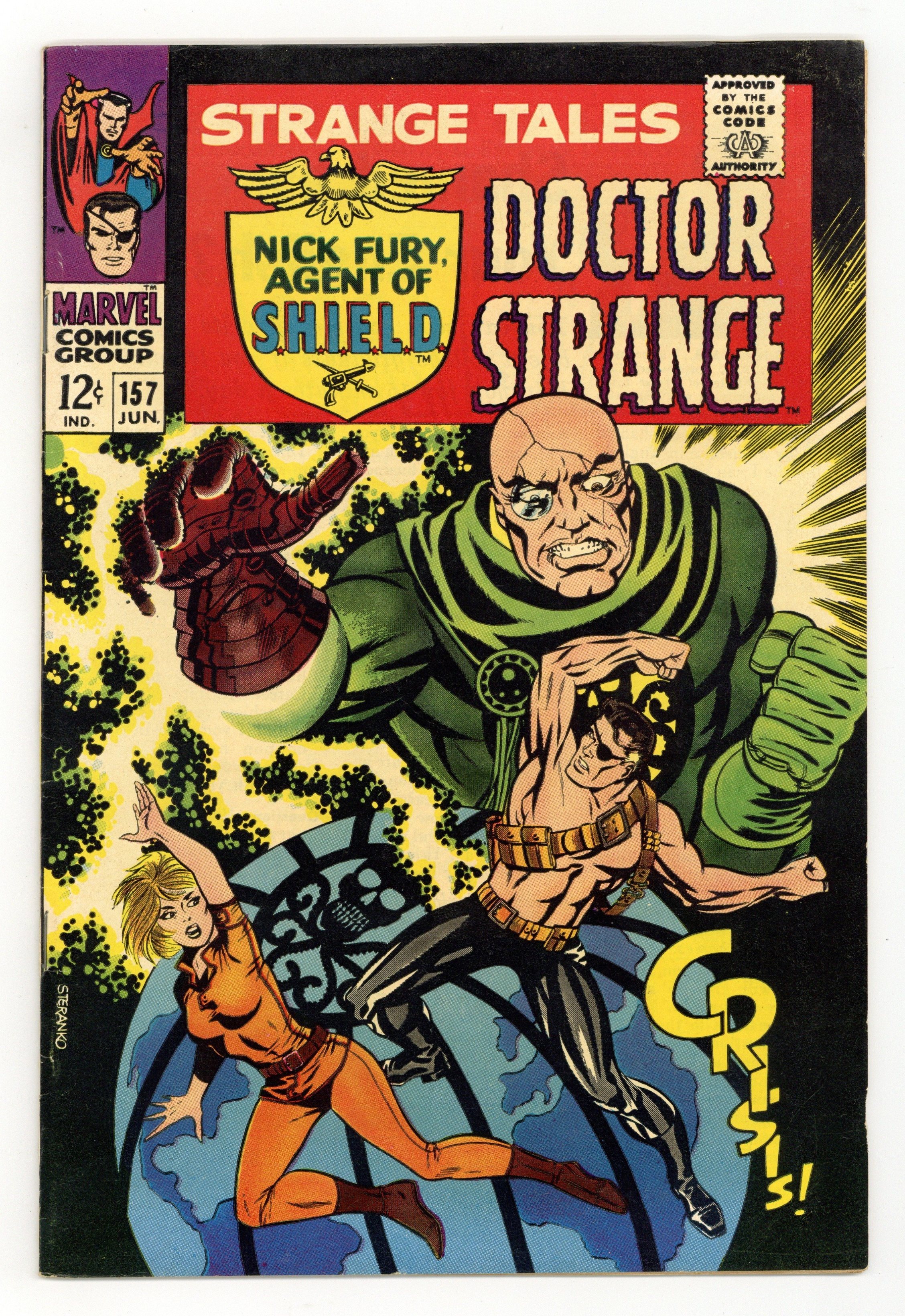 Starts Mar 2 Cover art by Jim Steranko. Nick Fury stars in "Armageddon!", script and pencils by Jim Steranko, inks by Joe Sinnott; While Jimmy Woo cradles the body of Suwan in his arms a SHIELD Suicide Squad bursts in via The Dreadnought, a colossal tunneling machine; The Claw vanishes but Fury uses a Pseudo-Elliptoid Wrist Tracer to find him, but arrives just as the villain escapes into the Space-Time Continuum in an Infinity Sphere; Fury finds a Prototype Warp-Vest and follows The Yellow Claw as they have a psychic duel. "This Dream—This Doom!", script by Dennis O'Neil and Dan Adkins (co-plot), art by Dan Adkins; The Ancient One is alive and tells Strange he made Zom believe he was dead so he could pass on his powers to his disciple; With the Cosmic Balance restored he was able to shatter the spell that bound him; In his Himalayan retreat Strange and the Ancient One discover that Victoria Bentley is a prisoner in the Dimension of Dreams; Using a mystic gem and with his mentor to mentally guide him Strange travels to Victoria. Ad for Not Brand Echh and Daredevil. Statement of ownership--average print run 428.603; average paid circulation 241,561. 36 pgs., full color. Cover price $0.12.