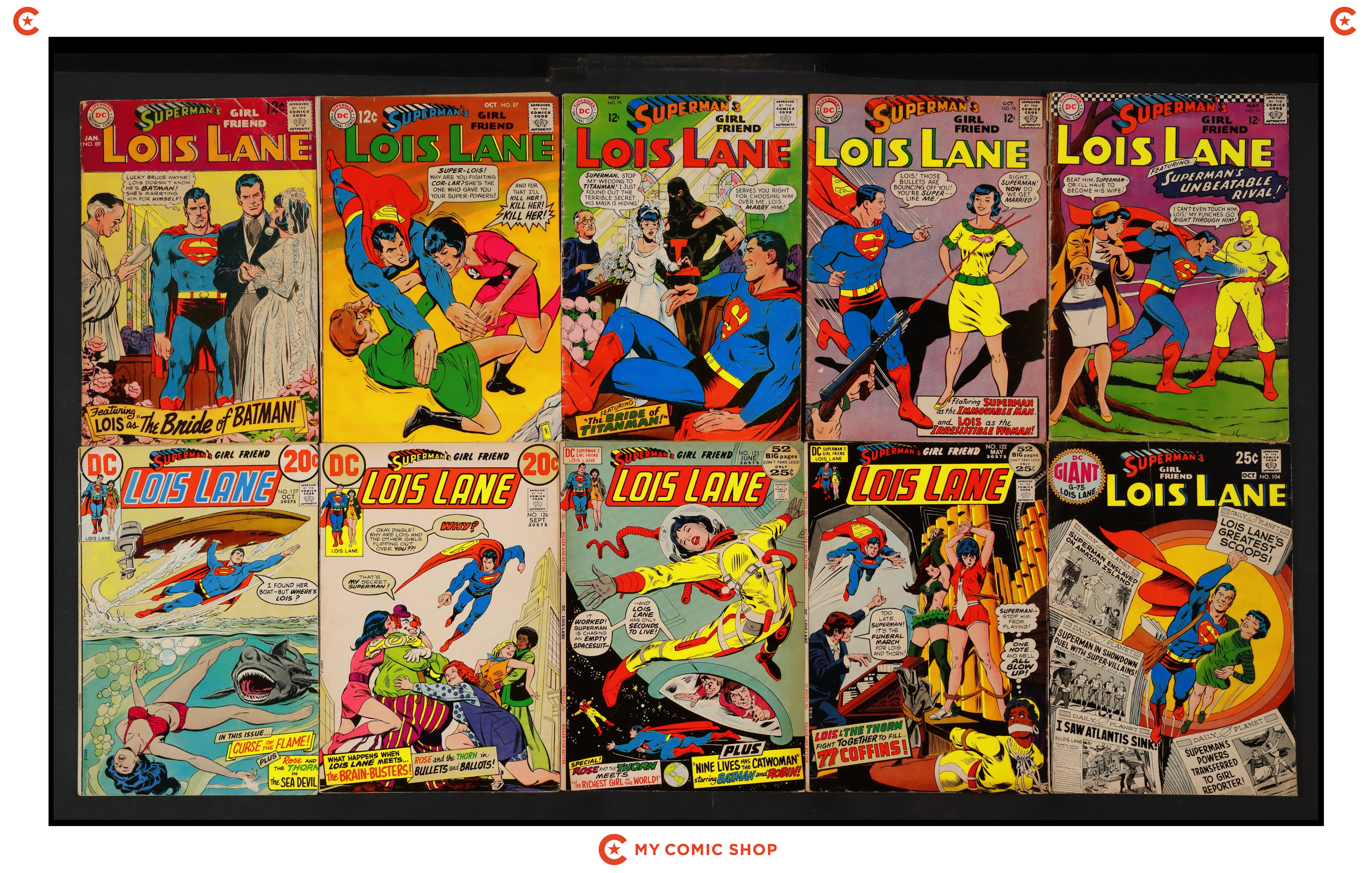 Issues 74, 78, 79, 87, 89, 104, 122, 123, 126, 127 of Superman's Girlfriend Lois Lane (1958). Most will grade in the GD to VG range.