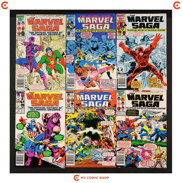 Issues 1, 3, 5, 6, 10, 11, 17, and 21 of Marvel Saga (1985). Most will grade in the FN to VG range.
