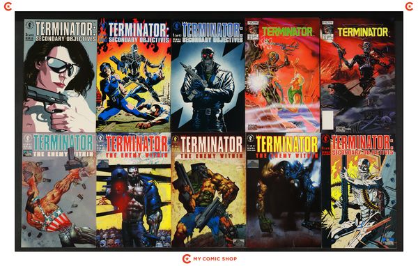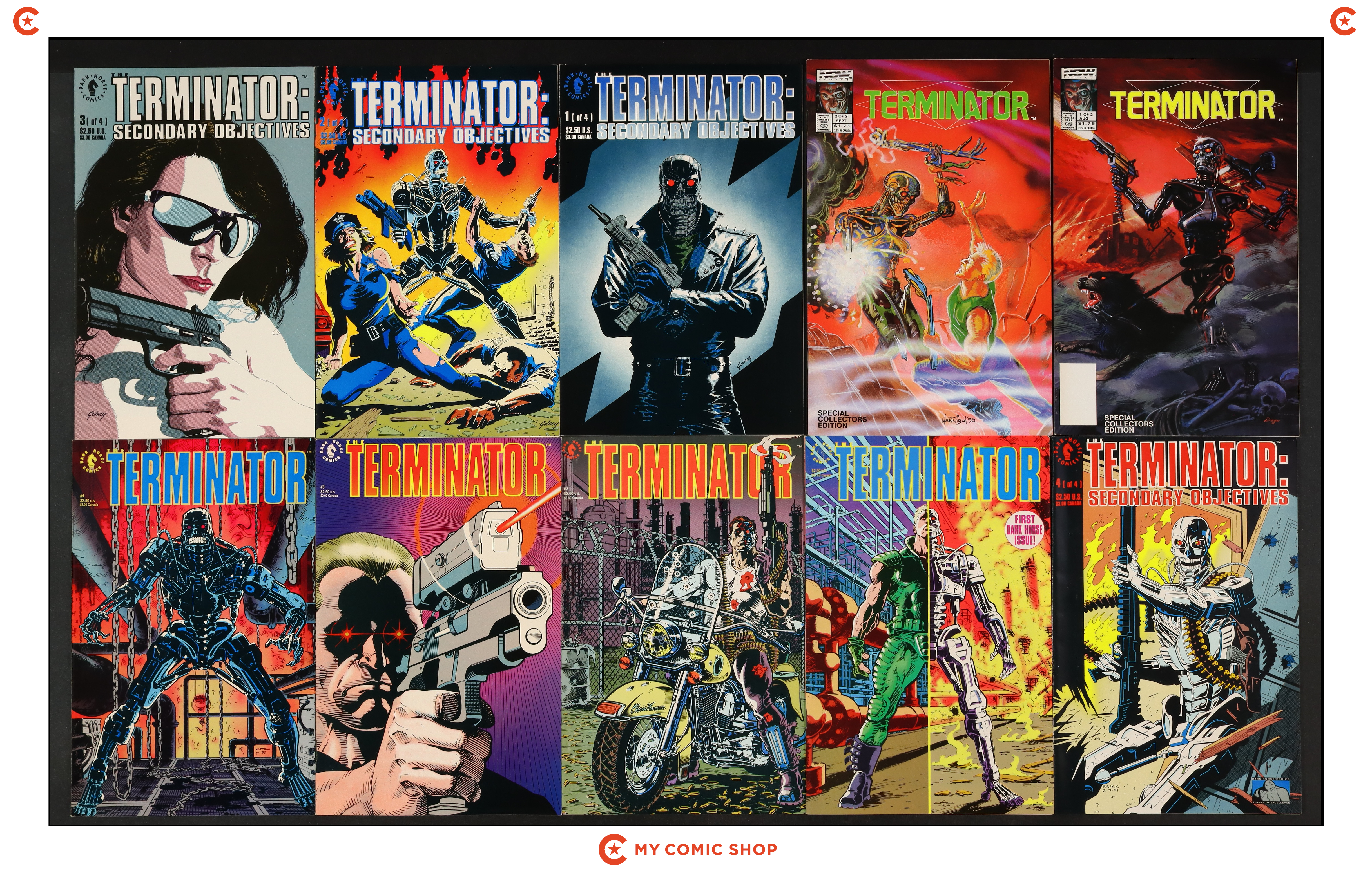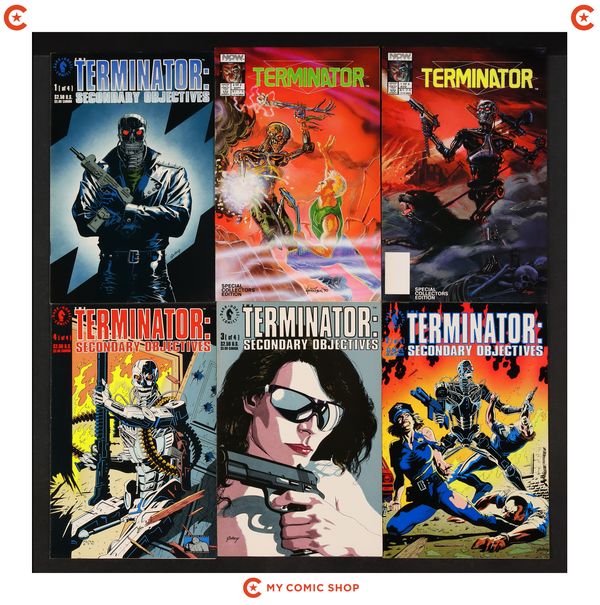Issues 1 and 2 of Terminator All My Futures Past (1990); 1-4 of Terminator Secondary Objectives (1991); and 1-4 of Terminator (1990 1st Series Dark Horse). Most will grade in the VF range with a couple grading FN.