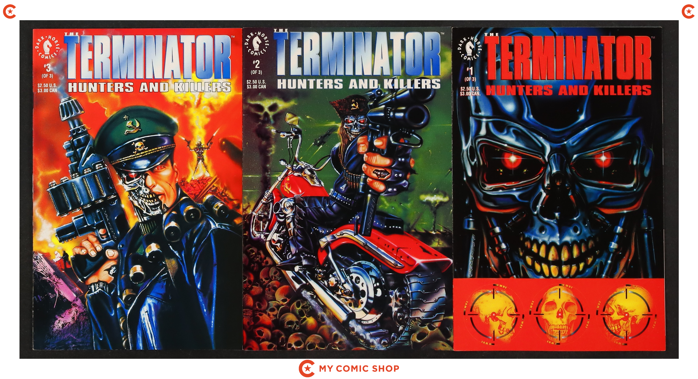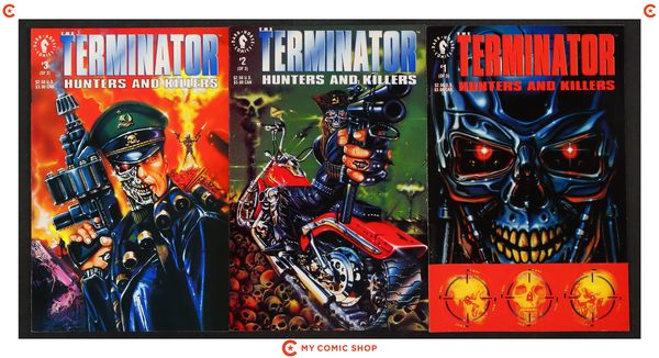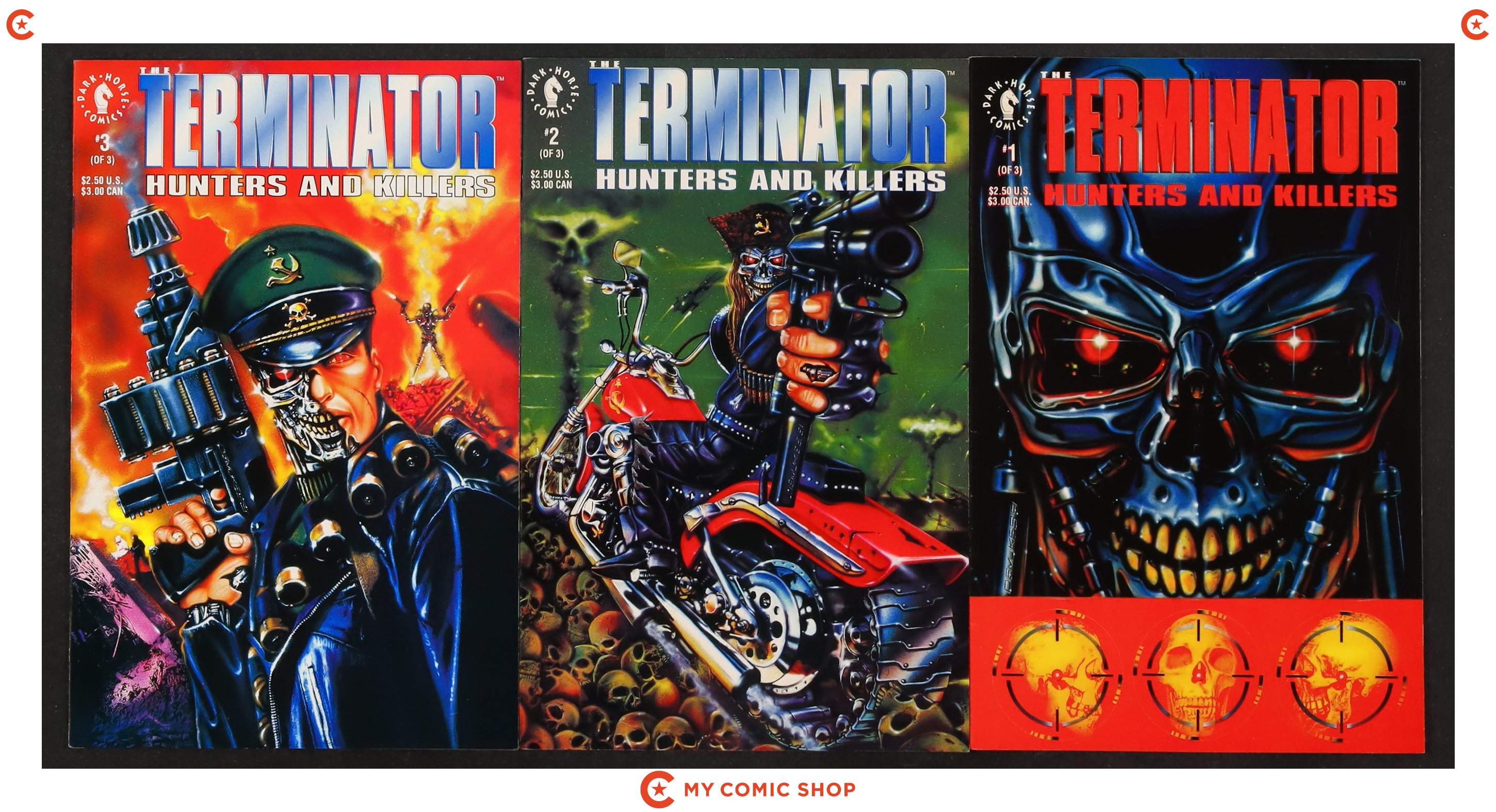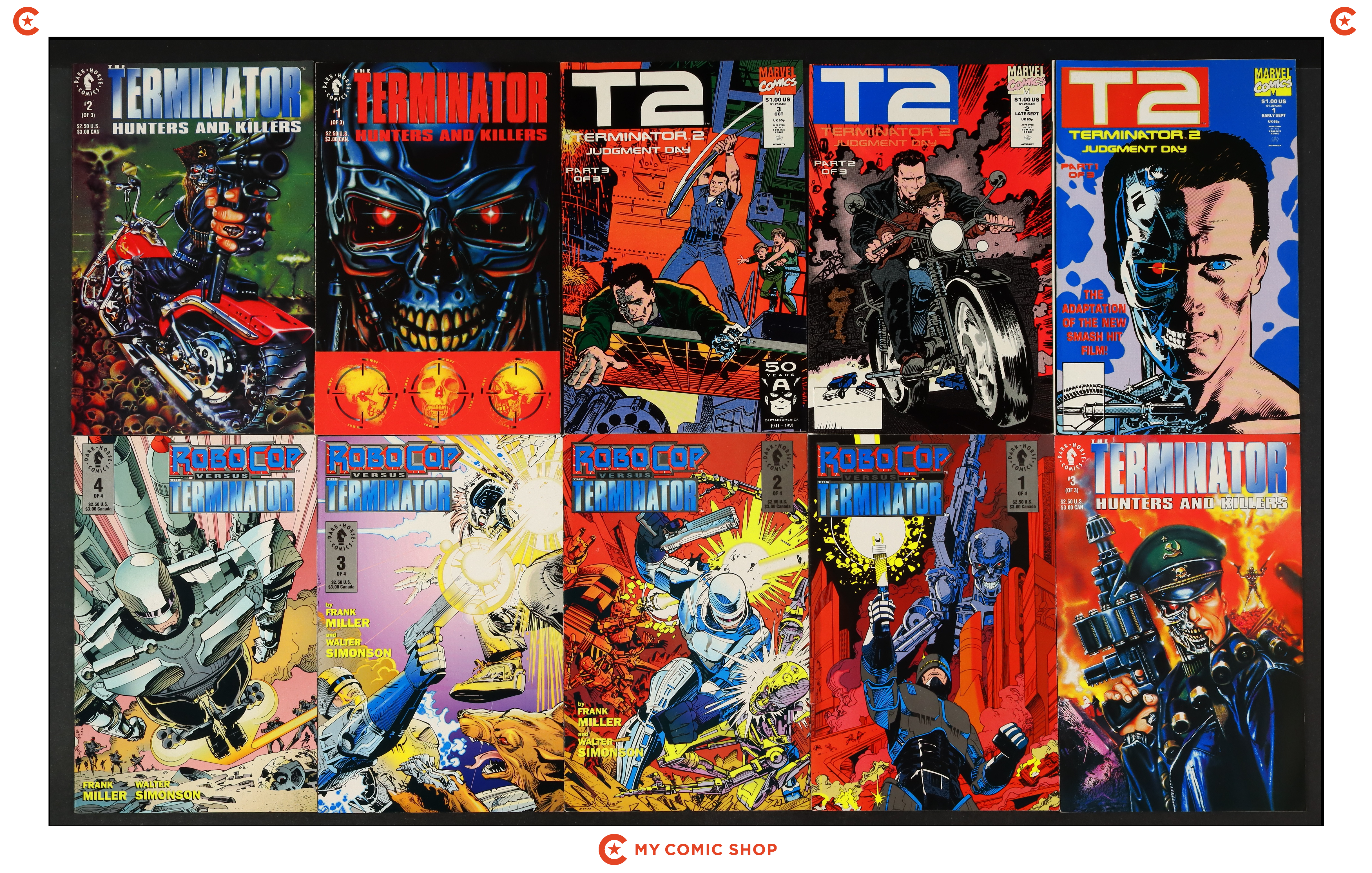 Issues 1-3 of Terminator 2 Judgment Day (1991 Comic); 1-3 of Terminator Hunters and Killers (1992); and 1-4 of Robocop vs. Terminator (1992). Most will grade in the FN range with a couple grading VF.