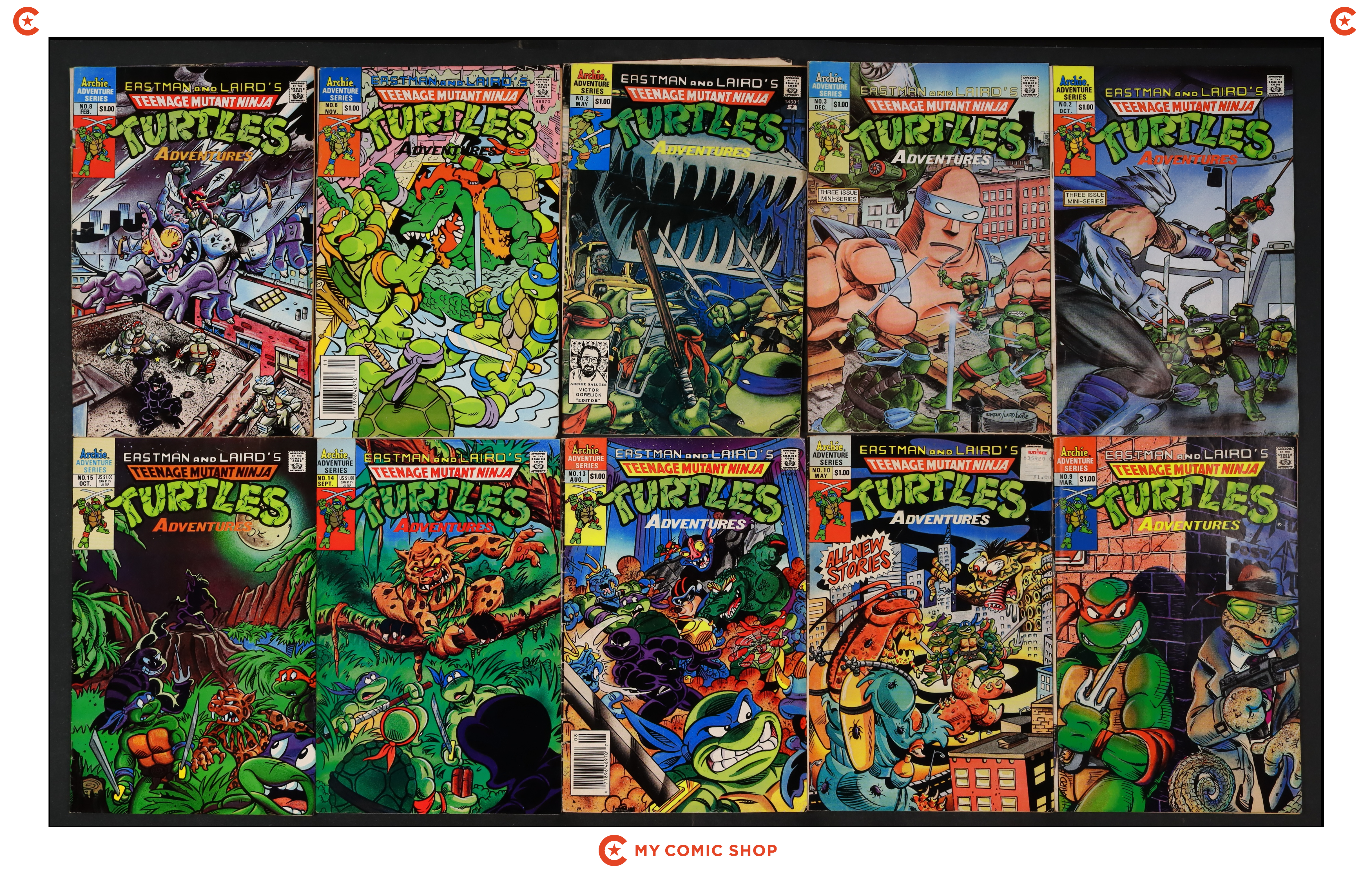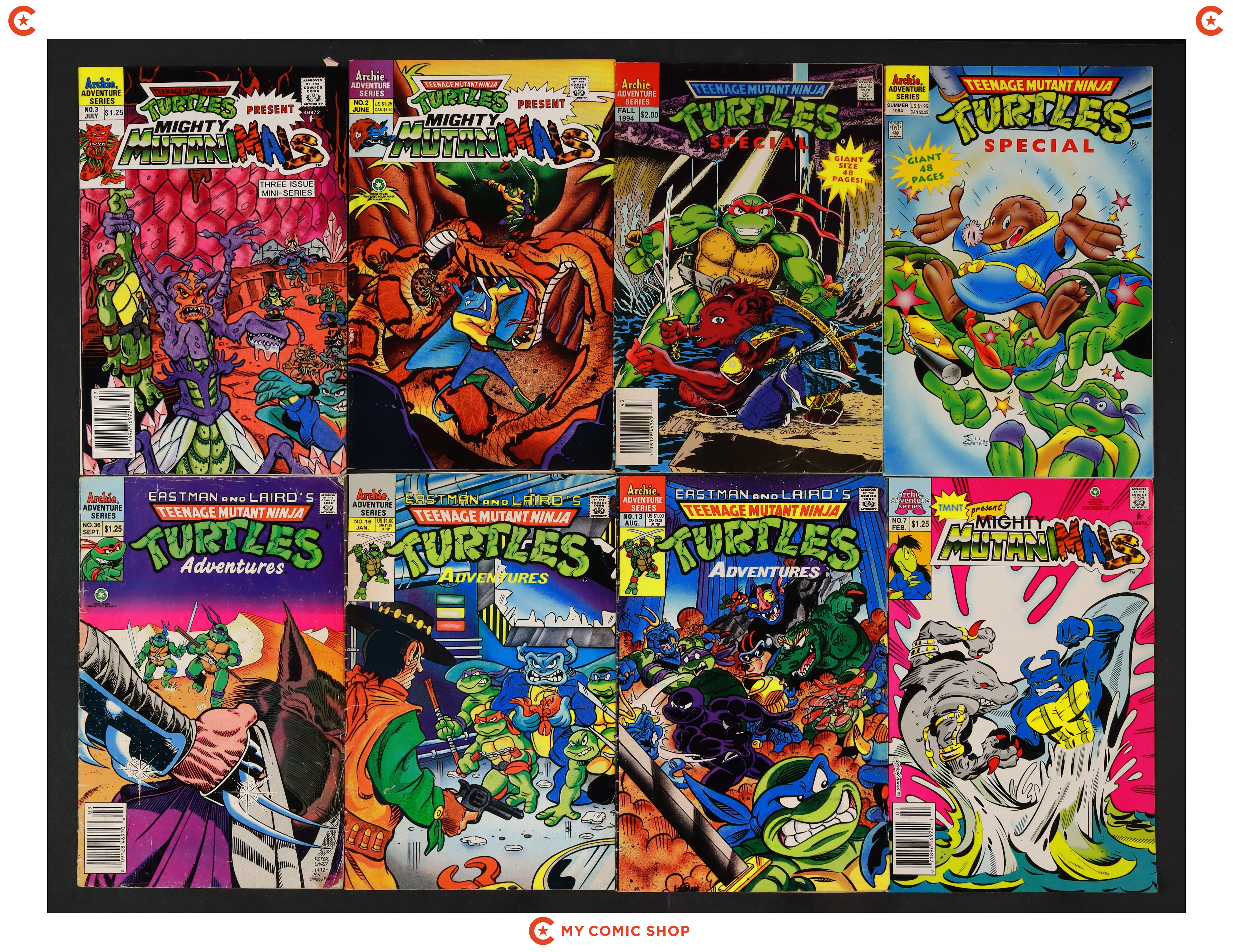 Issues 9, 10 of Teenage Mutant Ninja Turtles Adventures Special (1992 Archie), Issues 2, 3, 7 of Mighty Mutanimals (1992 2nd Series), and issues 13, 16, 36 of Teenage Mutant Ninja Turtles Adventures (1989). Most will grade in the VG to FN range.