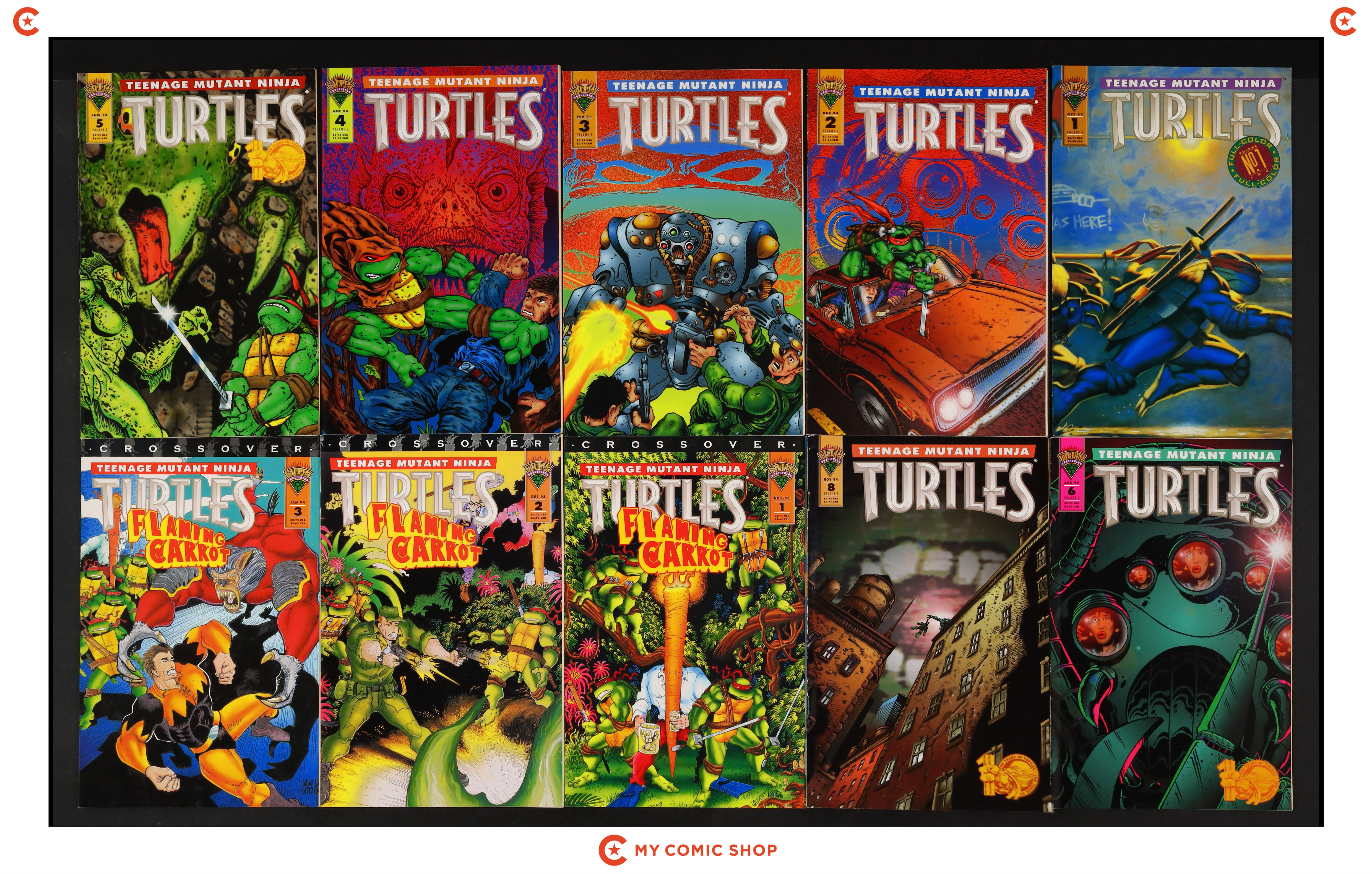 Issues 1-6, 8 of Teenage Mutant Ninja Turtles (1993 Mirage), and issues 1-3 of Teenage Mutant Ninja Turtles Flaming Carrot (1993). Most will grade in the FN range.