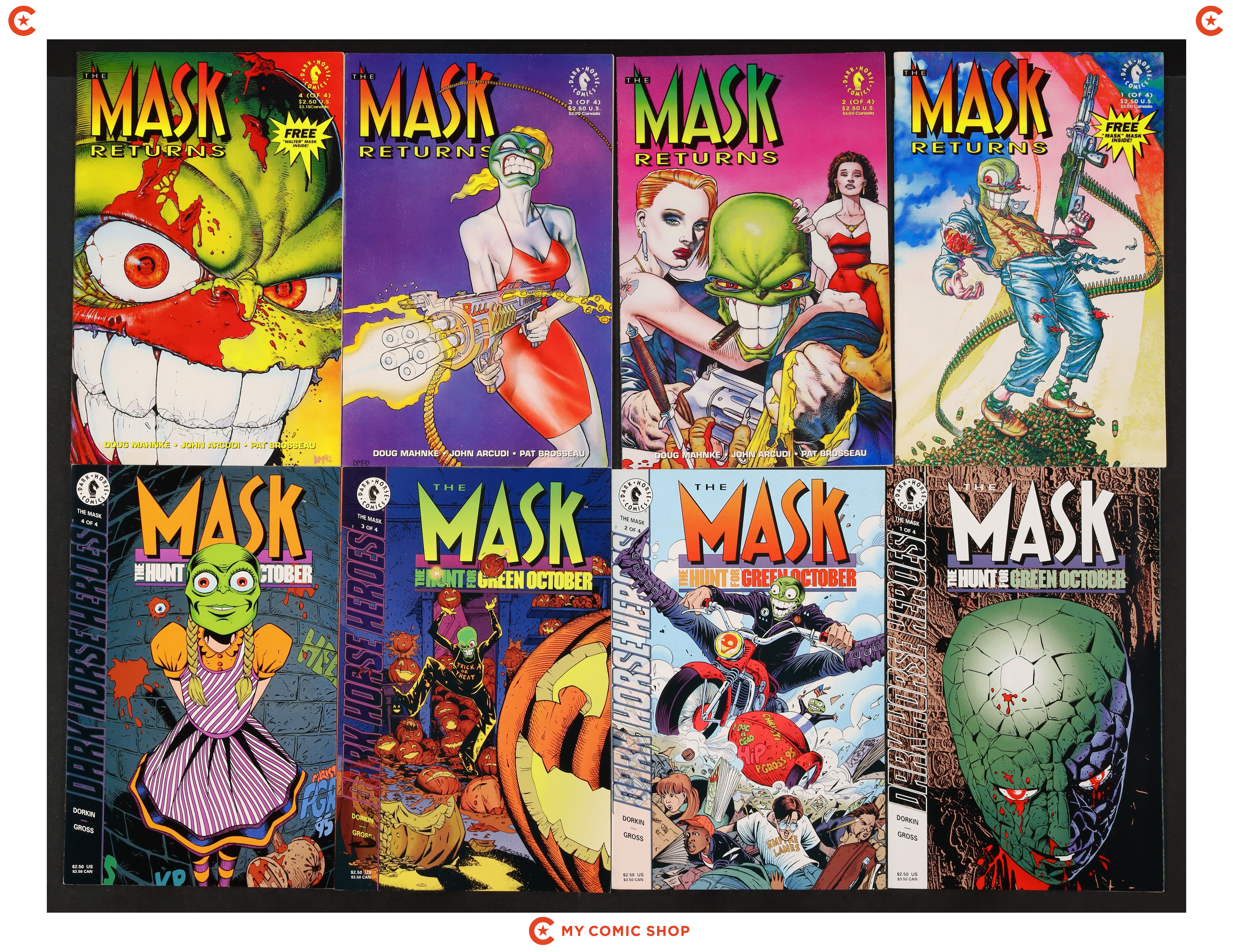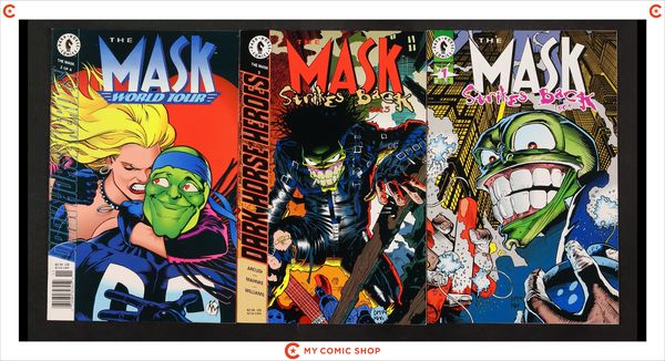 Issues 1-4 of Mask Returns (1992); 1-4 of Mask The Hunt for Green October (1995 Dark Horse); 1 and 3 of Mask Strikes Back (1995); and 2 of Mask World Tour (1995). Most will grade in the VF to FN+ range with #2 of Mask World Tour grading VG+.