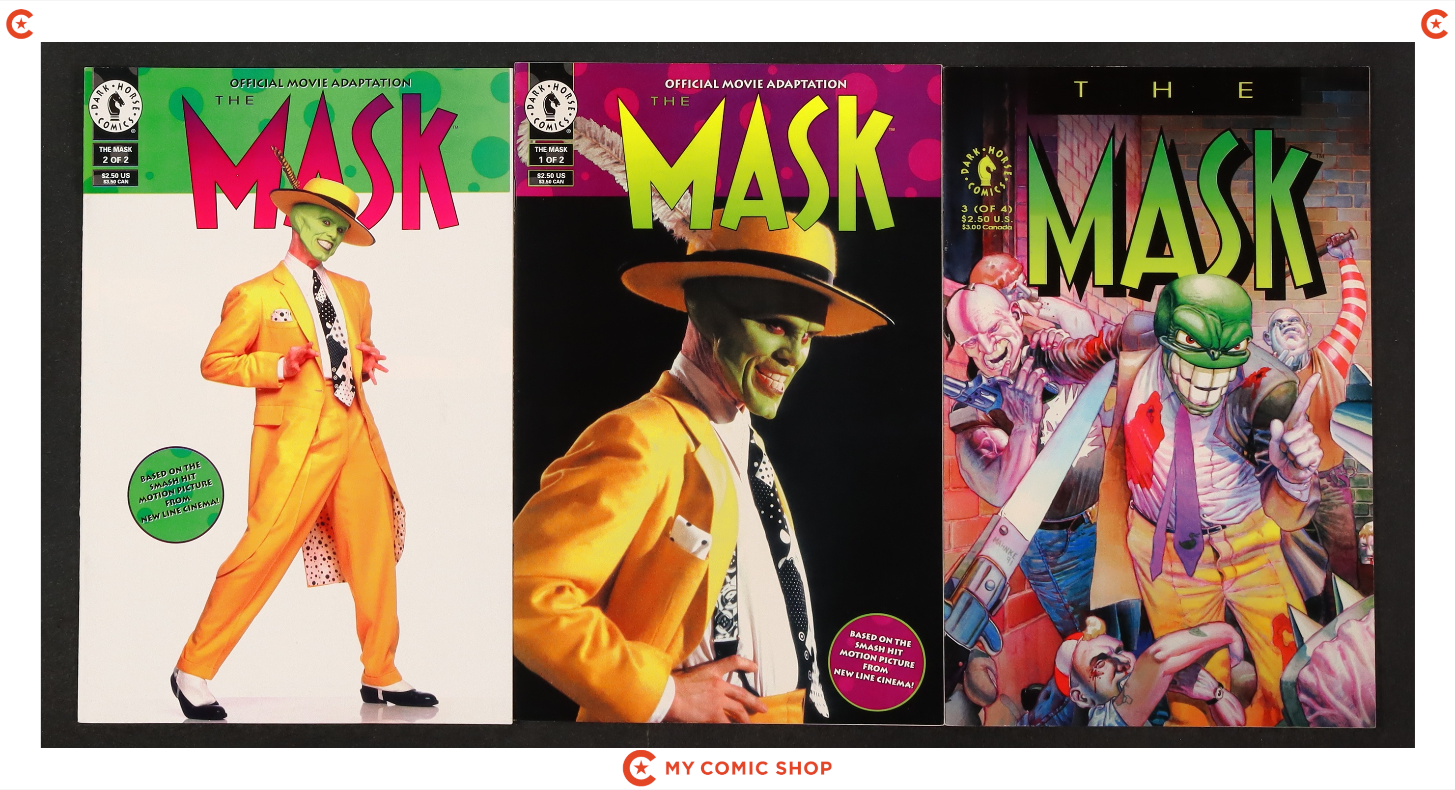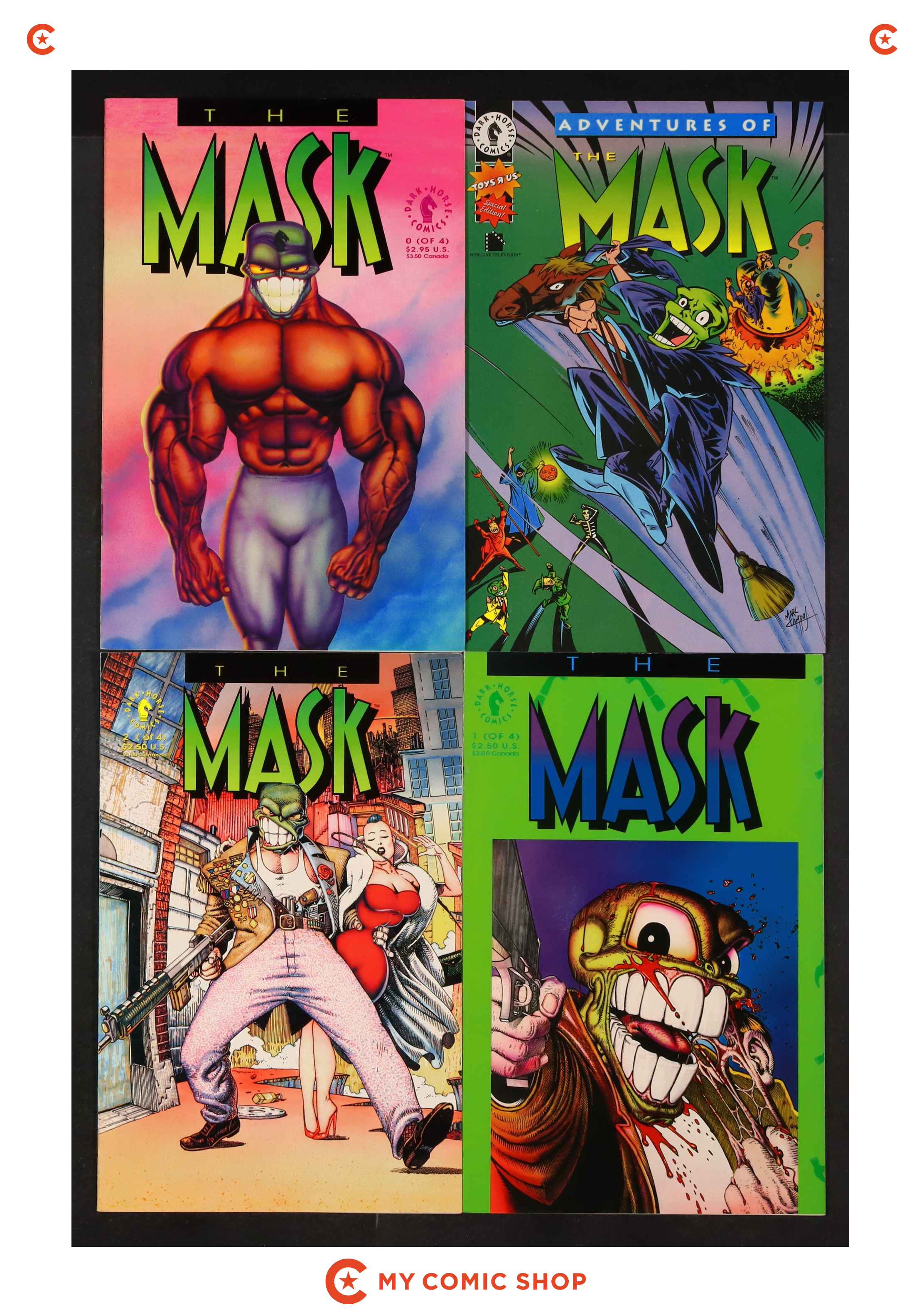 Issues 0 of Adventures of the Mask Toys R Us Special Edition (1996); 0-3 of Mask (1991 Dark Horse); and 1 and 2 of Mask Official Movie Adaptation (1994). Most will grade in the VF range with a couple grading FN.
