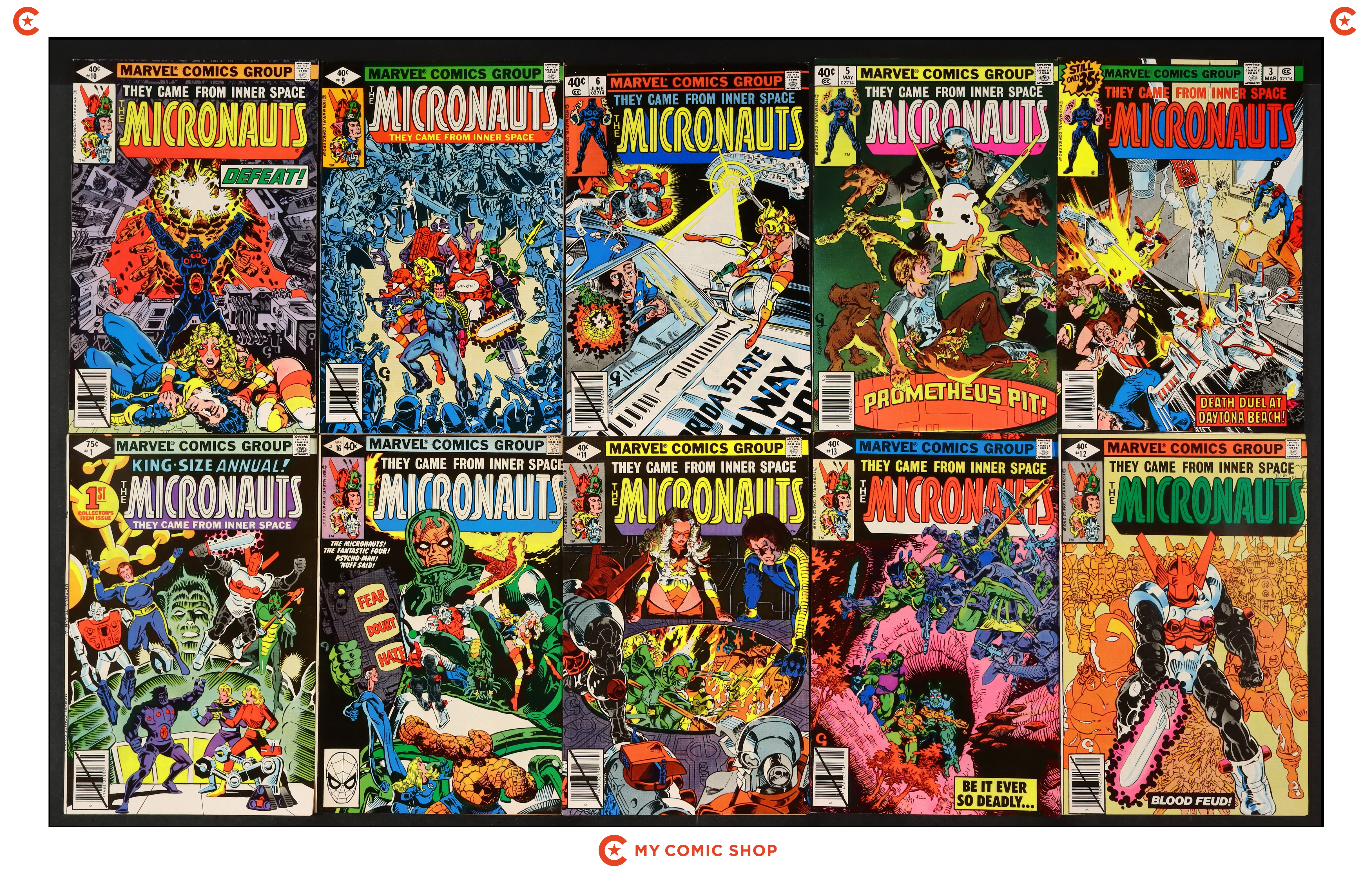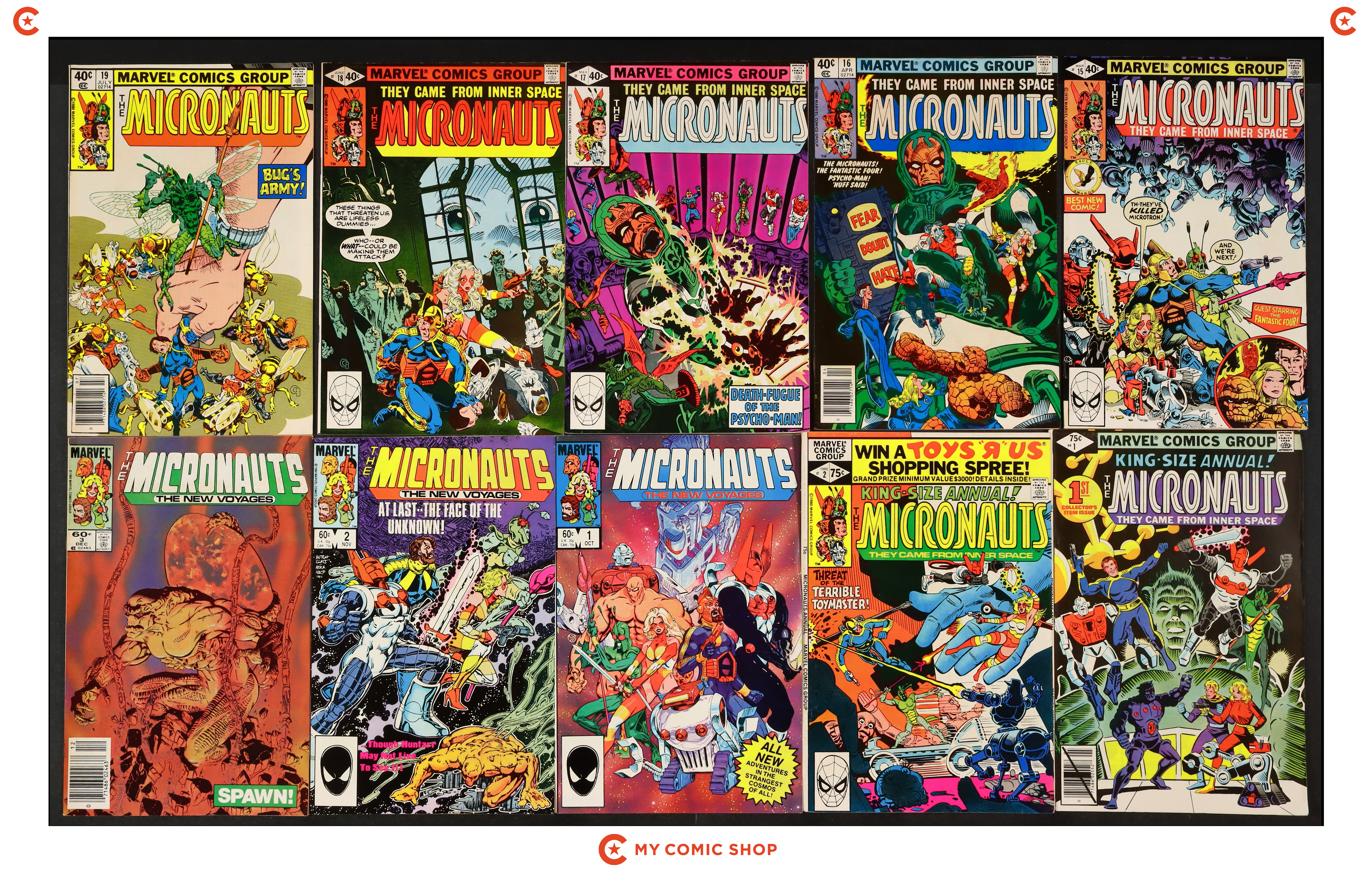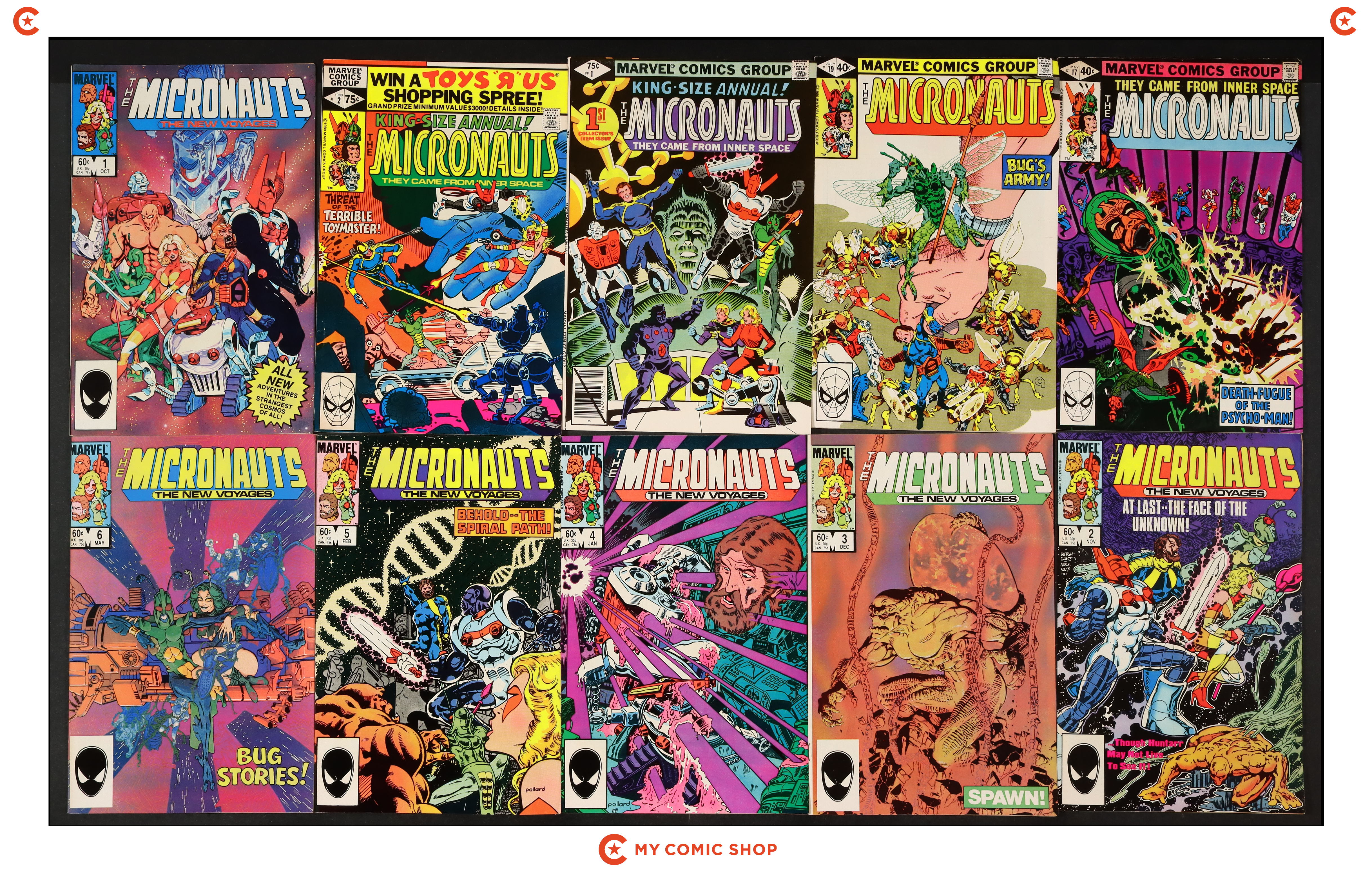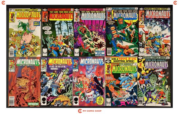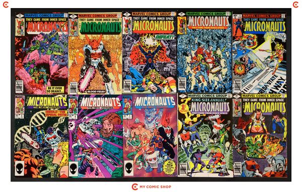 Issues 15, 16, 17, 18, 19; Annual 1, 2 of Micronauts (1979 1st Series); and 1, 2, 3 of Micronauts The New Voyages (1984). Most will grade in the FN- to FN/VF range.
