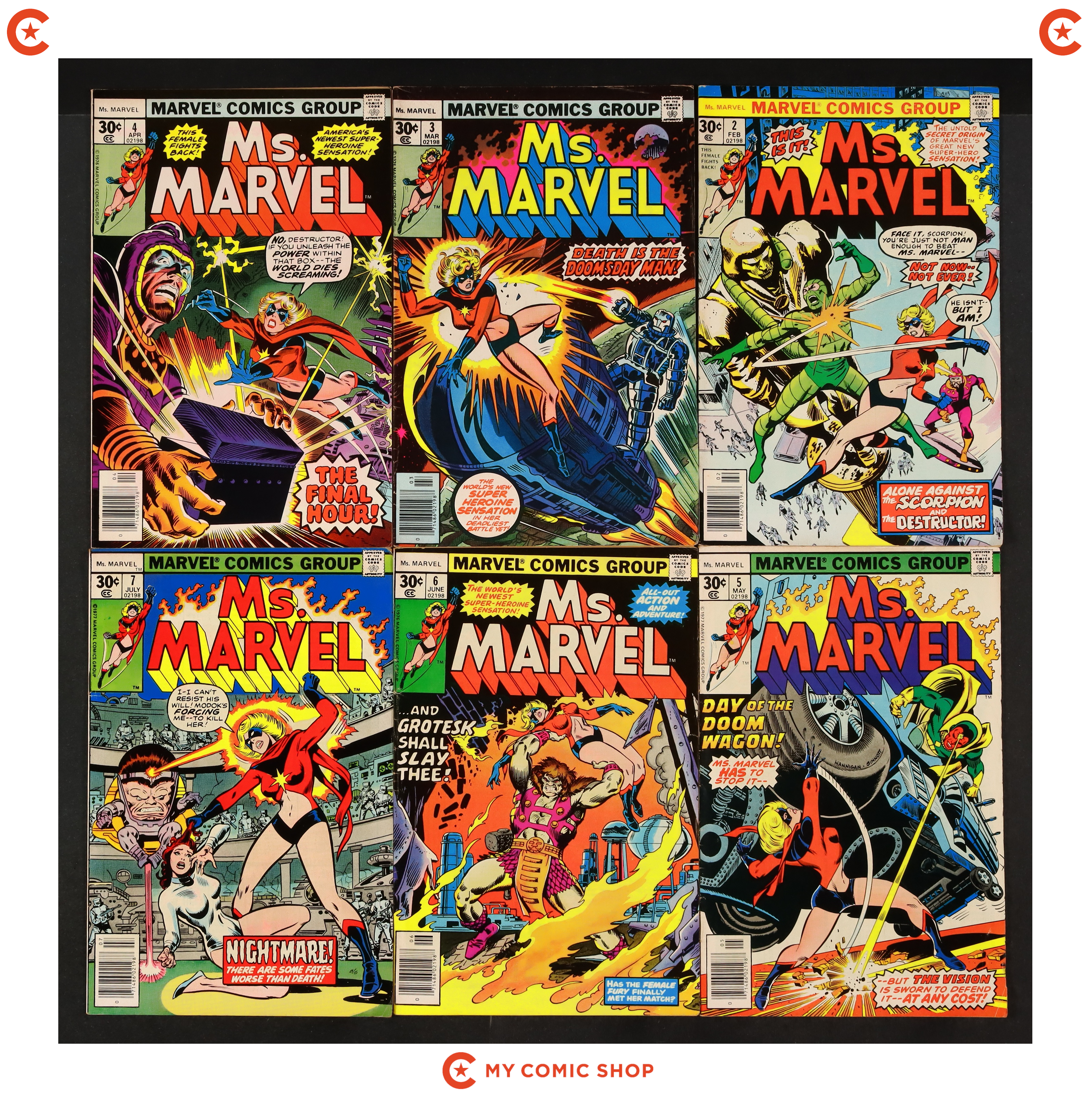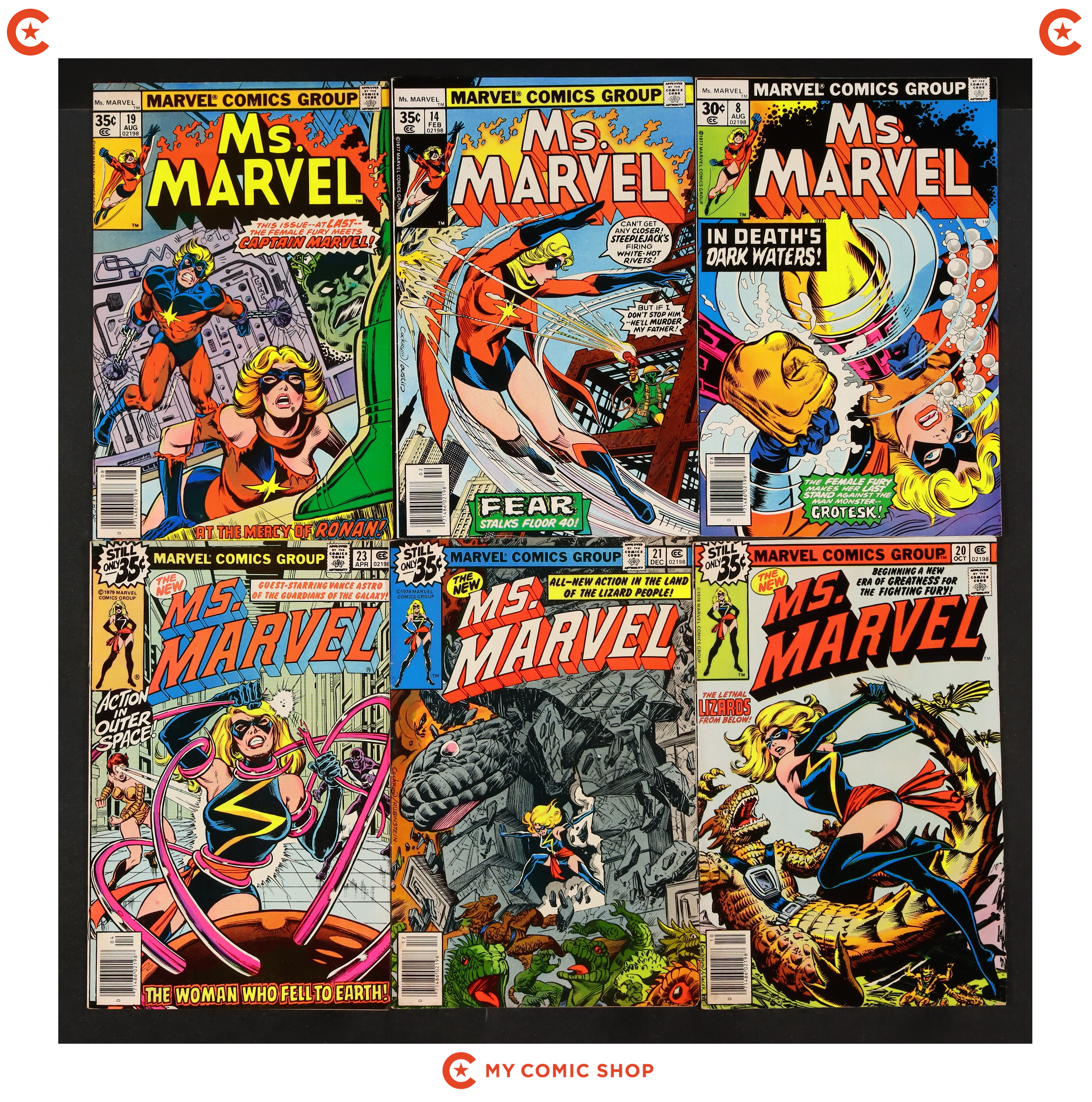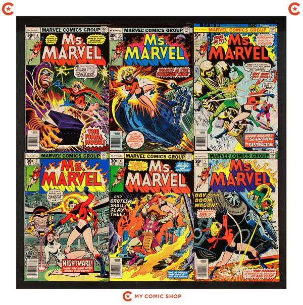 Issues 2, 3, 4, 5, 6, 7, 8, 14, 19, 20, 21, 23 of Ms. Marvel (1977 1st Series). Most will grade in the VG+ to FN+ range.