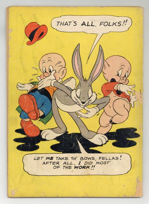Starts Jan 3 Indicia title is "BUGS BUNNY FINDS THE LOST TREASURE, No. 51." Cover art by Carl Buettner. Bugs Bunny Finds the Lost Treasure, art by Carl Buettner; Bugs buys an old sea chest at an auction; In it is a sailor's diary is which he tells of the Zazztec treasure on Happy Pappy Island. A Statue Comes to Life, art by Carl Buettner; Bugs buys some powerful perfume; While visiting the museum he sprays a statue of Hercules, not knowing that a crook is impersonating the statue. Back cover Bugs Bunny strip by Tom McKimson. 52 pages, full color. Cover price $0.10.