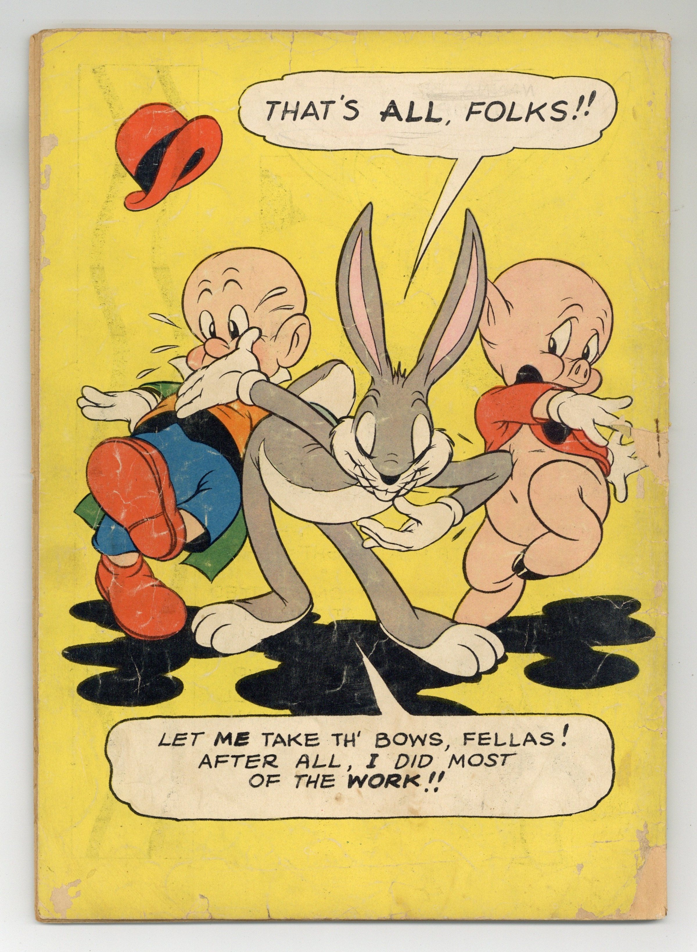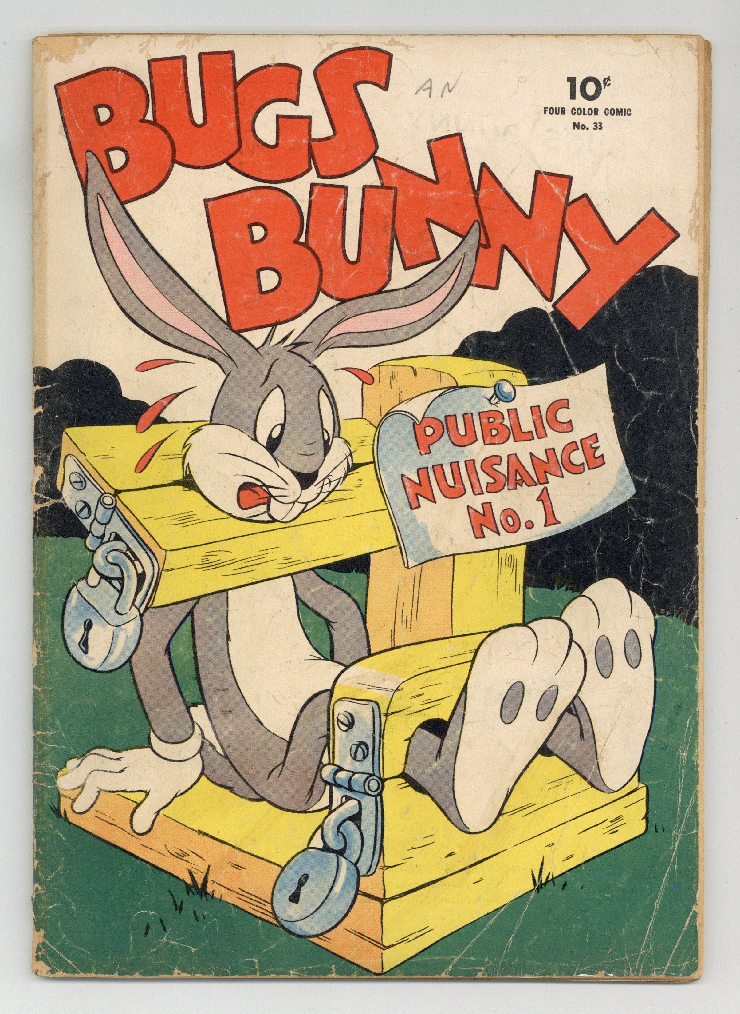 Starts Jan 3 Indicia title is "BUGS BUNNY, No. 33." Cover art by Carl Buettner. Bugs Bunny---Public Nuisance No. 1; Bugs and Hopalong Casserole, the grasshopper, have a contest to see who can be more annoying. Bugs Bunny Tries the Easy Life; Bugs decides that he should get adopted by a rich family; Unfortunately the wealthy man who picks him is more interested in adding him to his list of hunting trophies; He takes Bugs (and Elmer) to an island for a version of "The Most Dangerous Game." Bugs Bunny and the Fang-Toothed Bandit; Petunia's Uncle Ham has disappeared; Porky, disguised as Petunia, and Bugs go to Buzzard Hollow to take charge of Ham's ranch. Activity page—A cut-out with a strip that makes Bugs' eyes go back and forth. Art on all strips by Carl Buettner. 60 pages, full color. Cover price $0.10.