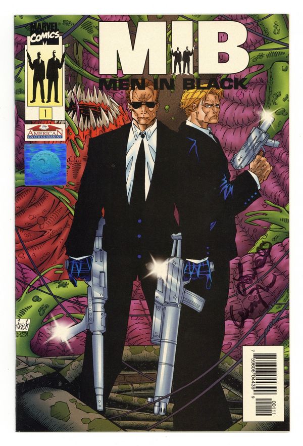 Signed by Lowell Cunningham (Creator & Writer). Includes Wizard Entertainment Certificate of Authenticity. American Entertainment/Marvel Exclusive reprint of the first Men in Black comic (Men in Black (1990 1st Series Aircel) #1) published around the time of the Men in Black film release. "Initiation" written by Lowell Cunningham with art by Sandy Carruthers. B&W, 24 pages, standard paper stock.