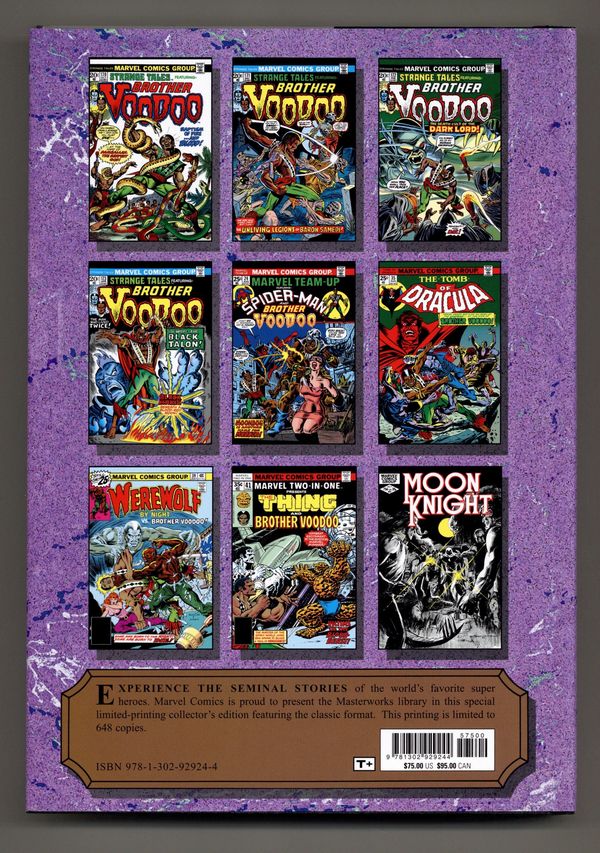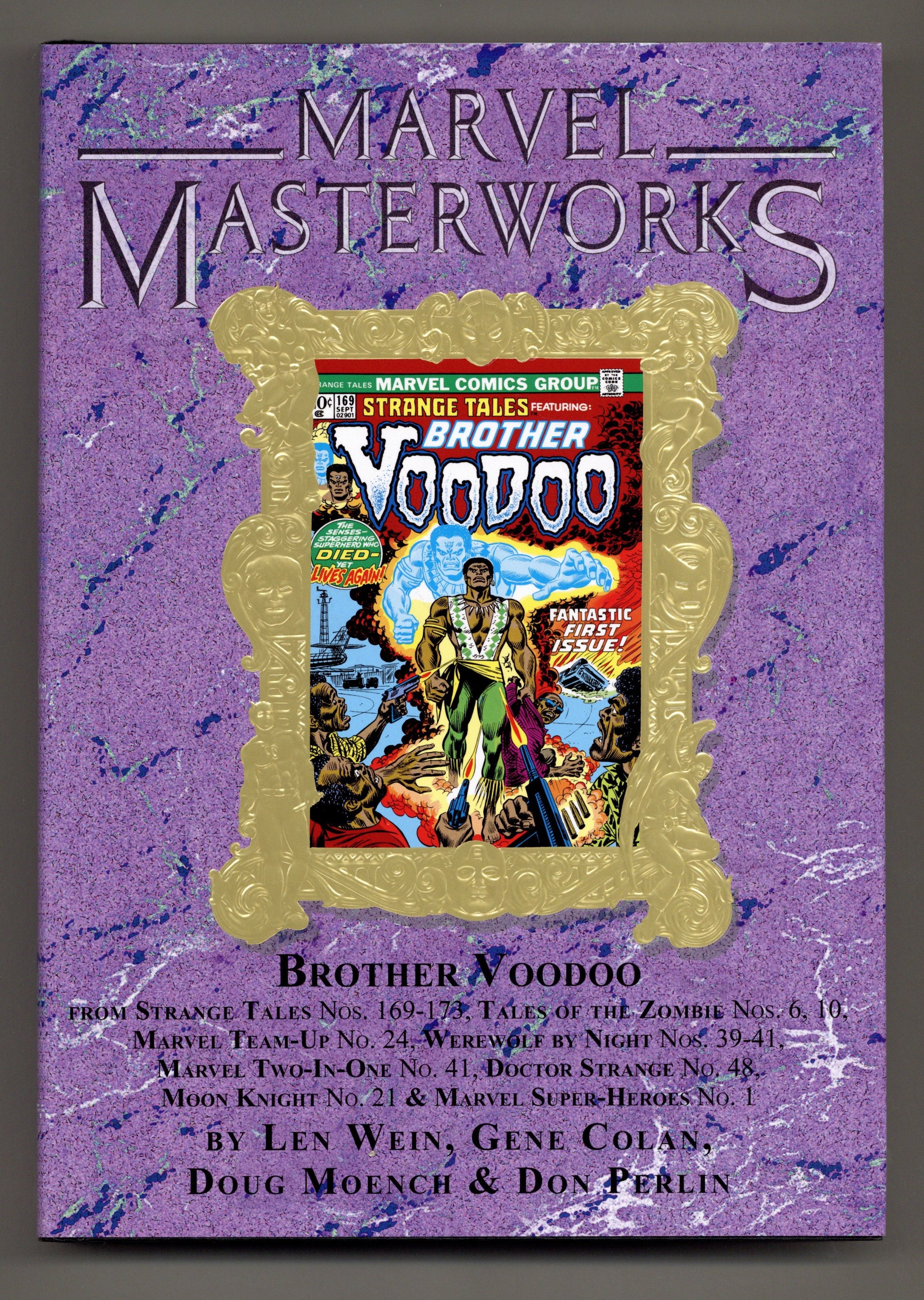 Starts Apr 27 Volume 305 - 1st printing. "Brother Voodoo: Book 1!" Collects Strange Tales (1951-1976 1st Series) #169-173, Marvel Team-Up (1972-1985 1st Series) #24, Werewolf by Night (1972-1977 1st Series) #39-41, Marvel Two-in-One (1974-1983 1st Series) #41, Doctor Strange (1974-1987 2nd Series) #48, Moon Knight (1980-1984 1st Series) #21; material from Tales of the Zombie (1973) Magazine #6 and 10, The Tomb of Dracula (1972-1979 1st Series) #34-37, Werewolf by Night (1972-1977 1st Series) #38, Marvel Super Heroes (1990-1993 2nd Series) #1, and Doctor Strange (1988-1996 3rd Series) #16-17, #20.