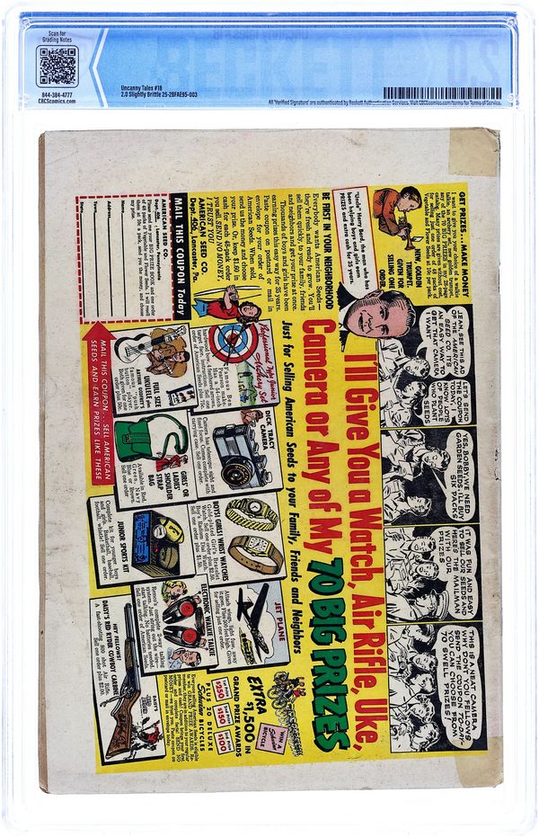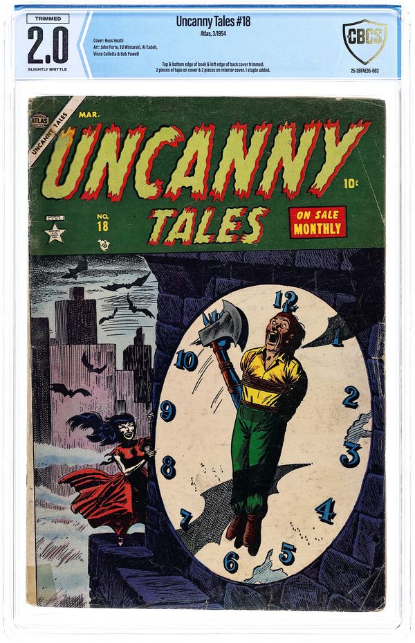 Cover by Russ Heath. Stories by unknown. Art by John Forte, Ed Winiarski, Al Eadeh, Vince Colletta and Bob Powell. The most uncanny tales ever told! In this issue: "One Second Till Doom!" with art by John Forte; "The Last Vampire" with art by Ed Winiarski; "One Little Man" with art by Al Eadeh; "The Machine Age" with art by Vince Colletta; "The Face in the Mirror" with art by Bob Powell; and 2-page text story "A Favor from Satan," reprinted from Astonishing (1951 Marvel/Atlas) #13 (original title: "The Demon of Disaster"). 32 pages, full color. Cover price $0.10.