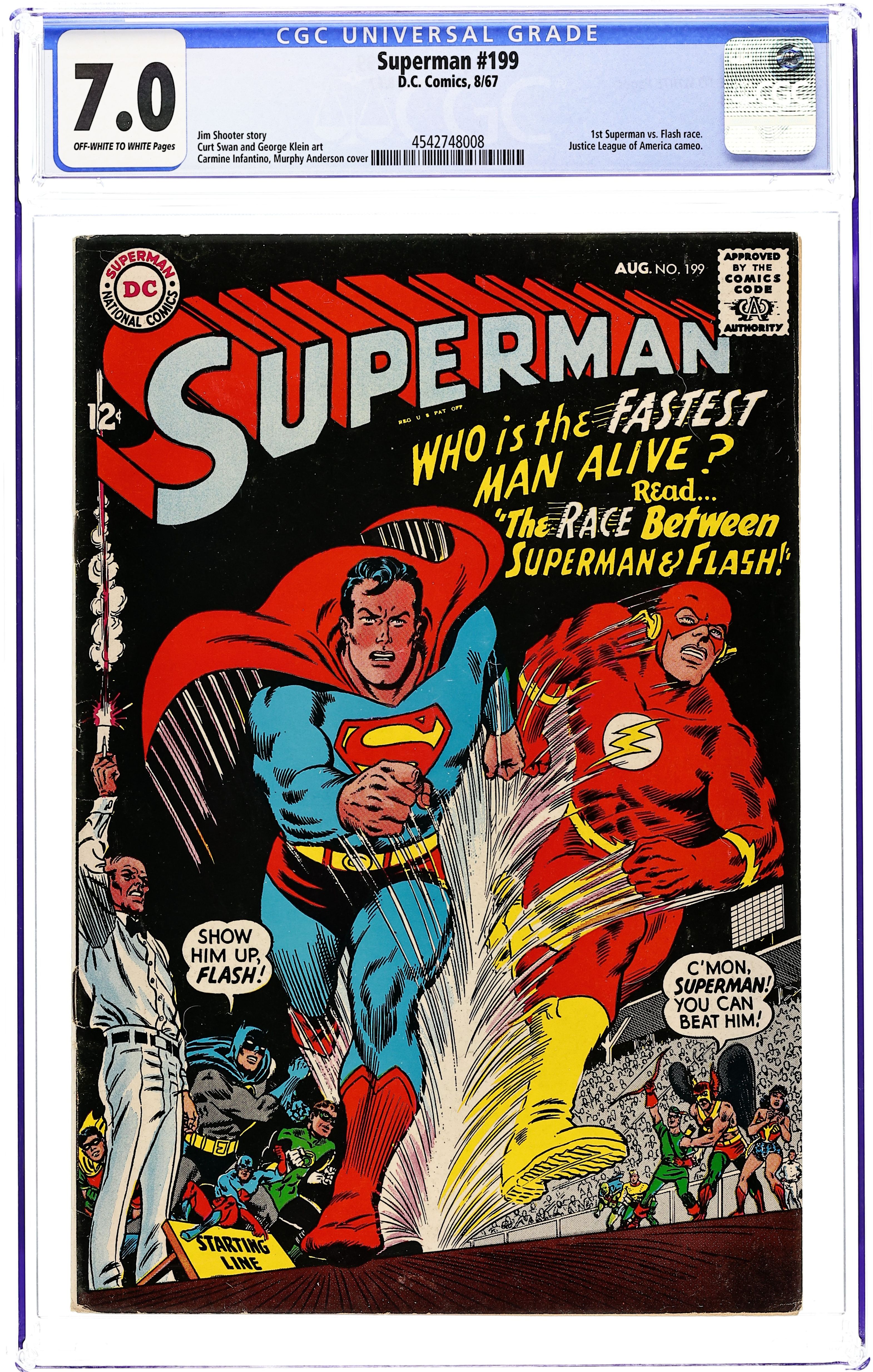 1st Superman vs. Flash race. Cover pencils by Carmine Infantino, inks by Murphy Anderson. Superman's Race With the Flash!, script by Jim Shooter, pencils by Curt Swan, inks by George Klein; a very close race by the two fastest super-heroes; brief Justice League appearance; the first Superman/Flash race. 36 Pages, Full Color. Cover price $0.12.