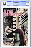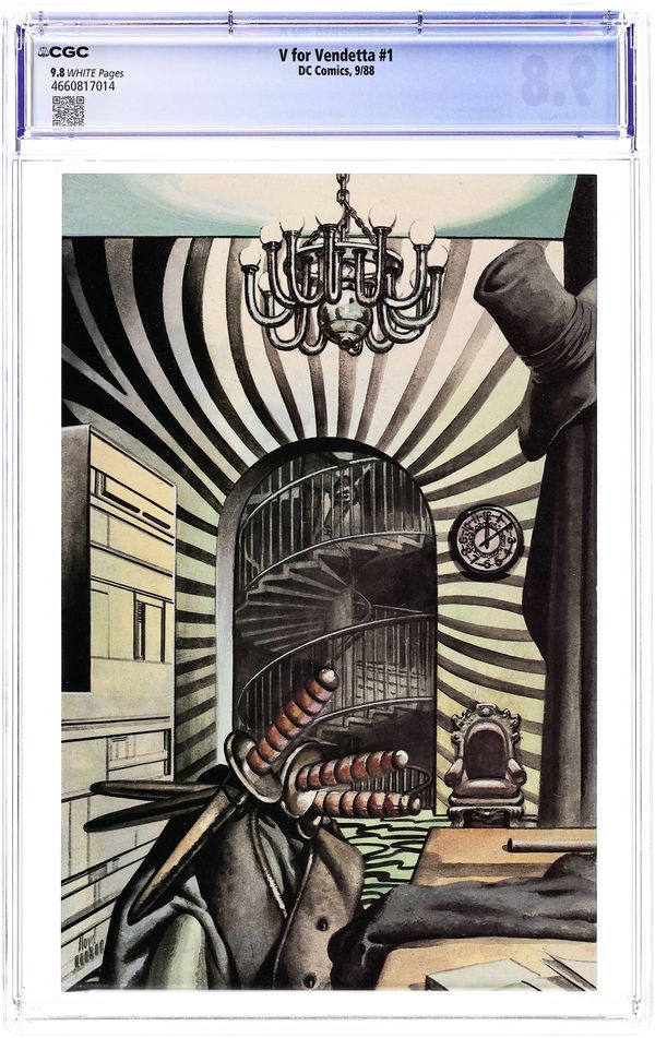 Part 1 of 10. The time is 1997. The place is Great Britain... and things have never been worse. It's a time of brooding darkness, chilling despair and oppressive tyranny. The time for V for Vendetta. Who is the mysterious V? Is his wrath aimed at the fascist rulers gripping Britain in their iron grasp...or are his motives more complex than any reasonable person can hope to understand? Welcome to the dark world of Alan Moore and David Lloyd's downbeat thriller, originally published in black and white in the British weekly comics magazine Warrior. Now, presented for the first time in this country, V for Vendetta debuts in full color. V for Vendetta is a 10-issue Deluxe Format maxi-series, featuring all the original episodes from Warrior and, beginning with the eighth issue, all-new material and the long-awaited finale by series creators writer Alan Moore and artist David Lloyd. David will also be coloring V for Vendetta for its Deluxe Format debut, as well as providing all-new covers. Suggested for Mature Readers. Cover price $2.00.