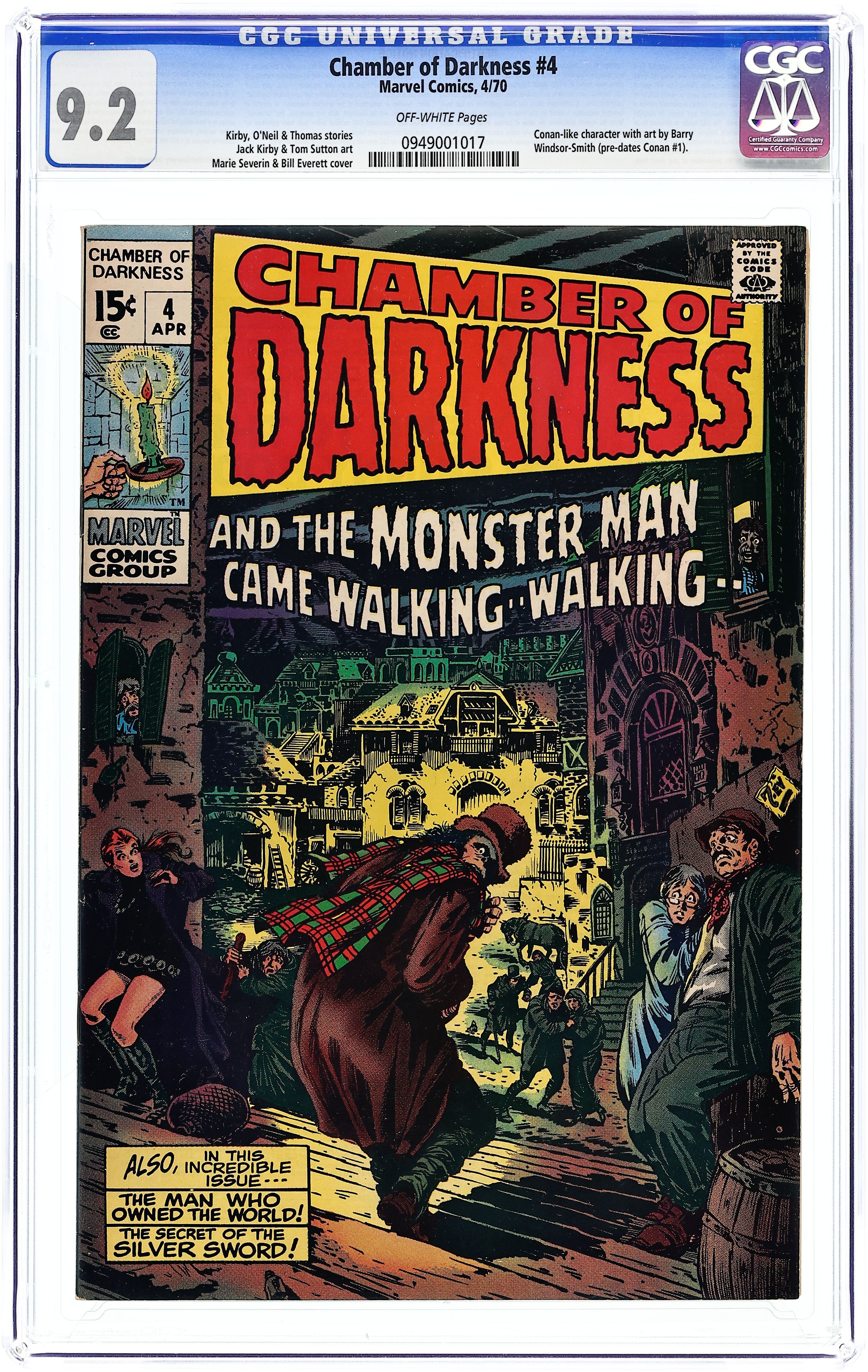 Cover pencils by Marie Severin (signed) [as 7EV], inks by Bill Everett (signed) [as 7EV]. The Monster, script and pencils by Jack Kirby, inks by John Verpoorten; A wealthy, ugly, and lonely man is believed to be a monster by the ignorant people of his village. The Man Who Owned the World, script by Denny O'Neil and Tom Sutton (plot), art by Tom Sutton; A greedy billionaire crashes the world economy to finance a scientist to send him into the future, where a horrible surprise awaits him. The Sword and the Sorcerers!, script by Roy Thomas, art by Barry Windsor-Smith [as Barry Smith]; Novelist Len Carson plans to write one final story in his popular sword and sorcery series to kill off the protagonist, Starr the Slayer, but his creation comes to life and kills him in self-defense; This is a Conan-esque story Windsor-Smith did to prepare for his work on Conan the Barbarian. Cover price $0.15.