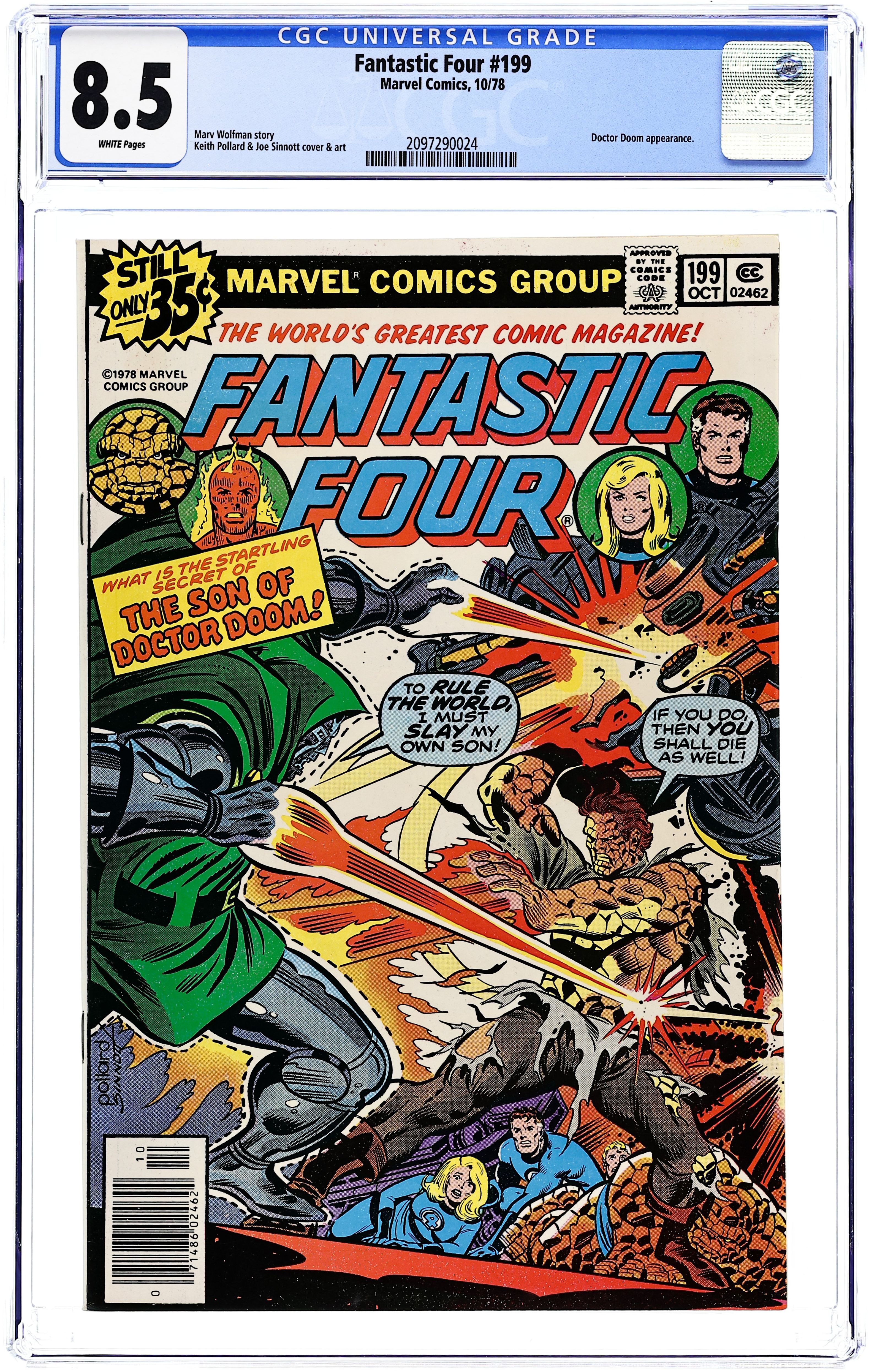 "The Son of Doctor Doom!" Script by Marv Wolfman. Art by Keith Pollard (breakdowns) and Joe Sinnott (finishes). Cover by Keith Pollard and Joe Sinnott. The FF are helplessly imprisoned in Dr. Doom's transference globes while their powers are transferred into the body of Victor Von Doom the second! While the transfer takes place, the people's rebellion, lead by Zorba, grows outside Doom's castle! It looks like the invincible Doctor Doom is in supreme control, but when the Fantastic Four break out, Zorba breaks in, and Doom's son breaks down...the good doctor is under attack from all sides! 36 pages Cover price $0.35.