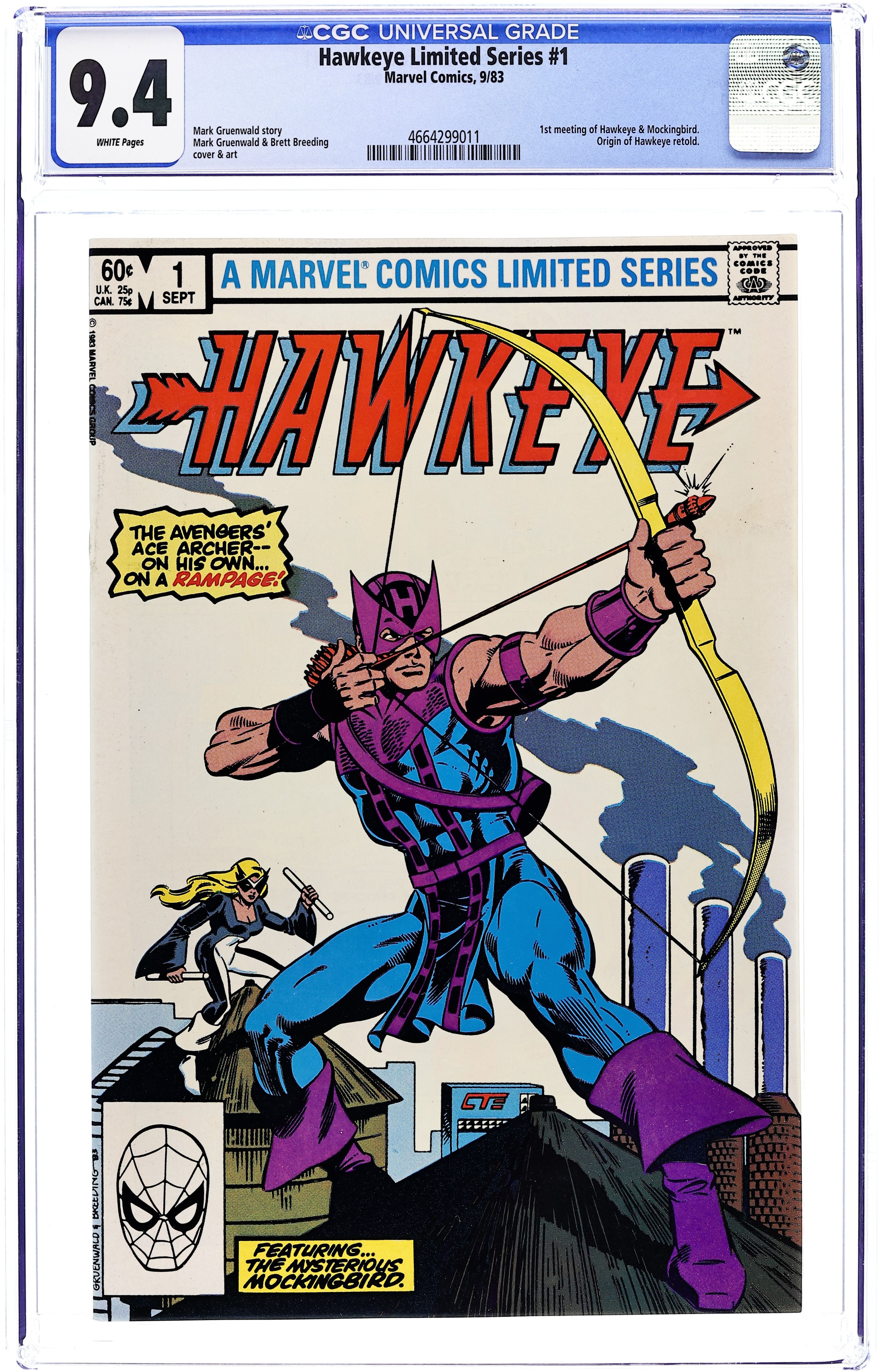 Canadian Edition with 75ยข Cover Price - Avenger and ace archer Hawkeye gets his own limited series as well as a new rocket-sled. In this first issue, Hawkeye tells his girlfriend, Sheila Danning, his origin story, and then battles Mockingbird. Written and drawn by Mark Gruenwald, with inks by Brett Breeding. 32 pages, FC. Cover price $0.75.