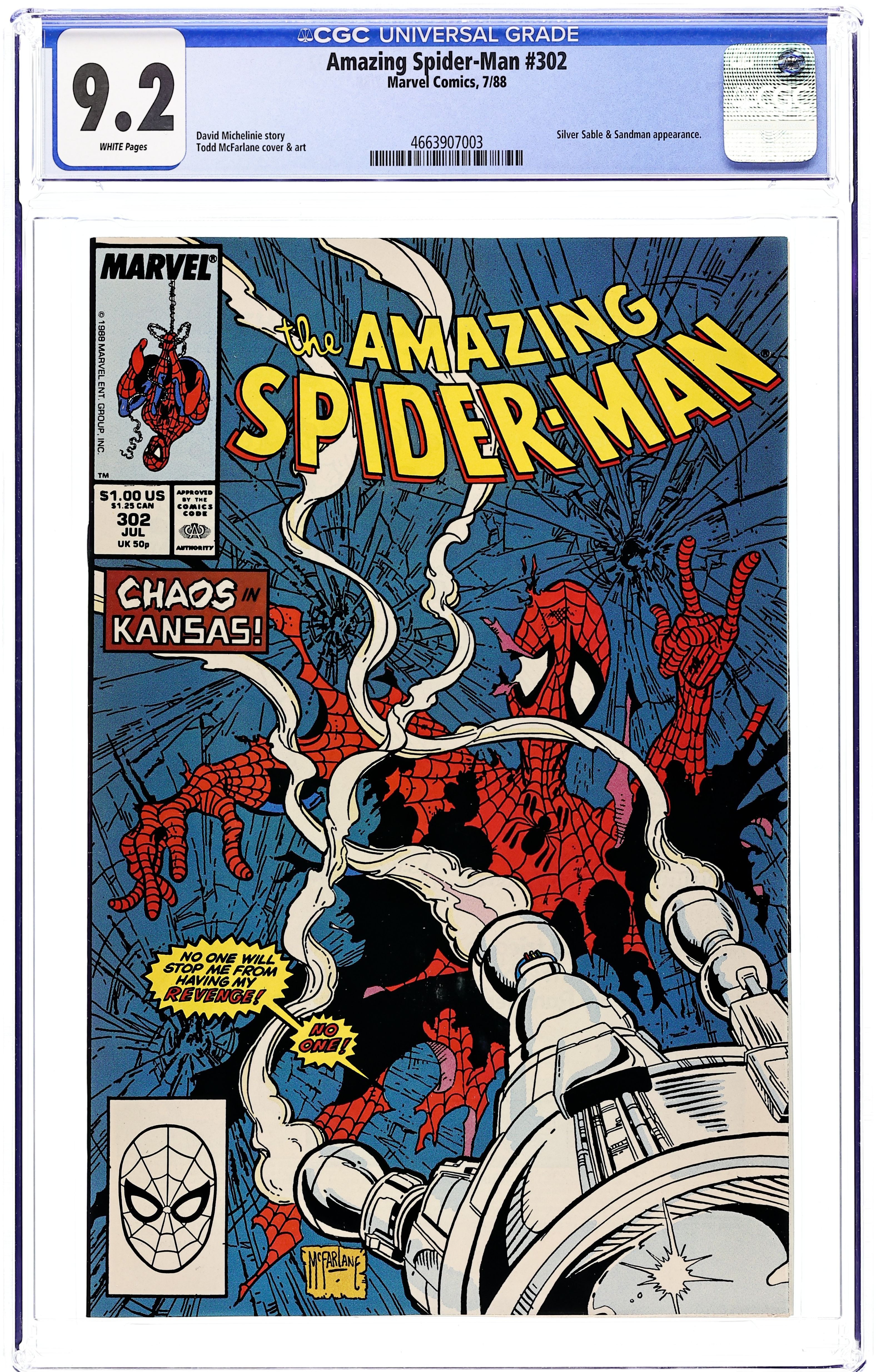 Direct Edition. "(Mid) American Gothic!" Script by David Michelinie. Art by Todd McFarlane. Cover by Todd McFarlane. Peter Parker receives a job offer from a high tech company in Kansas! So, Spider-Man's alter-ego travels to America's heartland to tour the company's facilities! But upon arrival Peter discovers that there's something rotten in the sunflower state! Good thing the web-slinger made the trip too! Cameo appearances by Mary Jane Watson, Silver Sable, and the Sandman. (Note: This issue includes a full-page ad for the Evolutionary War saga that ran through Marvel's 1988 annuals.) 36 pgs. Cover price $1.00.