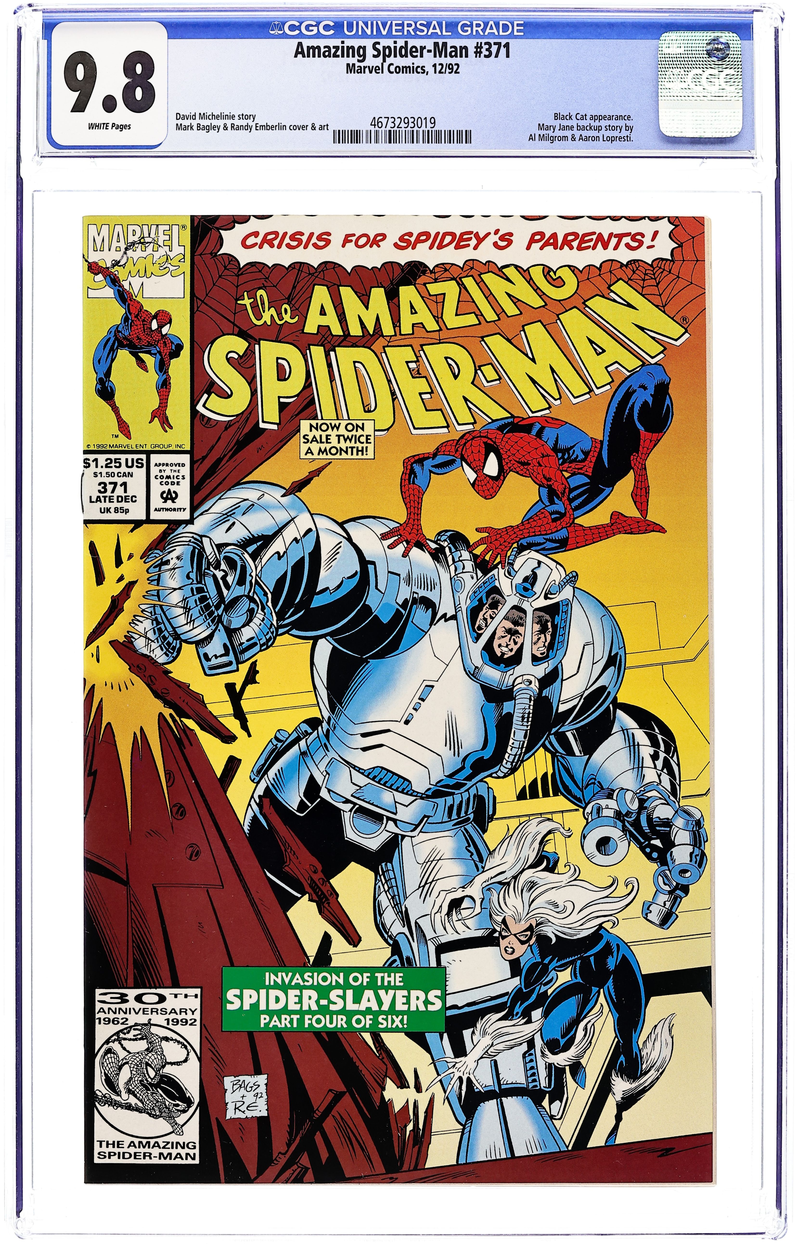 Direct Edition. "On Razored Wings" Invasion of the Spider-Slayers Part 1 of 6. Script by David Michelinie. Pencils by Mark Bagley. Inks by Randy Emberlin. Cover by Mark Bagley and Randy Emberlin. Peter and Mary Jane take Peter's parents (and Aunt May) on a tour of Manhattan! The Parkers haven't seen the big city in more than 20 years! And thanks to the sudden appearance of a spider-slayer robot, Richard and Mary's visit includes a dazzling display from the wondrous wall-crawler! How awesome! Spider-Man makes short work of the spider-slayer, but where did it come from and who sent it? Cameo appearances by Alistair Smythe, J. Jonah Jameson, Ben Urich, and Felicia Hardy. Backup story: "Cashing In" Script by J.M. DeMatteis. Art for Aaron Lopresti. Peter and JJJ come to blows when Jonah wants to run an exclusive story about Peter's parents. Appearance by Joe Robertson. (Notes: Alistair Smythe previously appeared in Amazing Spider-Man 292. The Amazing Spider-Man title was published bi-monthly for the next 5 issues. This six-part story was reprinted in 1995 in the trade paperback: Spider-Man -- Invasion of the Spider-Slayers.) 36 pages. Cover price $1.25.