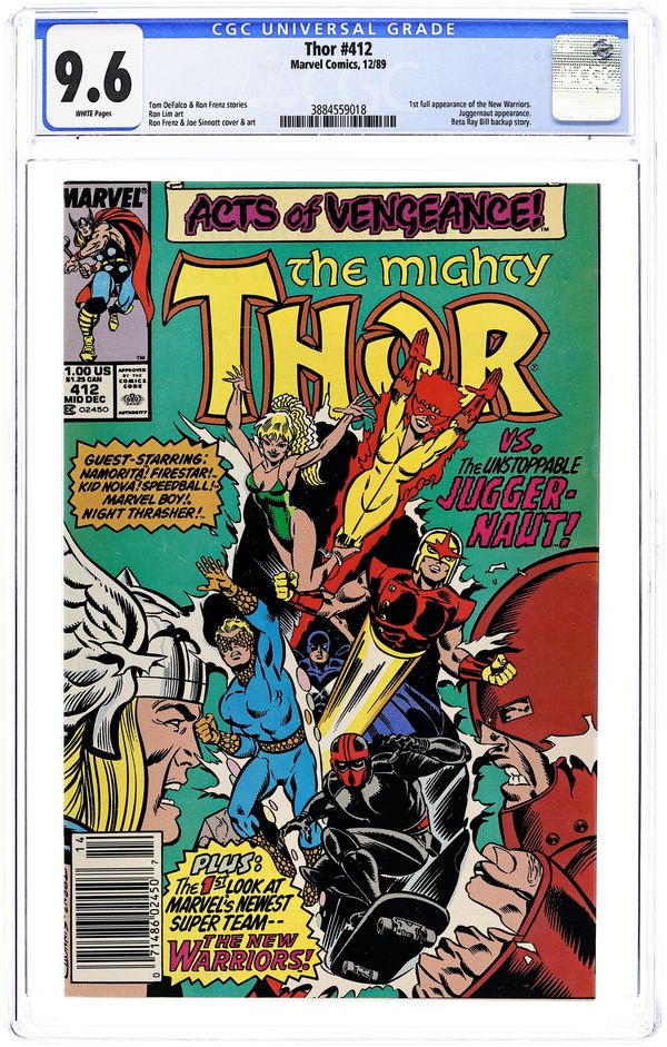 Newsstand Edition. Cover pencils by Ron Frenz, inks by Joe Sinnott. Acts of Vengeance crossover. First full appearance of the New Warriors in "Introducing the New Warriors," script by Ron Frenz (Co-plot) and Tom DeFalco, pencils by Ron Frenz (layouts), inks by Joe Sinnott (finished art); With Thor down for the count, the New Warriors arrive and battle the Juggernaut; Thor recovers his strength and joins the fray as he and the kids are finally able to banish Juggy to another dimension. Beta Ray Bill back-up, "Freedom Is Only A Choice Away," script by Tom DeFalco, pencils by Ron Lim, inks by Mike DeCarlo; Bill has been trapped and is being used to help power a spaceship that feeds off of psychic energy; When the people of his race are threatened, however, he breaks free and faces Captain Orack. 36 pgs., full color. $1.00. Cover price $1.00.