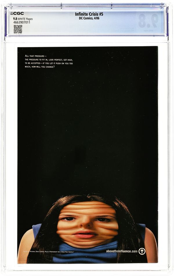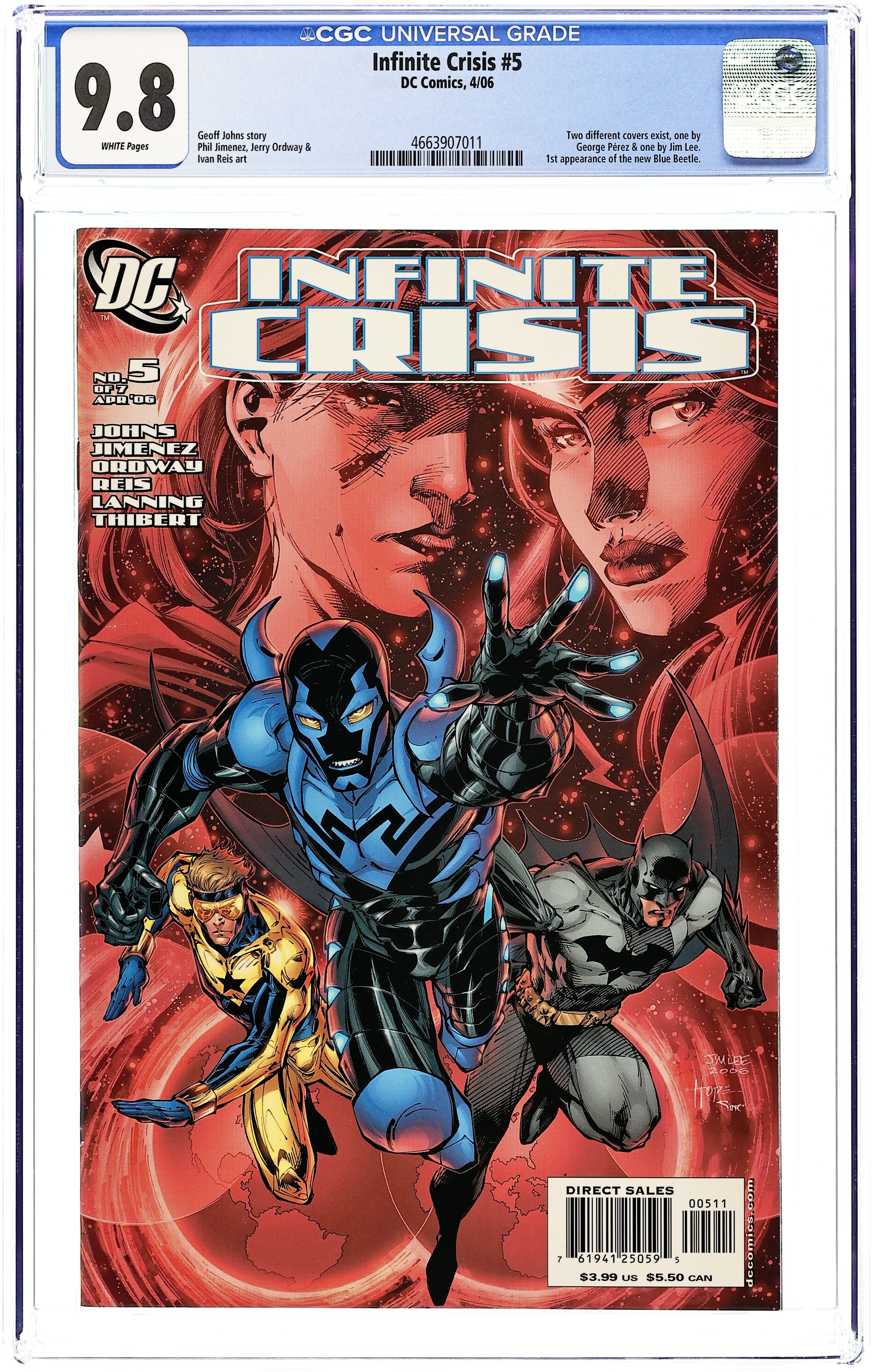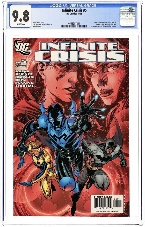 Jim Lee Cover - Written by Geoff Johns Art by Phil Jimenez & Andy Lanning. Covers by Jim Lee & Sandra Hope and George Pérez. 1st costumed appearance of the third Blue Beetle. (for 1st appearance as Jaime Reyes, see Infinite Crisis #3). The DCU shakes apart as Superman of Earth 2 finally confronts our Superman. Meanwhile, heroes are disappearing throughout the DC Universe, a transformed villain returns, and the mystics of every world and dimension seek help from the very Spirit that is destroying them. Retailers please note: This issue will ship with covers by Lee & Hope (approximately 50%) and Pérez (approximately 50%). On sale February 15 ? 5 of 7 ? 40 pg, FC, $3.99 US Cover price $3.99.