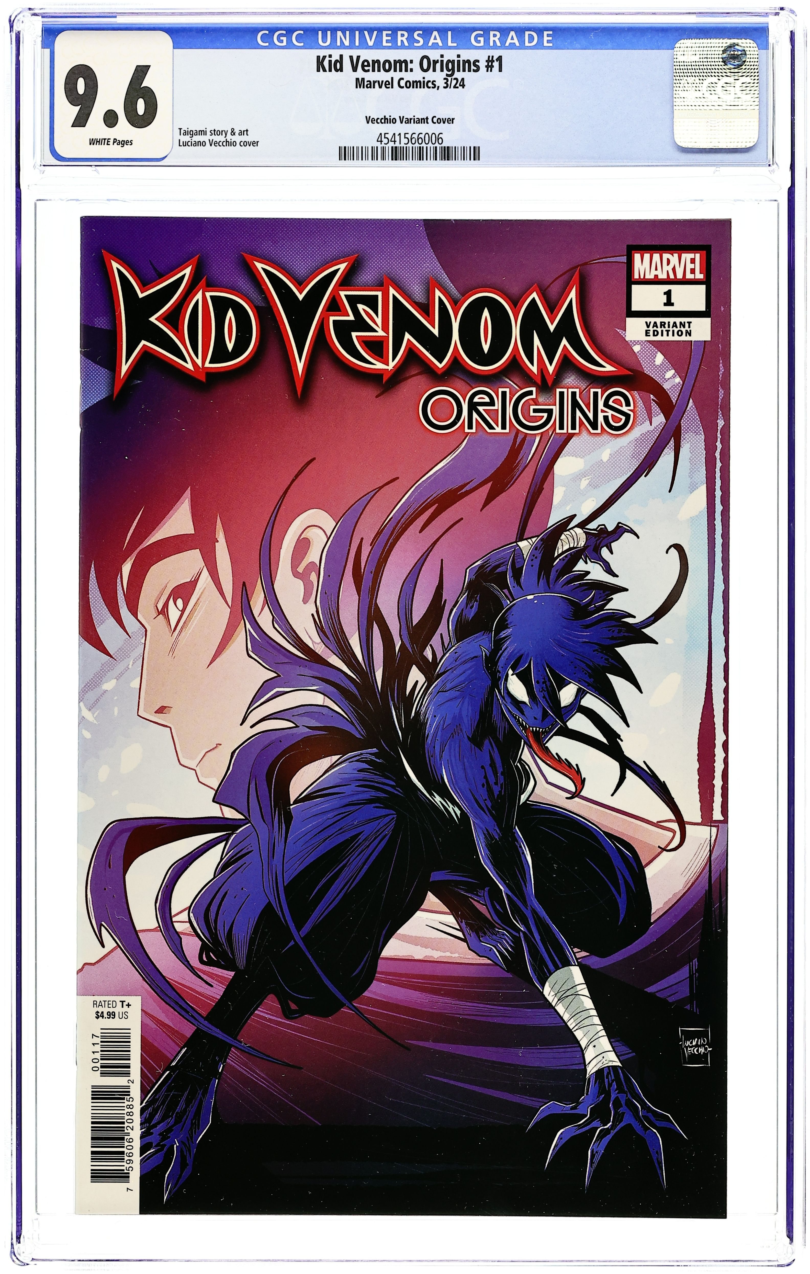 Variant Cover by Luciano Vecchio. Issue will be unbagged for grading. Written and Art by Taigami. THIS IS KID VENOM! For the first time collected in one issue, the full four parts of KID VENOM from DEATH OF THE VENOMVERSE! Also, behind-the-scenes content never before seen, including the original work that brought Taigami to Marvel! Plus: A glimpse at what the future holds for KID VENOM! 32 pages, full color. Rated T+ Cover price $4.99.