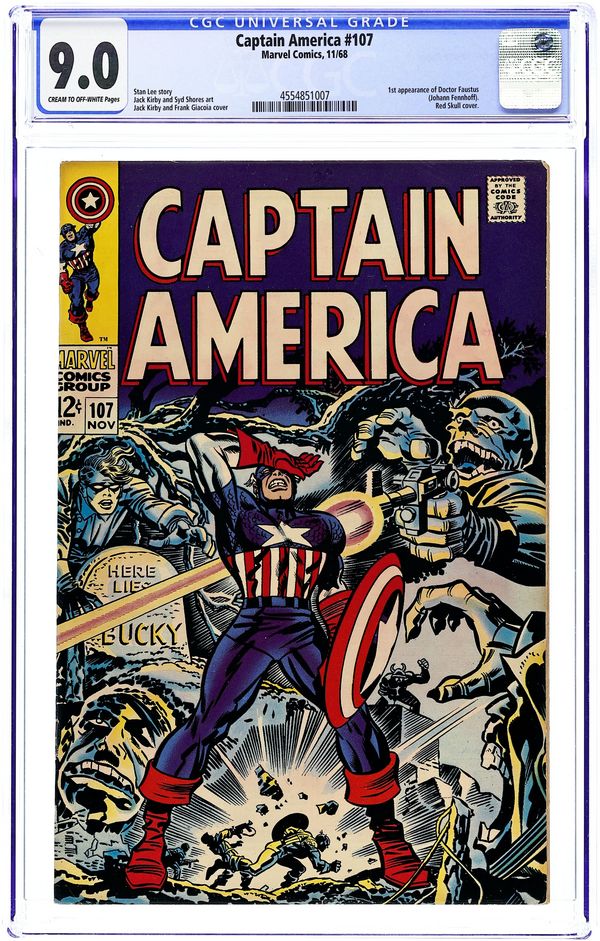 Cover pencils by Jack Kirby, inks by Frank Giacoia. Cap faces Dr. Faustus (first appearance) in "If the Past Be Not Dead," script by Stan Lee, pencils by Jack Kirby, inks by Syd Shores; Captain American keeps dreaming that hes being chased by demonic looking Nazi soldiers; Cap comes across the grave of his old sidekick Bucky Barnes; Cap calls his psychiatrist Dr. Faustus to tell him that he keeps having the same dream; Cap battles Dr. Faustus; Cameos by the Red Skull and Bucky Barnes. Letter to the editor from comics historian Peter Sanderson Jr. 36 pgs., full color. $0.12. Cover price $0.12.