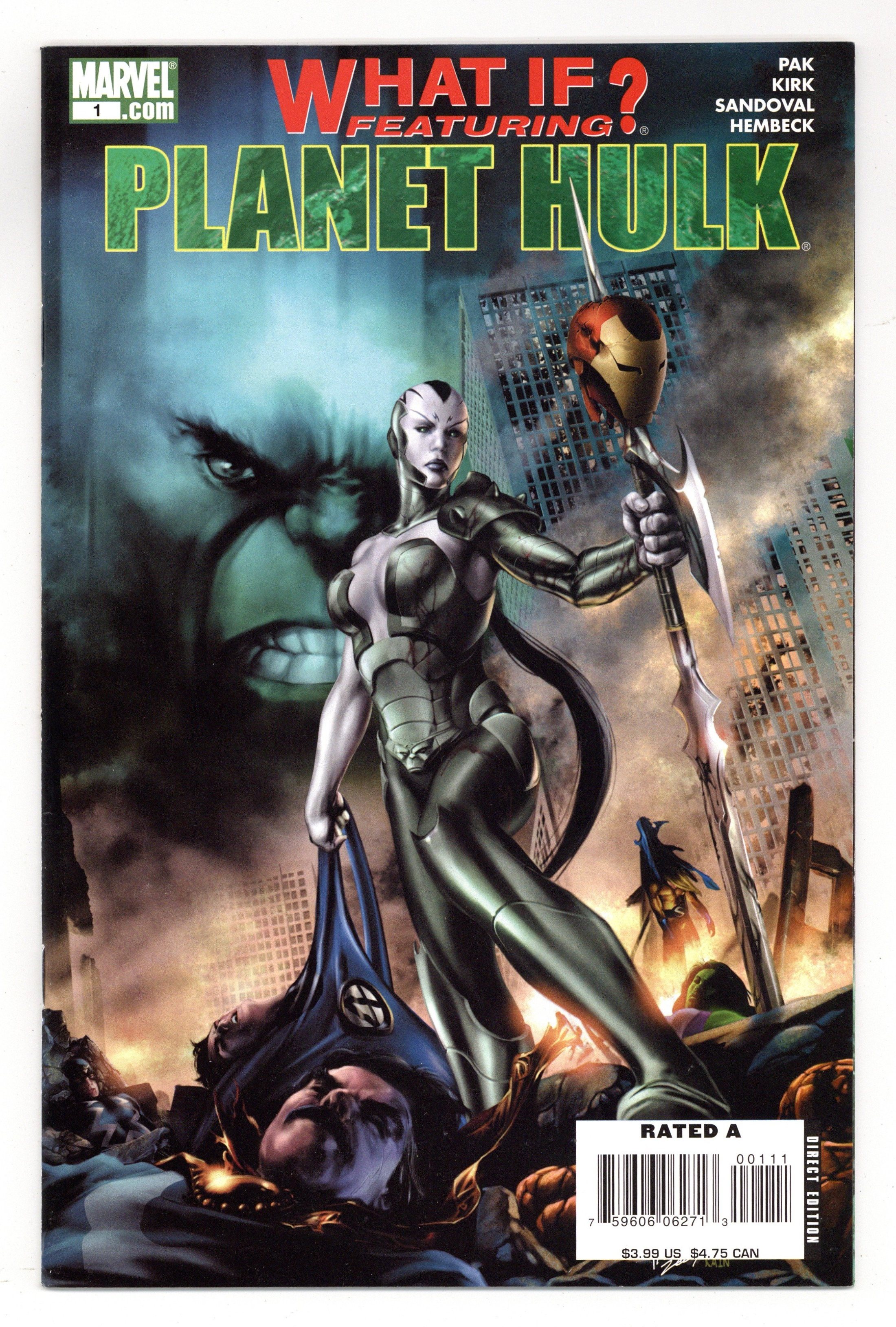 Written by GREG PAK. Penciled by LEONARD KIRK, RAFA SANDOVAL & FRED HEMBECK. Cover by CARLO PAGULAYAN. Last year, a group of Marvel heroes decided the Hulk was too dangerous for Earth, tricked him into a shuttle, and shot him into space. After the Hulk rose from slave to gladiator to conquering emperor on the savage planet of Sakaar, the shuttle exploded - destroying the Hulk's people and his pregnant queen. And the entire Marvel Universe knows what happened next as the Hulk returned to wreak his terrible vengeance in the pages of 'World War Hulk.' But what if the Hulk had landed on the peaceful planet the Marvel heroes originally intended? What if Banner had landed on Sakaar instead of the Hulk? And what if the Hulk's warrior bride Caiera the Oldstrong had come to Earth seeking vengeance instead of her husband? Get ready for three shocking tales of what could have been from the writer of the 'Planet Hulk' and 'World War Hulk' epics. Cover price $3.99.
