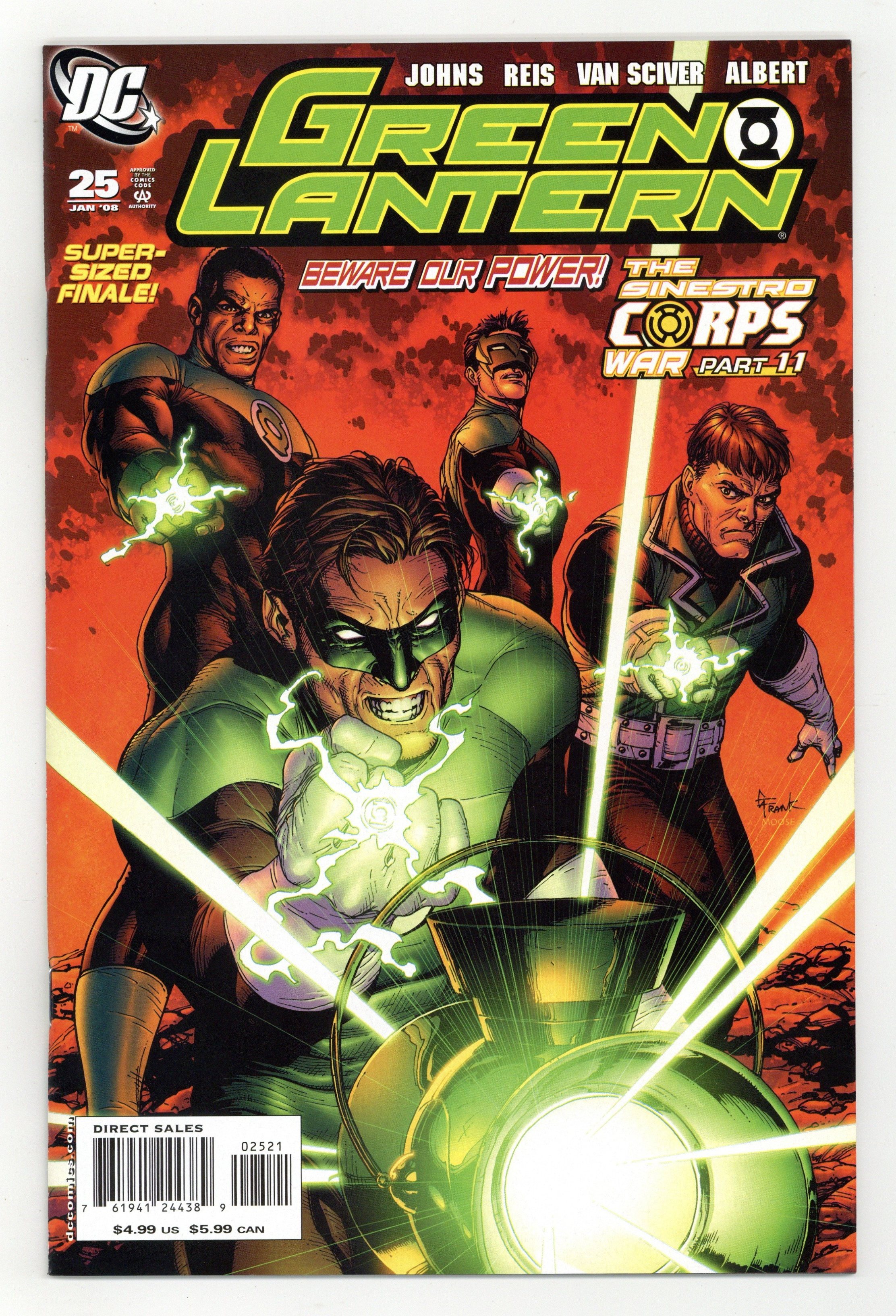 Llimited Edition Variant cover by Gary Frank. Sinestro Corps War: Part 11 - Written by Geoff Johns Art by Ivan Reis, Ethan Van Sciver & Oclair Albert This is it! The most talked-about storyline of the summer, 'The Sinestro Corps War,' concludes in this double-sized anniversary issue! Why does Sinestro believe he has won? How will Hal Jordan stop his greatest enemy? What is the truth behind the prophecy of 'The Blackest Night'? Where will the end results of this battle take the Green Lantern Corps? What is the bizarre fate of the Anti-Monitor? Why has Earth been assigned so many Green Lanterns? Learn all the secrets! Witness all the battles! Prepare yourself for the startling ending of the greatest epic in the history of Green Lantern! Cover price $4.99.