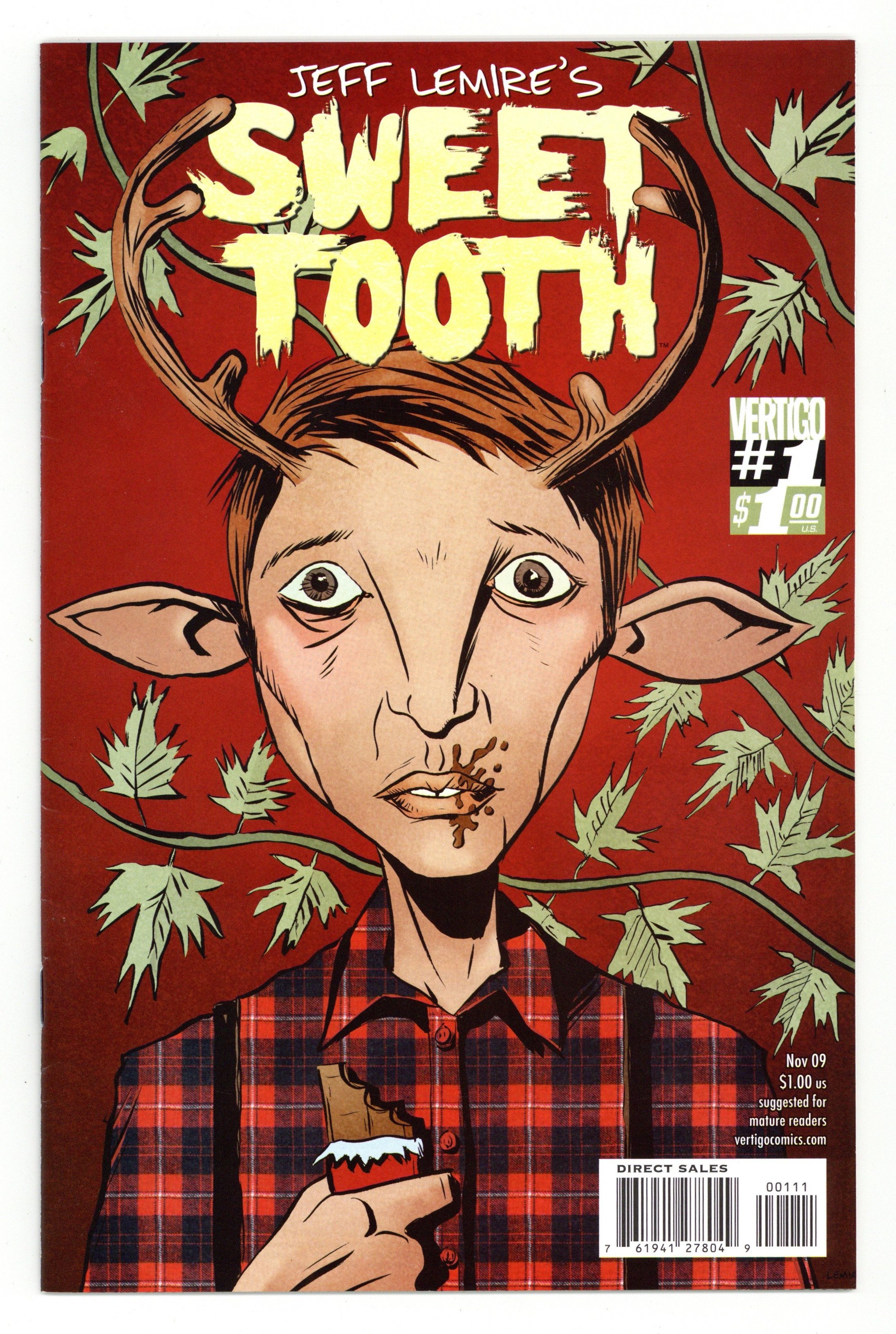 Story, Art and cover by Jeff Lemire. From out of the deep woods and the mind of acclaimed indie cartoonist Jeff Lemire (THE NOBODY, The Essex County Trilogy) comes a new Vertigo monthly ongoing series like no other! After being raised in total isolation, Gus - a boy born with deer-like antlers - is left to survive in an American landscape devastated a decade earlier by an inexplicable pandemic. Even more remarkable is that Gus is part of a rare new breed of human/animal hybrid children who have emerged in its wake, all apparently immune to the infection. Enter Jepperd, a violent, hulking drifter who soon takes in Gus and promises to lead him to 'The Preserve,' a fabled safe-haven for hybrid children. Along the way they'll have to contend with science militias, deadly scavengers, rival bounty hunters, and hybrid worshipping cultists as they fight to make it to safety and solve the mysteries of this deadly new frontier. This bizarre and haunting new series is boldly written and illustrated by Eisner-nominated creator Jeff Lemire and elegantly colored by fellow Eisner nominee Jose Villarubia. A little boy with antlers, a big man with guns, a world without hope32 pages, full color. MATURE READERS. Cover price $1.00.