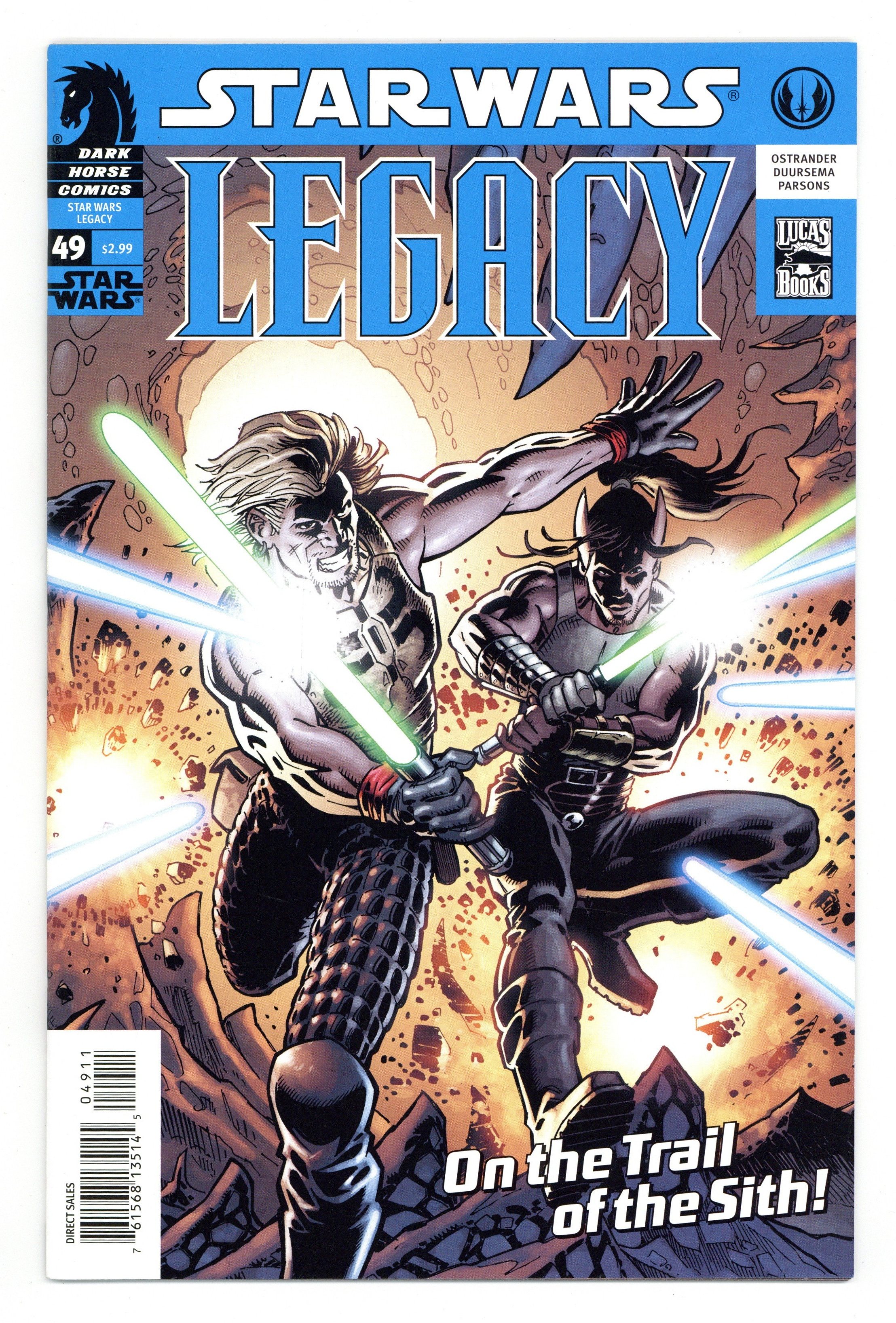 Tags: Star WarsPublished Jun 2010 by Dark Horse.$17.00STAR WARS: LEGACY #49-EXTREMES part 2 (of 3) John Ostrander (W), Jan Duursema (P), Dan Parsons (I), Brad Anderson (C), and Chris Warner (Cover) On sale June 30 FC, 40 pages $2.99 Ongoing The Sith Empire's strike against the Hutt temple on Napdu brings a new ally into the war against the Sith, lending strength to Cade Skywalker's vendetta. On Korriban, Princess Sia Fel, a prisoner of the Sith, learns a shocking secret about the man she loves. And, emboldened by their success against the Mon Calamari and the Hutts, the Sith plan an attack against Admiral Gar Stazi and the Galactic Alliance. There's no stopping the galaxy's descent into all-out war. The end is near! Cover price $2.99.