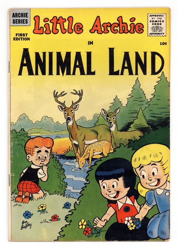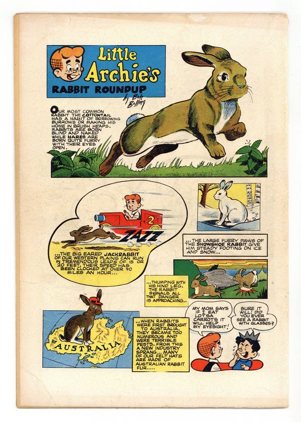 NOTE: #1 - one-shot, #17-#19 continued from Lil Jinx (1956). Cover art by Bob Bolling. Foreword in which Little Archie introduces the comic and a photo of the series creator, Bob Bolling, hard at work sketching animals, art by Bolling. "Boobs In Birdland," script and art by Bob Bolling; Little Archie and his friends go bird-watching, but the man who owns the property gets a policeman to shoo them away for trespassing. "Fox Talk," script by Bob Bolling; Fred tells Little Archie about foxes. "Animals In Action," script and art by Bob Bolling; Little Archie offers facts about animals' height and speed. "Tuna Tales / The Loud Mouth," script and art by Bob Bolling; Fred explains where tuna fish sandwiches come from. "Little Archie's Animal Ark," script and art by Bob Bolling; Information about other animals, including crocodiles. "Old Ringtail," script and art by Bob Bolling; After Fred tells him about raccoons, the animals who naturally wash up before meals, Little Archie decides to build his own raccoon. "Red-Headed Remora," script and pencils by Bob Bolling; When Little Archie asks for a ride in their go-kart, the girls compare him to the Remora, the hitchhiker of the sea. "Garden Spider" Nature's Notebook article, art by Ken Hultgren. "Feline Facts," script and art by Bob Bolling; The girls fight over whether Betty's cat Caramel or Ronnie's cat Smedley will be the mascot for the Good Ol' Gang's baseball team. "Rabbit Roundup" one-page story, script and art by Bob Bolling; Facts about different types of rabbits. 36 pgs., full color. Cover price $0.10.