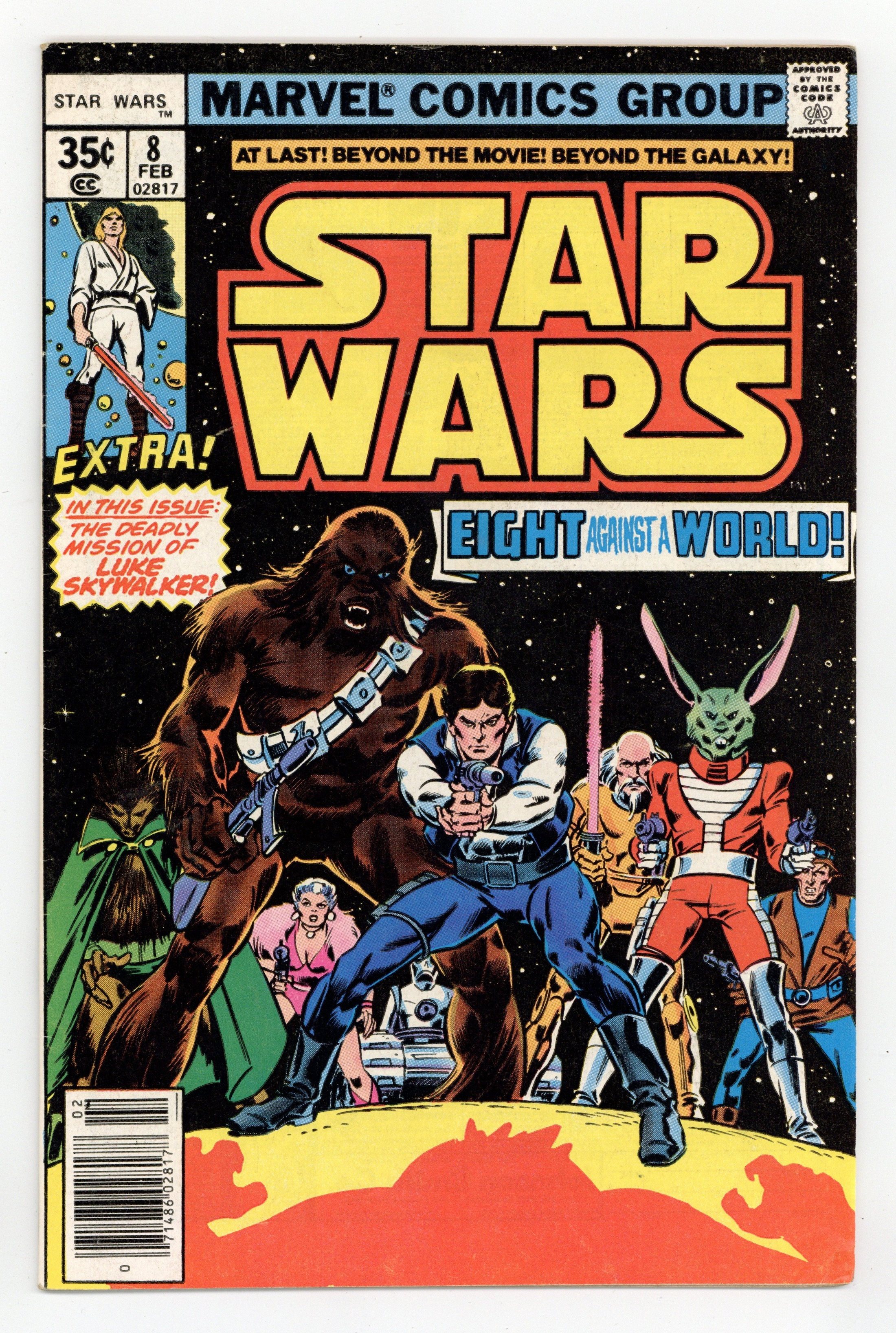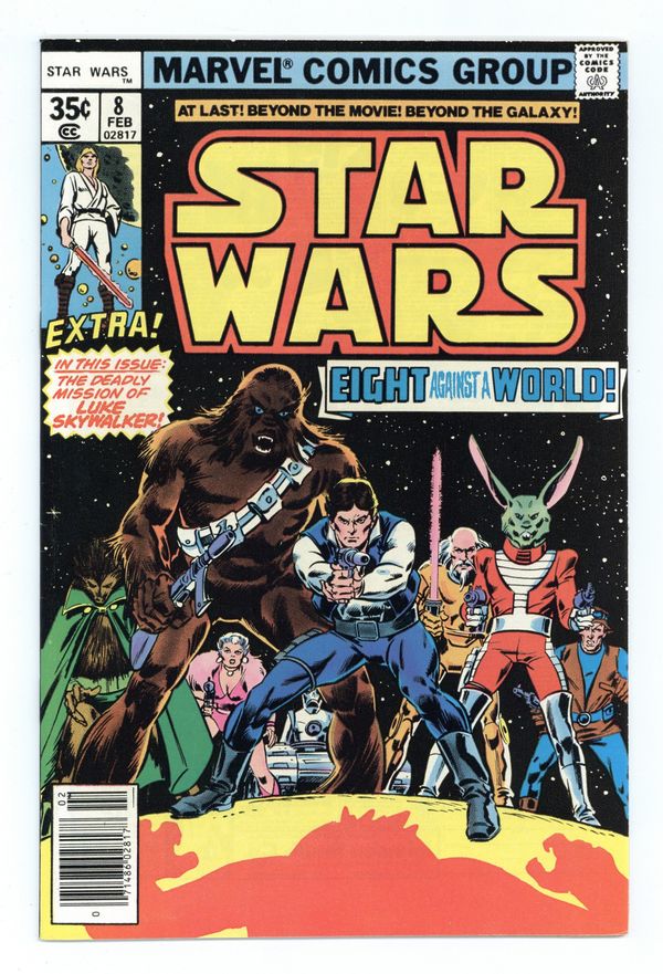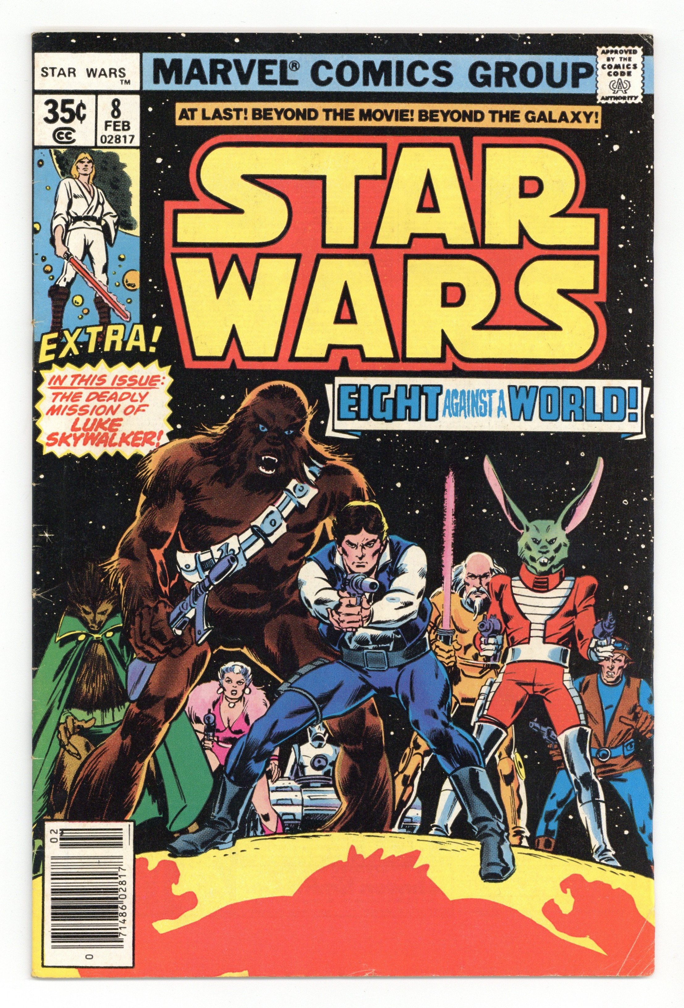 Pizzazz Variant, has centerfold subscription offer for "Pizzazz" Magazine. "Eight for Aduba-3!" Written by Roy Thomas. Art by Howard Chaykin and Tom Palmer. Han Solo and Chewbacca join forces with a motley band of misfits to embark on a dangerous adventure. Meanwhile, Luke Skywalker sets out on a dangerous mission of his own. Cover price $0.35.