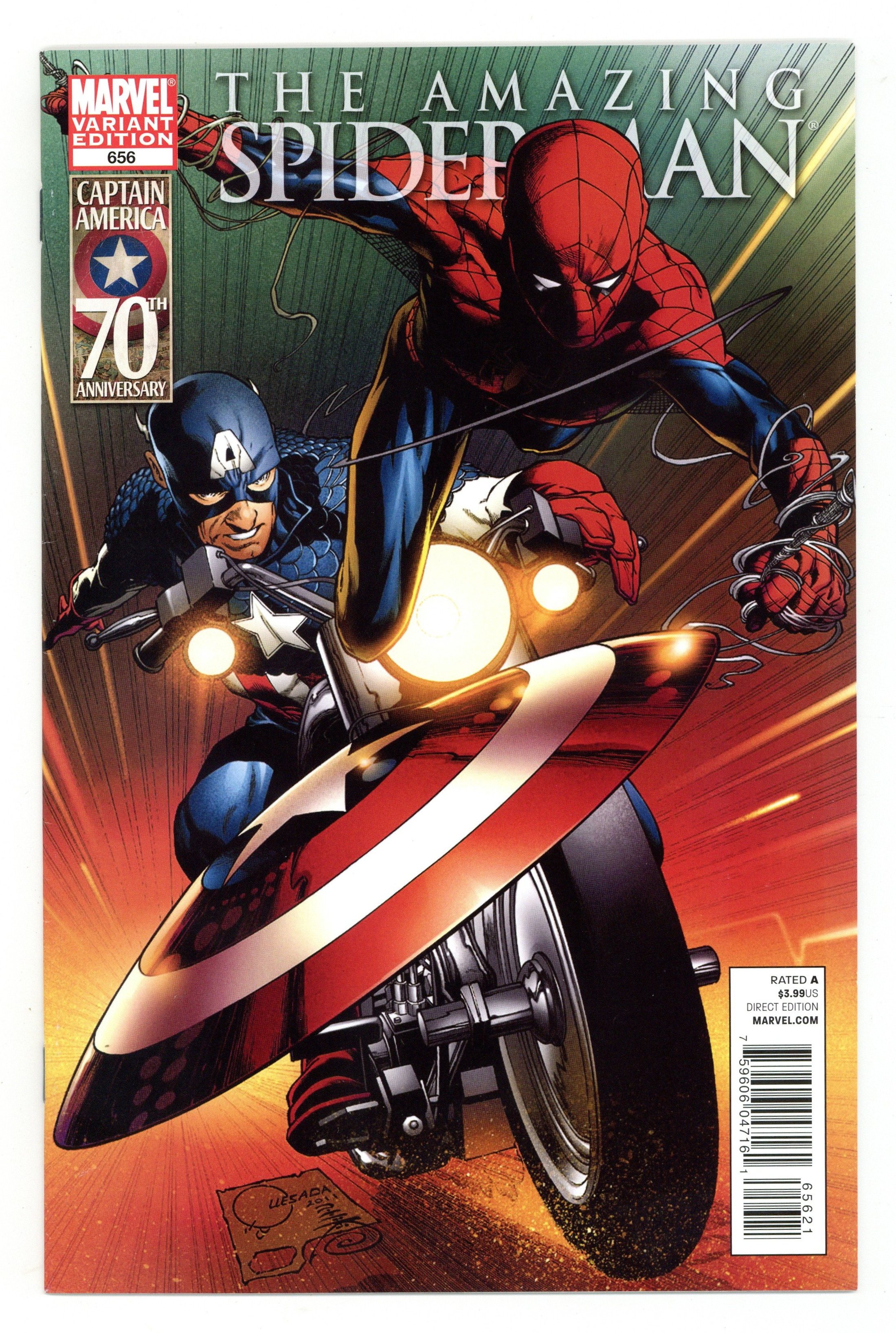 Captain America 70th Anniversary Variant Cover by JOE QUESADA No One Dies: Part 2 of 2 - Written by DAN SLOTT Art by MARCOS MARTIN. The debut of the NEW SPIDER-ARMOR! If Spider-Man hopes to find a way to defeat his new nemesis MASSACRE, he'll need the help of his all new, all-power costume! But will protecting the people of New York mean that Spider-Man finally takes the last measure-- killing a bloodthirsty madman when there are no other options? (by the way, your first answer is wrong!) 44 PGS./Rated A Cover price $3.99.