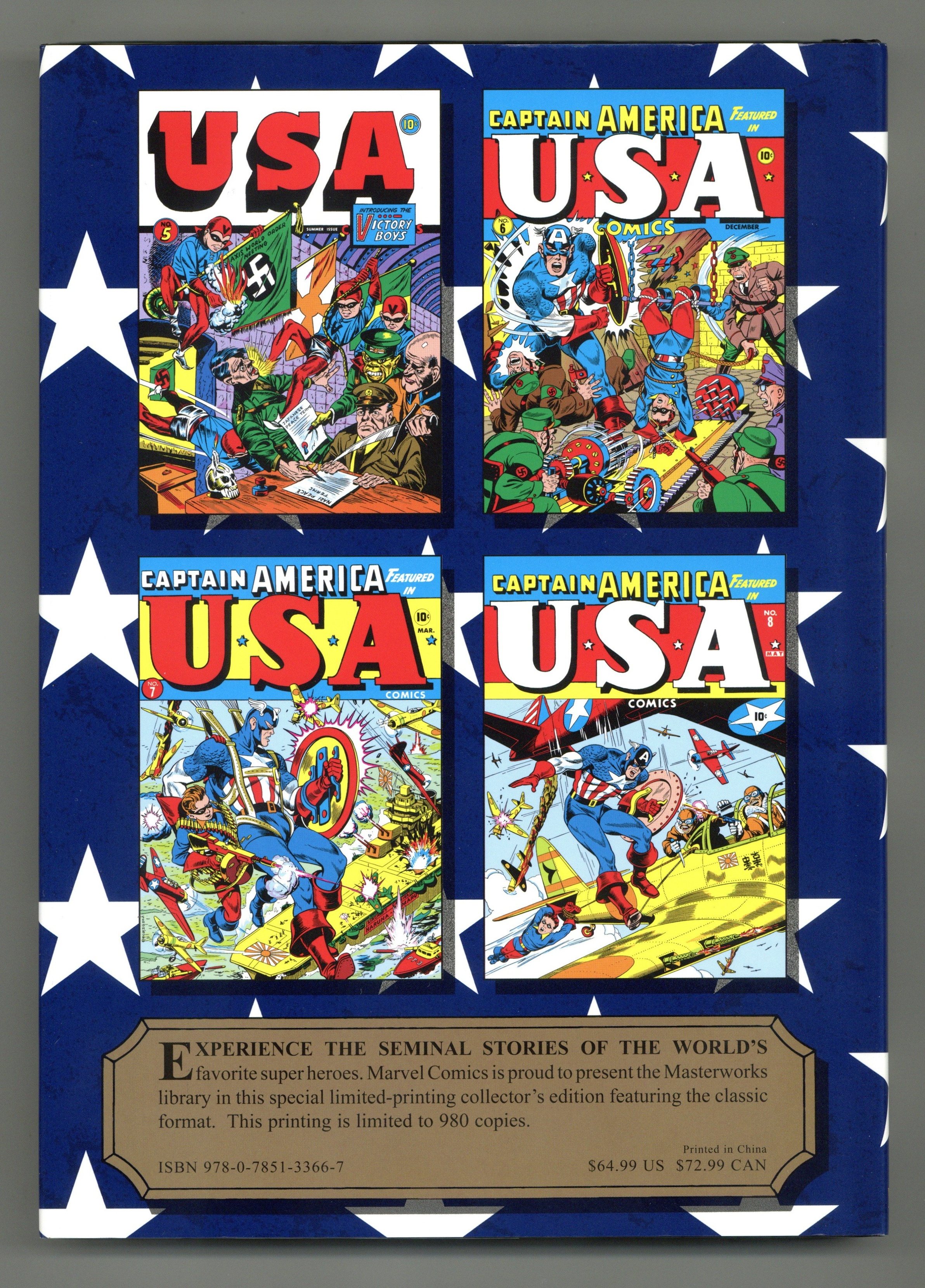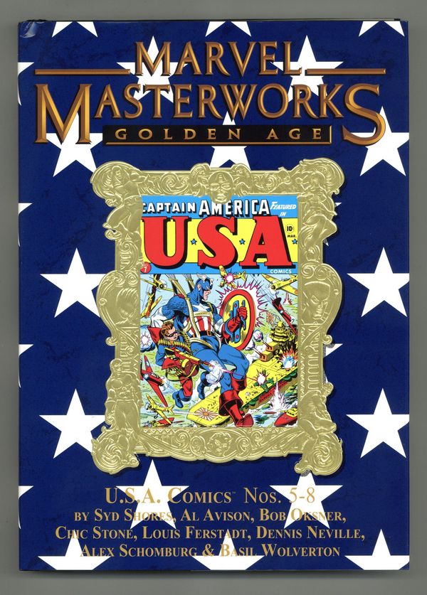 Volume 172 - 1st printing. "Golden Age USA Comics: Book 2!" Collects USA Comics (1941) #5-8. By SYD SHORES, VINCE ALASCIA, ALEX SCHOMBURG, MIKE SEKOWSKY, BASIL WOLVERTON, and CHIC STONE. Cover by ALEX SCHOMBURG. Hot on the heels of the explosion of star-spangled super heroes, U.S.A. COMICS presented a wild and wooly selection of patriotic characters fighting for the Red, White and Blue. From the Victory Boys and the American Avenger to wilder heroes like Roko the Amazing, the Blue Blaze and the Fighting Hobo, U.S.A. was a comics magazine bursting at the seams with crazy concepts. But with the Second World War raging, it became clear there was only one hero who could headline a book titled U.S.A.: Captain America! Backed up by the Destroyer, Marvel Boy and the Whizzer - as well as the adventures of regular joes like Sergeant Dix and Jeep Jones, and true tales of WWII - U.S.A. COMICS was the perfect dose of four-color excitement for the American G.I.! Sporting some of the most famous covers of comics' Golden Age, the early Captain America issues of U.S.A. are some of the rarest Marvel comics of all time, and they're collected here for the first time ever! Hardcover, 280 pages, full color. Cover price $64.99.